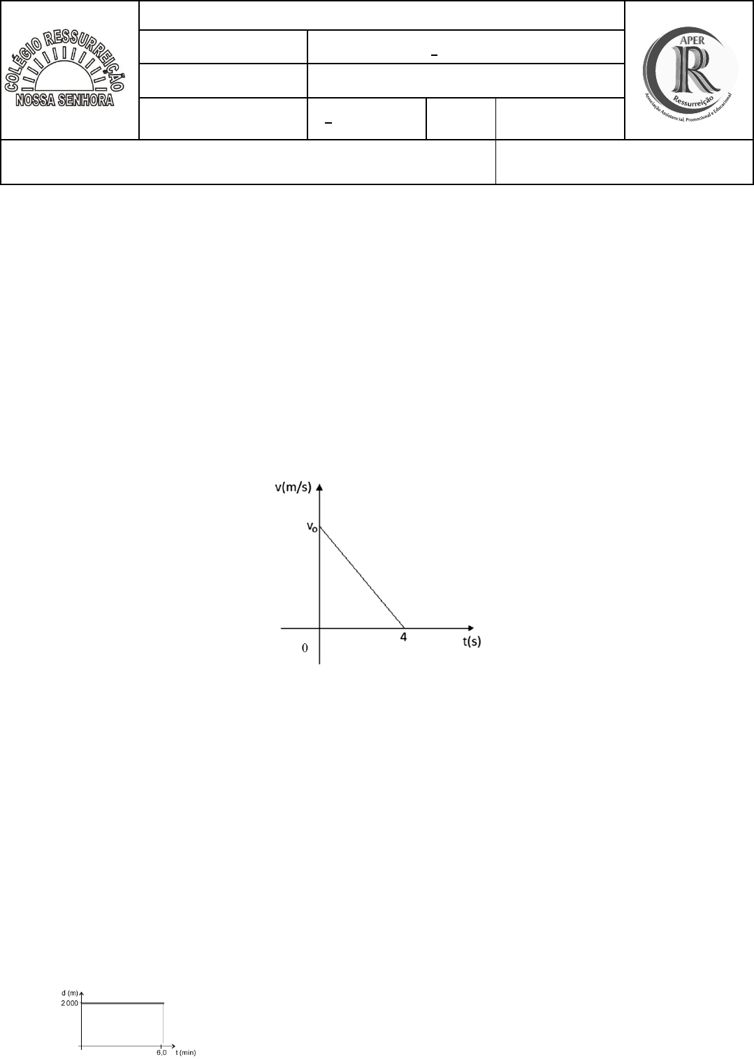 COLÉGIO RESSURREIÇÃO NOSSA SENHORA Data: Série/Turma: 1a série EM Disciplina: Física Professor(a): Bruno Felix Avaliação: Lista de exercícios Período: 1o. Bimestre Valor: Nota: Aluno(a): _______________________________________nº___ Vista de prova: _________________________ Questão 01) A demanda por trens de alta velocidade tem crescido em todo o mundo. Uma preocupação importante no projeto desses trens é o conforto dos passageiros durante a aceleração. Sendo assim, considere que, em uma viagem de trem de alta velocidade, a aceleração experimentada pelos passageiros foi limitada a amax = 0,09g, onde g=10 m/s2 é a aceleração da gravidade. Se o trem acelera a partir do repouso com aceleração constante igual a amax, a distância mínima percorrida pelo trem para atingir uma velocidade de 1080 km/h corresponde a a) 10 km. b) 20 km. c) 50 km. d) 100 km. Questão 02) O gráfico representa a variação da velocidade de um automóvel ao frear. Se nos 4 s da frenagem o automóvel deslocou 40 m, então a velocidade em que se encontrava no instante em que começou a desacelerar era de a) 72 km/h. b) 80 km/h. c) 90 km/h. d) 108 km/h. Questão 03) Nos Jogos Pan-americanos de 2011, em Guadalajara, México, o remador amazonense Aílson Eráclito da Silva compôs a equipe brasileira que competiu na prova Quatro Sem Timoneiro e que completou o percurso de 2 000 m em 6 min e 12 s. (http://info.guadalajara2011.org.mx) Considerando que, após a largada da prova, o barco da equipe brasileira, partindo do repouso, atingiu rapidamente a velocidade que manteve constante durante todo o percurso, o gráfico que representa esse movimento está representado em a) b) c) d) e) Questão 04) Um atleta, muito veloz, mantém em uma corrida de 100,0 m, uma aceleração constante de 5,00 m/s2 durante os 2,00 s iniciais e no percurso restante sua velocidade permanece constante. O tempo total para percorrer os 100,0 m é a) 12,0 s b) 14,0 s c) 11,0 s d) 13,0 s e) 15,0 s Questão 05) A velocidade é uma grandeza que relaciona a distância percorrida e o tempo gasto para percorrê-la. A aceleração é uma grandeza que mede a rapidez com que a velocidade varia. Mais rápido, mais lento, são percepções sensoriais. Tentamos medir com relógios tais variações e nos rebelamos, quando elas não concordam com a nossa percepção. Dizemos nunca com muita facilidade, dizemos sempre com muita facilidade, como se fôssemos fiéis a um momento. “Mas o outro já está olhando para o lado.” (LUFT, 2014) O que é constante e imutável num momento não será mais no momento seguinte. Uma velocidade, num momento, pode não ser a mesma num momento seguinte. Assinale a situação em que o móvel apresenta maior valor (positivo ou negativo) de aceleração: a) O móvel estava a 50 m/s e manteve essa velocidade durante 2,0 s. b) O móvel estava a 20 m/s e, em 10 s, aumentou a sua velocidade para 40 m/s. c) O móvel estava a 10 m/s e, em 2,0 s, diminuiu sua velocidade para zero. d) O móvel estava a 40 m/s e, em 10 s, diminuiu sua velocidade para zero. GABARITO: 1) Gab: C 2) Gab: A 3) Gab: B 4) Gab: C 5) Gab: C
