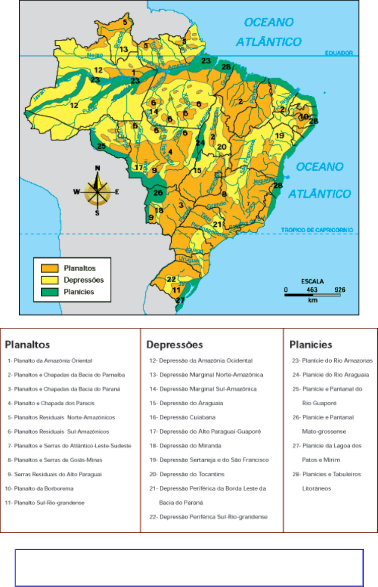 Relevo brasileiro O relevo do nosso país é composto de planaltos, depressões e planícies. � INCLUDEPICTURE "http://www.ibep-nacional.com.br/eaprender/BibliotecaIbep/1/sociais/imagens/f_soc23_1.gif" \* MERGEFORMATINET ��� Os planaltos mais extensos são: • os Planaltos e Chapadas da Bacia do Paraná (3) • os Planaltos e Serras do Atlântico Leste- Sudeste (7) • os Planaltos e Chapadas da Bacia do Parnaíba (2) • o Planalto e a Chapada dos Parecis (4) • os Planaltos e Serras de Goiás-Minas (8) As depressões mais extensas são: • a Depressão da Amazônia Ocidental (12) • a Depressão Sertaneja e do São Fran-cisco (19) • a Depressão Marginal Sul-Amazônica (14) • a Depressão Marginal Norte-Amazônica (13) • a Depressão do Araguaia (15) • a Depressão Periférica da Borda Leste da Bacia do Paraná (21) As planícies mais extensas são: • a Planície e Pantanal Mato- Grossense (26) • a Planície e Pantanal do Rio Guaporé (25) • as Planícies Litorâneas (28) • a Planície do Rio Amazonas (23) Os pontos culminantes do relevo brasileiro são: • Pico da Neblina, com 3.014 metros de altitude, localizado na Serra do Imeri, Estado do Amazonas. • Pico 31 de Março, com 2.992 metros, também situado na Serra do Imeri, no Amazonas, fronteira do Brasil com a Venezuela. • Pico da Bandeira, com 2.889 metros, na Serra do Caparaó, no Estado do Espírito Santo.