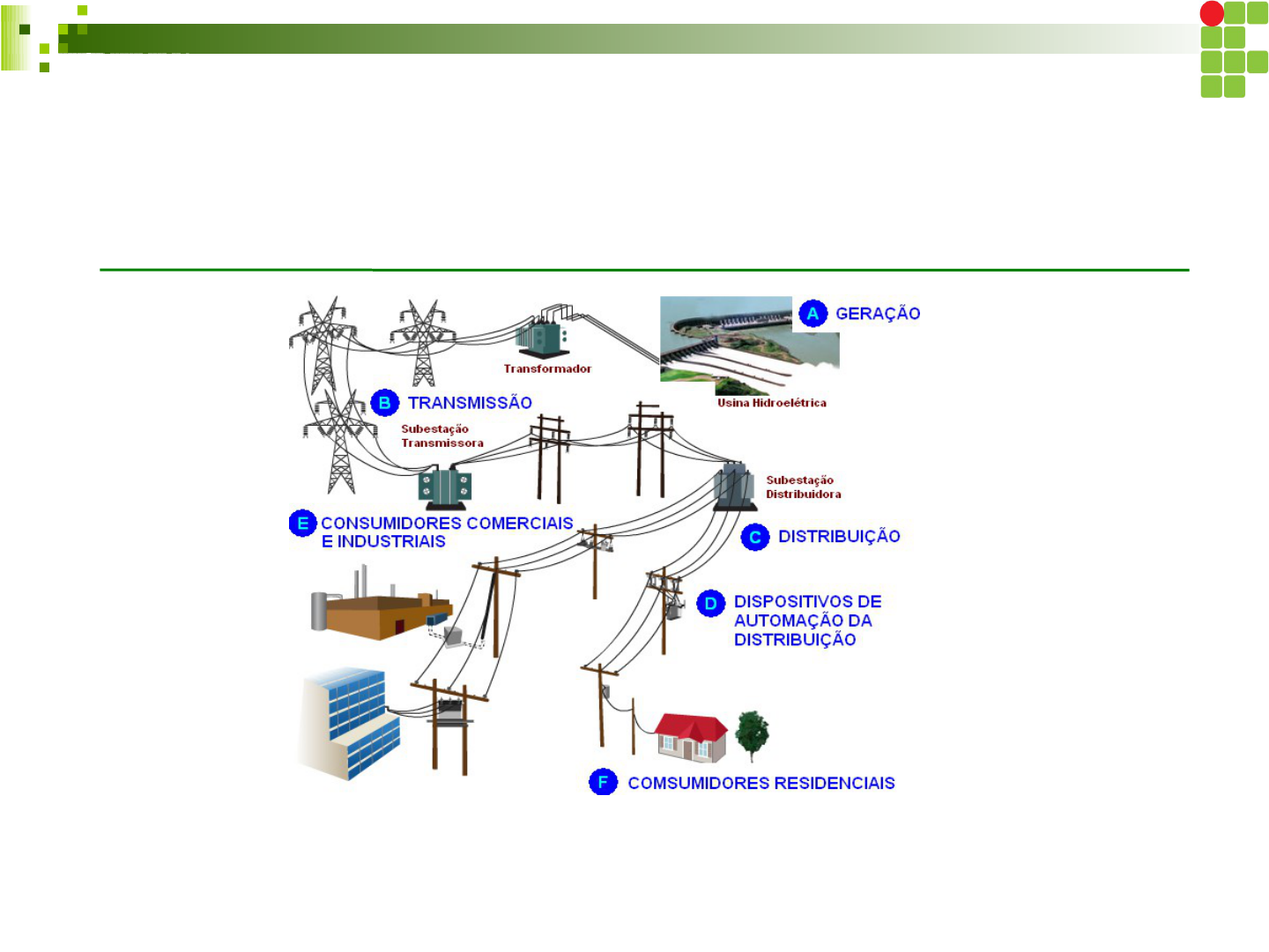 INSTALAÇÕES ELÉTRICA INDUSTRIAIS Curso de Tecnologia em Mecatrônica Prof. Cristian R. Duarte Prof. Cristian R. Duarte Sistema de Transmissão Após a geração da energia elétrica, a transmissão desta energia até os consumidores ocorre em várias etapas e de diversas formas. A transmissão da energia elétrica é feita em alta tensão e pode ser feita em linhas de CC e CA, sendo que a transmissão em CA é predominante. Prof. Cristian R. Duarte Sistema de Transmissão A transmissão em alta tensão é feita por motivos de economia, pois aumentando a tensão, a corrente diminui proporcionalmente. Com a diminuição da corrente a ser transportada, é possível utilizar condutores com menores seções e torres de sustentação menos reforçadas. O exemplo a seguir ilustra esta redução de corrente. Prof. Cristian R. Duarte Sistema de Transmissão No exemplo apresentado, uma corrente de 100kA solicitada do gerador, pode ser transportada com apenas 3kA. Prof. Cristian R. Duarte Sistema de Transmissão Os condutores que transportam a energia elétrica da usina até as subestações de distribuição normalmente são de alumínio, pois o alumínio é mais leve que o cobre, e desta forma é possível diminuir a força de tração nas torres. Prof. Cristian R. Duarte Sistema de Transmissão Prof. Cristian R. Duarte Sistema de Transmissão Prof. Cristian R. Duarte Sistema de Transmissão - Itaipu Prof. Cristian R. Duarte Fases da Energia Elétrica Geração, onde a energia é produzida. Transmissão, significa o transporte de energia elétrica gerada até os centros consumidores. Distribuição, é a parte do sistema elétrico já dentro dos centros de utilização (cidades, bairros, indústrias). Prof. Cristian R. Duarte Fornecimento de Energia Elétrica Prof. Cristian R. Duarte Fornecimento de Energia Elétrica Quem fornece energia às edificações é a concessionária, disponibilizando tensão elétrica através de ligações que podem ser classificadas, basicamente, como: Provisórias – ligações que serão substituídas posteriormente por ligações definitivas. São ligações para obras que estão em fase inicial de construção. Definitivas – ligações de caráter permanente. Podem ser em tensão secundária (residencial) ou tensão primária (industrial/residencial, predial/comercial). Prof. Cristian R. Duarte Fornecimento de Energia Elétrica Para se obter ligação definitiva, é necessário conhecer os regulamentos das concessionárias antes da execução dos serviços, pois, se em desacordo com suas prescrições normativas, elas podem não atender ao pedido de ligação. A ligação se dará por um ramal de ligação que compreende, basicamente,duas partes: uma externa, nos limites públicos (da rede na rua, até a entrada da propriedade); outra interna, nos limites privados, (dentro da propriedade, até o equipamento de medição). Prof. Cristian R. Duarte Fornecimento de Energia Elétrica Padrão – conjunto de componentes (quadro, pontalete, isolador, roldana, haste de aterramento, disjuntor, etc.) estrategicamente montados, onde a concessionária instala o aparelho medidor (relógio que acusará a energia consumida através do produto tensão × corrente elétrica × tempo), efetivando a ligação da rede elétrica pública com a residência. Prof. Cristian R. Duarte Fornecimento de Energia Elétrica Quadro geral de distribuição Prof. Cristian R. Duarte Toda concessionária classifica as ligações definindo tipos em função da carga instalada, da demanda e do tipo de rede local onde estiver situada a unidade consumidora. Prof. Cristian R. Duarte Exercícios 1) Por que a energia elétrica é transportada em alta tensão? 2) Descreva as fases de um sistema de transmissão completo. 3) Sabendo que um conjunto de casas consomem 100 MW de energia com tensão de 220V, calcule a corrente que irá circular na distribuição primária, na distribuição secundária e na linha de transmissão para fornecer esta energia às residências. Prof. Cristian R. Duarte Exercícios 3) Sabendo que um conjunto de casas consomem 100 MW de energia com tensão de 220V, calcule a corrente que irá circular na distribuição primária, na distribuição secundária e na linha de transmissão para fornecer esta energia às residências. Prof. Cristian R. Duarte Referência Bibliográfica SENAI – Curso de Eletricista de Manutenção – Apostila de Instalação Elétrica – Teoria. Cruz E. C. A. - Instalações Elétricas, Fundamentos, Práticas em Instalações e Comercio – Ed. Érica Elektro / Pirele – Instalações Elétricas Residenciais Helio Creder – Instalações Elétricas – Ed. LTC Otávio Markus - Circuitos Elétricos Corrente Contínua e Corrente Alternada - Editora Érica. Slide 1 Slide 2 Slide 3 Slide 4 Slide 5 Slide 6 Slide 7 Slide 8 Slide 9 Slide 10 Slide 11 Slide 12 Slide 13 Slide 14 Slide 15 Slide 16 Slide 17 Slide 18