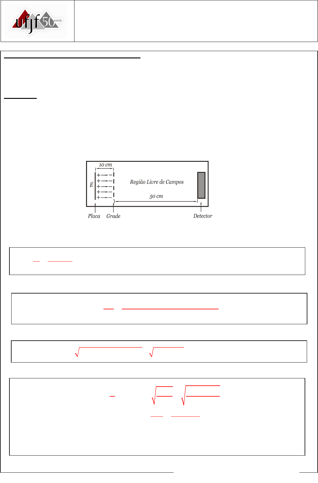 COMISSÃO PERMANENTE DE SELEÇÃO – COPESE PRÓ-REITORIA DE GRADUAÇÃO – PROGRAD PISM III- TRIÊNIO 2008 - 2010 PROVA DE FÍSICA PISM III - FÍSICA - Página 1 de 6 Na solução da prova, use quando necessário: Aceleração da gravidade g m s210 /= ;Velocidade da luz no vácuo c m/s83,0 10= × Permeabilidade magnética do vácuo 0= T m A 74 10 /µ pi −× × ; Carga do próton pq = C191,6 10−× Massa do próton pm = kg 271,60 10−× Questão 1: A figura abaixo mostra o esquema de um equipamento usado para determinar massas moleculares denominado de Espectrômetro por Tempo de Voo. Esse equipamento possui uma placa onde a amostra é injetada e ionizada para formar íons positivos que são acelerados por um campo elétrico, uniforme, mantido entre a placa e a grade, que estão separadas por uma distância d cm10= , como mostra a figura. Em seguida, penetram em uma região sem campo elétrico e deslocam-se com velocidade constante até atingir o detector, colocado a uma distância D cm50= , como indica a figura. O tempo entre o acionamento do campo elétrico e a detecção do íon é medido e a massa é determinada em função desse tempo. Despreze efeitos do campo gravitacional da Terra e calcule: a) o valor do campo elétrico quando se aplica uma diferença de potencial V V1250= entre a placa e a grade. V V E N C d m 1250 12500 / 0,1 = = = b) a aceleração de um íon H + no trecho entre a placa e a grade. qE C N C F qE qE ma a m s m kg 19 4 12 2 27 1,60 10 1,25 10 / 1,25 10 / 1,60 10 − − × × × = ⇒ = ⇒ = = = × × c) a velocidade do íon H + quando esse alcança a grade. v a x v = = m s2 12 1 11 512 2 1,25 10 10 2,5 10 5,0 10 /−= ∆ ⇒ = × × × × × d) O tempo total de voo, entre a placa e o detector. 1o Trecho (placa-grade): xx at t s a 1 2 61 1 1 1 12 21 2 10 0,4 10 2 1,25 10 − − ∆ ×∆ = ⇒ = = = × × 2o Trecho (grade-detector): xx vt t s v 62 2 2 2 5 0,5 1,0 10 5,0 10 − ∆∆ = ⇒ = = = × × Tempo total: t t t s6 6 61 2 0,4 10 1,0 10 1,4 10− − −= + = × + × = × COMISSÃO PERMANENTE DE SELEÇÃO – COPESE PRÓ-REITORIA DE GRADUAÇÃO – PROGRAD PISM III- TRIÊNIO 2008 - 2010 PROVA DE FÍSICA PISM III - FÍSICA - Página 2 de 6 Questão 2: A curva característica de um dispositivo elétrico é o gráfico que descreve o comportamento da diferença de potencial do dispositivo em função da corrente elétrica que o atravessa. A figura (I) mostra as curvas características de uma bateria (V riε= − ) e de um resistor ôhmico R em função da corrente i . Esses dois dispositivos são utilizados no circuito da figura (II). A partir desses gráficos, calcule: a) a força eletromotriz da bateria. Tomando i 0= na curva da bateria, obtém-se: V V20ε= = b) o valor da resistência interna r da bateria e o valor da resistência R do resistor. Tomando V 0= na curva da bateria, obtém-se: r r 200 10 2,0 10 ε= − ⇒ = = Ω Tomando V V25= e i A10= na curva do resistor, obtém-se: V R i 25 2,5 10 = = = Ω c) a intensidade da corrente elétrica mantida no circuito. Da lei das malhas: ( ) ( )R r i i i A20 2,5 2,0 4,4ε = + ⇒ = + ⇒ ≃ COMISSÃO PERMANENTE DE SELEÇÃO – COPESE PRÓ-REITORIA DE GRADUAÇÃO – PROGRAD PISM III- TRIÊNIO 2008 - 2010 PROVA DE FÍSICA PISM III - FÍSICA - Página 3 de 6 Questão 3: Um fio condutor, retilíneo e longo, é colocado no plano que contém uma pequena espira circular de área A cm21,0= , conforme mostrado na figura (I). O fio é percorrido por uma corrente elétrica i , cuja variação em função do tempo é mostrada na figura (II). O valor da distância r m1,0= entre a espira e o fio é suficientemente grande para que se possa admitir que o campo magnético B � seja constante e perpendicular à área A da espira. a) A partir do gráfico (II), calcule a frequência da corrente elétrica induzida que percorre a espira. T s ns92,0 10 2,0−= × = ; f Hz MHz T s 9 9 1 1 0,5 10 500 2,0 10− = = = × = × b) Calcule os valores máximo e mínimo da força eletromotriz ε induzida nos terminais da espira. A cm m2 4 21,0 10−= = B i BA BA A i i r 7 0 4 110 4 10cos0 10 2,0 10 2 2 1,0 µ piφ pi pi − − − × = = = = × = × × ; B i t t 112,0 10φε −∆ ∆= − = − × ∆ ∆ maxε ocorre para i A2,0∆ = − e t s91,0 10−∆ = × ; minε ocorre para i A2,0∆ = + e t s91,0 10−∆ = × Assim, A V mV s 11 2 max 9 2,02,0 10 4,0 10 40 1,0 10 ε − − − − = − × × = + × = + × A V mV s 11 2 min 9 2,02,0 10 4,0 10 40 1,0 10 ε − − − + = − × × = − × = − × COMISSÃO PERMANENTE DE SELEÇÃO – COPESE PRÓ-REITORIA DE GRADUAÇÃO – PROGRAD PISM III- TRIÊNIO 2008 - 2010 PROVA DE FÍSICA PISM III - FÍSICA - Página 4 de 6 c) Use os resultados obtidos no item (b) para fazer um gráfico, devidamente justificado, da força eletromotriz ε induzida nos terminais da espira em função do tempo. Questão 4: Um bloco de massa m kg2,0= , preso à extremidade de uma mola e apoiado sobre uma superfície horizontal sem atrito, oscila em torno da posição de equilíbrio com uma amplitude A m0,05= , como mostra a figura (I). A figura (II) mostra como a energia potencial pE kx 21 2 = varia com a posição x do bloco. a) Faça um gráfico, devidamente justificado, que mostre como a energia cinética cE mv212= varia com a posição x do bloco. Da conservação de energia, ( ) c p c c E E E E kA kx E k A x 2 2 2 2 1 1 2 2 1 2 + = ⇒ = − ⇒ = − O gráfico ao lado mostra como cE varia com x . COMISSÃO PERMANENTE DE SELEÇÃO – COPESE PRÓ-REITORIA DE GRADUAÇÃO – PROGRAD PISM III- TRIÊNIO 2008 - 2010 PROVA DE FÍSICA PISM III - FÍSICA - Página 5 de 6 b) Calcule o módulo da velocidade do bloco quando ele passa pela posição de equilíbrio. Para x 0= , cE E J mv v m s2 1100 100 10 / 2 = = ⇒ = ⇒ = c) Calcule o módulo da força que a mola exerce sobre o bloco quando ele está na posição x A m0,05= = . Para x A m25,0 10−= = × , ( )E kA k k N m22 2 41 1100 5,0 10 8,0 10