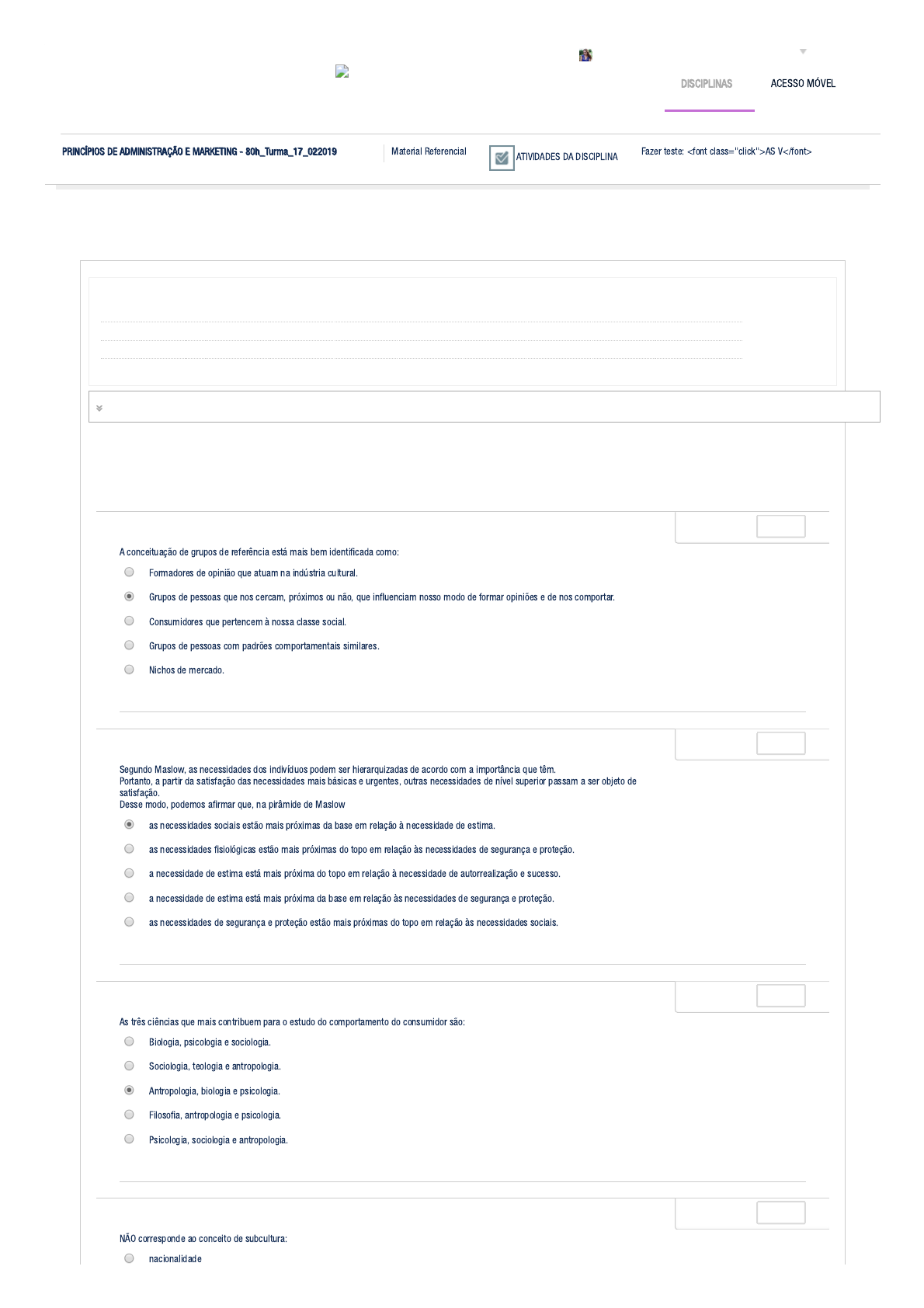 19/02/2019 Fazer teste: <font class="click">AS V</font> – ... https://bb.cruzeirodosulvirtual.com.br/webapps/assessment/take/launch.jsp?course_assessment_id=_268268_1&course_id=_562977_1&content… 1/2 PRINCÍPIOS DE ADMINISTRAÇÃO E MARKETING - 80h_Turma_17_022019PRINCÍPIOS DE ADMINISTRAÇÃO E MARKETING - 80h_Turma_17_022019 Material Referencial ATIVIDADES DA DISCIPLINA Fazer teste: <font class="click">AS V</font> Fazer teste: AS V Informações do teste Descrição Instruções Várias tentativas Este teste permite 3 tentativas. Esta é a tentativa número 1. Forçar conclusão Uma vez iniciado, este Teste deve ser concluído em uma sessão. Não saia do teste antes de clicar em Salvar e enviar. a. b. c. d. e. PERGUNTA 1 A conceituação de grupos de referência está mais bem identificada como: Formadores de opinião que atuam na indústria cultural. Grupos de pessoas que nos cercam, próximos ou não, que influenciam nosso modo de formar opiniões e de nos comportar. Consumidores que pertencem à nossa classe social. Grupos de pessoas com padrões comportamentais similares. Nichos de mercado. 0,175 pontos Salva a. b. c. d. e. PERGUNTA 2 Segundo Maslow, as necessidades dos indivíduos podem ser hierarquizadas de acordo com a importância que têm. Portanto, a partir da satisfação das necessidades mais básicas e urgentes, outras necessidades de nível superior passam a ser objeto de satisfação. Desse modo, podemos afirmar que, na pirâmide de Maslow as necessidades sociais estão mais próximas da base em relação à necessidade de estima. as necessidades fisiológicas estão mais próximas do topo em relação às necessidades de segurança e proteção. a necessidade de estima está mais próxima do topo em relação à necessidade de autorrealização e sucesso. a necessidade de estima está mais próxima da base em relação às necessidades de segurança e proteção. as necessidades de segurança e proteção estão mais próximas do topo em relação às necessidades sociais. 0,175 pontos Salva a. b. c. d. e. PERGUNTA 3 As três ciências que mais contribuem para o estudo do comportamento do consumidor são: Biologia, psicologia e sociologia. Sociologia, teologia e antropologia. Antropologia, biologia e psicologia. Filosofia, antropologia e psicologia. Psicologia, sociologia e antropologia. 0,175 pontos Salva a. PERGUNTA 4 NÃO corresponde ao conceito de subcultura: nacionalidade 0,175 pontos Salva ? Estado de Conclusão da Pergunta: DISCIPLINASDISCIPLINAS ACESSO MÓVEL Andrea Rocha Medeiros de Oliveira CRU... 4 Blackboard Learn 19/02/2019 Fazer teste: <font class="click">AS V</font> – ... https://bb.cruzeirodosulvirtual.com.br/webapps/assessment/take/launch.jsp?course_assessment_id=_268268_1&course_id=_562977_1&content… 2/2 Clique em Salvar e Enviar para salvar e enviar. Clique em Salvar todas as respostas para salvar todas as respostas. b. c. d. e. atividade profissional religião regiões geográficas grupos raciais Salvar todas as respostas Salvar e Enviar