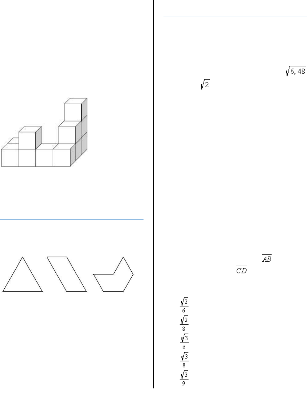 COMISSÃO DE VESTIBULANDOS 1 | http://comissaovestibulandos.blogspot.com.br/ Exercícios de Geometria Espacial. Poliedros regulares. QUESTÃO 1 Onze cubinhos, todos de mesma aresta, foram colados, conforme a figura a seguir. O menor número de cubinhos, iguais aos já utilizados, que devem ser agregados ao sólido formado pelos onze cubinhos, para obtermos um cubo maciço, é igual a: A) 48 B) 49 C) 52 D) 53 E) 56 QUESTÃO 2 Os três polígonos a seguir podem ser divididos em triângulos equiláteros. Podemos afirmar que: 0-0) Todas as três figuras resultam da planificação de um tetraedro regular. 1-1) Todas as três figuras possuem eixo de simetria. 2-2) Todas as três figuras possuem centro de simetria. 3-3) Cada uma delas, repetindo-se por translações e rotações, preenche todo o espaço bidimensional, formando uma malha plana. 4-4) As três figuras têm a mesma área e o mesmo perímetro. QUESTÃO 3 Para se fazer uma previsão sobre a geometria das moléculas, podem-se utilizar várias teorias. Considerando a molécula SF6, em que a menor distância entre os átomos de flúor mede aproximadamente 1,8 Å e considerando que = 2,54 e que =1,4 , assinale o que for correto. 01) Nessa molécula, o átomo de enxofre obedece à regra do octeto. 02) A forma espacial que representa a molécula SF6 é a de um octaedro regular. 04) A distância do átomo de enxofre a qualquer átomo de flúor nessa molécula mede aproximadamente 1,7 Å. 08) Desconsiderando as dimensões dos átomos na molécula, a área total da superfície do SF6 mede mais do que 10 Å 2 . 16) Desconsiderando as dimensões dos átomos na molécula, o volume da forma espacial do SF6 mede menos do que 4 Å 3 . QUESTÃO 4 Sejam A, B, C e D os vértices de um tetraedro regular cujas arestas medem 1 cm. Se M é o ponto médio do segmento e N é o ponto médio do segmento , então a área do triângulo M N D, em cm 2 , é igual a A ( ) . B ( ) . C ( ) . D ( ) . E ( ) . COMISSÃO DE VESTIBULANDOS 2 | http://comissaovestibulandos.blogspot.com.br/ QUESTÃO 5 Na figura abaixo, representando um cubo H, destaca-se o quadrilátero sombreado ABCD. Sabendo-se que o volume de H é igual a 8 cm 3 , então o perímetro de ABCD é igual a A) B) C) D) QUESTÃO 6 Na ilustração a seguir, temos um octaedro regular com área total da superfície . Indique o volume do octaedro, em cm 3 . QUESTÃO 7 No cubo ABCDEFGH considere o ponto P na aresta AE satisfazendo . Sabendo que mede cm, calcule o volume do cubo. QUESTÃO 8 A base do tetraedro PABCD é o quadrado ABCD de lado l contido no plano α. Sabe-se que a projeção ortogonal do vértice P no plano α está no semiplano de α determinado pela reta e que não contém o lado . Além disso, a face BPC é um triângulo isósceles de base cuja altura forma, com o plano α, um ângulo θ, em que 0 < θ < . Sendo = , determine, em função de l e θ, a) o volume do tetraedro PABCD; b) a altura do triângulo APB relativa ao lado ; c) a altura do triângulo APD relativa ao lado . QUESTÃO 9 A pele é o maior órgão de seu corpo, com uma superfície de até 2 metros quadrados. Ela tem duas COMISSÃO DE VESTIBULANDOS 3 | http://comissaovestibulandos.blogspot.com.br/ camadas principais: a epiderme, externa, e a derme, interna. BREWER, Sarah. Viva mais e viva bem. Rio de Janeiro: Ediouro, v. 1, 2013. p. 72. Adaptado. De acordo com o texto, a superfície máxima coberta pela pele humana é equivalente a de um cubo cuja diagonal, em m, é igual a 01) 02) 03) 04) 1 05) QUESTÃO 10 Assinale a(s) proposição(ões) correta(s). 01. Considere um octaedro regular inscrito em uma esfera de raio 6 cm. O volume do octaedro é 288 cm 3 . 02. Na figura a seguir, ABCD é um quadrilátero e o segmento DB é paralelo ao segmento CE. Então a área do quadrilátero ABCD é igual à área do triângulo ADE. 04. Na figura a seguir, o triângulo ABC é retângulo e o ponto M é o ponto médio da hipotenusa AC. A perpendicular à hipotenusa AC pelo ponto M cruza o segmento BC no ponto E, que está entre B e C. Então a área do triângulo MEC é menor do que a metade da área do triângulo ABC. 08. Na figura a seguir, o triângulo ABC é equilátero e o quadrilátero MNPQ é um quadrado. Então os pontos P e Q são pontos médios dos lados BC e AC, respectivamente. 16. Se em um quadrilátero as diagonais são COMISSÃO DE VESTIBULANDOS 4 | http://comissaovestibulandos.blogspot.com.br/ bissetrizes dos ângulos internos, então o quadrilátero é um losango. QUESTÃO 11 Assinale a(s) proposição(ões) correta(s). 01. Uma conhecida marca de chocolate utiliza como embalagem um prisma regular de base triangular cuja aresta da base mede 3,5 cm. Se sua altura tem o dobro do perímetro da base, então sua área lateral é igual a 220,5 cm 2 . 02. Seja . Então existem exatamente dois valores reais x tais que . 04. Dadas as matrizes , então a matriz D = A · B não admite inversa. 08. A equação log2 (cos x) = 1 tem exatamente duas soluções no intervalo [0, 2π]. 16. . 32. Sabemos que aplicando um capital C0 após n meses a uma taxa i, obtemos o valor a ser resgatado Cf através da seguinte equação Cf = C0 (1 + i) n . Dessa forma, uma pessoa que aplica um capital de R$10.000,00 a uma taxa de 1% ao mês durante três meses deve resgatar um valor igual a R$ 10.303,01. 64. Quatro cidades, A, B, C, D, estão localizadas nos vértices de um quadrado. As linhas nas figuras 1 e 2 são dois caminhos que interligam as quatro cidades. O ângulo mede 120° e os segmentos AQ, BQ, CP e DP têm a mesma medida. Então o comprimento do caminho na figura 1 é menor do que o comprimento do caminho na figura 2. QUESTÃO 12 Calcule o volume de um tetraedro regular cujos vértices foram escolhidos dentre os vértices de um cubo de 1m 3 de volume. QUESTÃO 13 Na figura, ABCDEFGH é um paralelepípedo reto- retângulo, e PQRE é um tetraedro regular de lado 6 cm, conforme indica a figura. Sabe-se ainda que: • P e R pertencem, respectivamente, às 