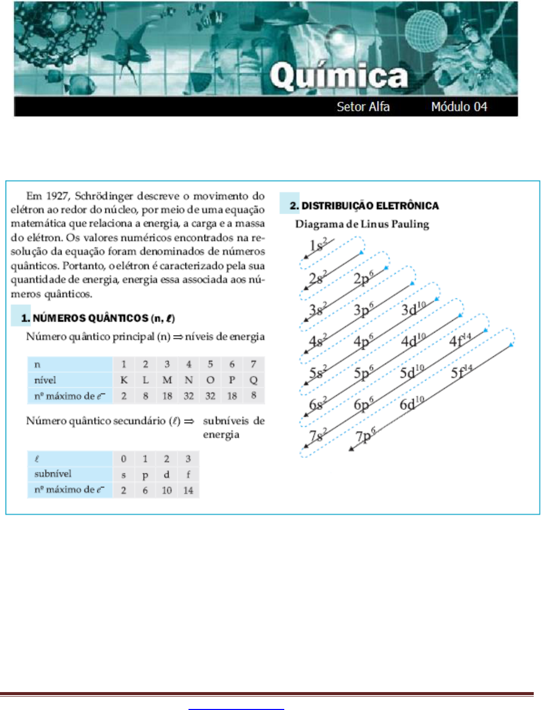 Portal de Estudos em Química (PEQ) – www.profpc.com.br Página 1 MODELO ATÔMICO ATUAL Portal de Estudos em Química (PEQ) – www.profpc.com.br Página 2 EXERCÍCIOS DE APLICAÇÃO 01 (CESGRANRIO-RJ) A distribuição eletrônica do átomo 56 26Fe , em camadas é: a) 1s2 2s2 2p6 3s2 3p6 4s2 3d6 b) 1s2 2s2 2p6 3s2 3p6 4s2 3d10 4p6 5s2 4d10 5p6 6s2 c) K - 2 L - 8 M - 16 d) K - 2 L - 8 M - 14 N - 2 e) K - 2 L - 8 M - 18 N - 18 O - 8 P - 2 02 (UFAL-AL) Dentre os seguintes elementos, qual apresenta 16 elétrons no terceiro nível energético? (Dados: números atômicos S = 16, Ni = 28, Zn = 30, Br = 35, Zr = 40.) a) S b) Ni c) Zn d) Br e) Zr 03 (OSEC-SP) Sendo o subnível 4s1 (com um elétron) o mais energético de um átomo podemos afirmar que: I. O número total de elétrons deste átomo é igual a 19. II. Este átomo apresenta 4 camadas eletrônicas. III. Sua configuração eletrônica é 1s2 2s2 2p6 3s2 3d10 4s1 a) apenas a afirmação I é correta. b) apenas a afirmação II é correta. c) apenas a afirmação III é correta. d) as afirmações I e II são corretas. e) as afirmações II e III são corretas. 04 (UFRGS-RS) Assinale a alternativa que apresenta corretamente os símbolos das espécies que possuem, respectivamente, as seguintes configurações eletrônicas: I. [Ar] 4s2 3d10 4p4 II. [Ar] 4s1 3d10 III. [Ne] 3s2 3p5 Dados: Números atômicos: Ne (Z = 10), Cℓ (Z = 17), Ar (Z = 18), Cu (Z = 29), Zn (Z = 30), As (Z = 33), Se (Z = 34) a) Se, Zn, Cℓ b) Se, Cu, Cℓ c) As–, Zn, Cℓ d) As, Cu+, Cℓ– e) As, Zn2+, Cℓ– Portal de Estudos em Química (PEQ) – www.profpc.com.br Página 3 05 (UEL-PR) Considere as afirmações a seguir: I. O elemento químico de número atômico 30 tem 3 elétrons de valência. II. Na configuração eletrônica do elemento químico com número atômico 26 há 6 elétrons no subnível 3d. III. 3s2 3p3 corresponde à configuração eletrônica dos elétrons de valência do elemento químico de número atômico 35. IV. Na configuração eletrônica do elemento químico de número atômico 21 há 4 níveis energéticos. Estão corretas, somente: a) I e II b) I e III c) II e III d) II e IV e) III e IV 06 (UEL-PR) Dentre os números atômicos 23, 31, 34, 38, 54, os que correspondem a elementos químicos com dois elétrons de valência são: a) 23 e 38 b) 31 e 34 c) 31 e 38 d) 34 e 54 e) 38 e 54 07 (UFSC-SC) Em relação à configuração eletrônica nos níveis e subníveis dos átomos, analise as seguintes afirmativas: I) Quanto mais distanciado do núcleo se encontrar o elétron, maior será o seu conteúdo energético. II) A terceira e quarta camadas admitem, no máximo, 18 elétrons e 32 elétrons, respectivamente. III) A primeira camada é a menos energética e pode ter, no máximo, 8 elétrons. Está(ão) correta(s), pelo modelo atual, a) I apenas. b) II apenas. c) III apenas. d) I e II apenas. e) II e III apenas. 08 (FEP-PA) A ordem crescente de energia dos subníveis eletrônicos pode ser determinada pela soma do nº quântico principal (n) ao nº quântico secundário ou azimutal (l). Se a soma for a mesma, terá maior energia o mais afastado do núcleo (> n). Colocar em ordem crescente de energia os subníveis eletrônicos: 4d 4f 5p 6s a) 4d < 4f < 5p < 6s b) 4f < 4d < 5p < 6s c) 4d < 5p < 6s < 4f d) 5p < 6s < 4f < 4d e) 6s < 5p < 4d < 4f Portal de Estudos em Química (PEQ) – www.profpc.com.br Página 4 09 (UFMG-MG) Os nomes abaixo estão relacionados diretamente com o modelo atômico atual (Orbital), exceto: a) De Broglie b) Thomson c) Heisenberg d) Schrödinger 10 (UFPA-PA) O modelo probabilístico utilizado para o problema velocidade -posição do elétron é uma consequência do princípio de: a) Bohr b) Aufbau c) De Broglie d) Heisenberg e) Pauling 11 (FEI-SP) Entre os subníveis 6p e 7s, qual deles possui maior energia? Justifique utilizando valores dos números quânticos (principal e secundário). 12 (UnB-DF) O entendimento da estrutura dos átomos não é importante apenas para satisfazer à curiosidade dos cientistas: possibilita a produção de novas tecnologias. Um exemplo disso é a descoberta dos raios catódicos, feita pelo físico William Crookes, enquanto estudava as propriedades da eletricidade. Tal descoberta, além de ter contribuído para um melhor entendimento a respeito da constituição da matéria, deu origem aos tubos de imagem de televisores e dos monitores dos computadores. Alguns grandes cientistas que contribuíram para o entendimento da estrutura do átomo foram: Bohr (1885- 1962), Dalton (1766-1844), Rutherford (1871-1937) e Linus Pauling (1901-1994). Com relação à estrutura da matéria, julgue os itens seguintes (Verdadeiro ou Falso): (0) Ao passar entre duas placas eletricamente carregadas, uma positivamente e outra negativamente, as partículas alfa desviam-se para o lado da placa negativa. (1) O átomo é a menor partícula que constitui a matéria. (2) Cada tipo de elemento químico é caracterizado por um determinado número de massa. (3) O modelo atômico que representa o comportamento do elétron na forma orbital é o de Rutherford-Bohr. 13 (UFMG-MG) De um modo geral, os sucessivos modelos atômicos têm algumas características comuns entre si. Com base na comparação do modelo atual com outros, a afirmativa correta é: a) no modelo de Dalton e no atual, cada átomo é indivisível. b) no modelo de Rutherford e no atual, cada átomo tem um núcleo. c) no modelo de Rutherford e no atual, os elétrons têm energia quantizada. d) no modelo de Bohr e no atual, os elétrons giram em órbitas circulares ou elípticas. e) no modelo de Dalton e no atual, as propriedades atômicas dependem do número de prótons. 14 (UFMG-MG) Considere os níveis de energia e as excitações que podem ocorrer com o elétron mais externo do átomo de lítio. O número máximo de linhas de absorção é a) 5. b) 6. c) 9. d) 10. e) 14. 15 (FESP-SP) O número máximo de elétrons em cada camada (nível) pode ser calculado