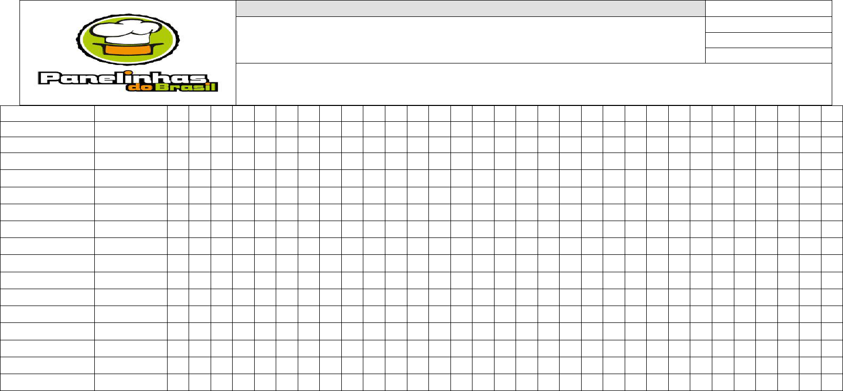 [Digite texto] Planilha 6 Código: Controle de Higienização diária Página: 1 / 1 Mês: ANO: EQUIPAMENTOS FREQUENCIA 1 2 3 4 5 6 7 8 9 10 11 12 13 14 15 16 17 18 19 20 21 22 23 24 25 26 27 28 29 30 31 Make line quente DIÁRIO Make line frio DIÁRIO Expremedor de suco DIÁRIO Piso DIÁRIO Microondas DIÁRIO Omeleteira DIÁRIO Lixeira DIÁRIO Post mix DIÁRIO Chopeira DIÁRIO Refresqueira DIÁRIO Mesas de apoio DIÁRIO Parede altura da bancada DIÁRIO Fogão DIÁRIO