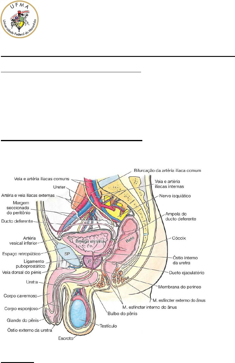 ROTEIRO DE ESTUDO Romário Pereira - UFMA Sistemas Orgânicos Integrados III Medicina ASECTOS MORFOFUNCIONAIS DO SISTEMA REPRODUTOR MASCULINO Sistema Reprodutor Masculino - Morfofuncional Descreva a localização e as partes que compõem os órgãos genitais masculinos internos e externos. Descreva a vascularização, drenagem linfática e inervação dos órgãos genitais masculinos externos e externos. Fonte: Fundamentos de Anatomia Clínica de Moore, 2017 Órgãos genitais masculinos internos (p. 446) Os órgãos genitais masculinos internos incluem testículos, epidídimos, ductos deferentes, glândulas seminais, ductos ejaculatórios, próstata e glândulas bulbouretrais. Testículos Os testículos ovoides ficam suspensos no escroto por meio dos funículos espermáticos. Produzem espermatozoides e hormônios, principalmente testosterona. Os espermatozoides são formados nos túbulos seminíferos contorcidos que são unidos pelos túbulos seminíferos retos à rede do testículo. Os testículos têm uma face externa resistente, a túnica albugínea, que forma uma crista na face posterior interna como mediastino do testículo. A túnica vaginal é um saco peritoneal fechado que envolve o testículo. A superfície de cada testículo é coberta pela lâmina visceral da túnica vaginal, que está bem aderida ao testículo, ao epidídimo e à parte inferior do ducto deferente. A lâmina parietal da túnica vaginal é mais extensa do que a lâmina visceral e estende-se superiormente até a parte distal do funículo espermático. Um volume pequeno de líquido na cavidade da túnica vaginal separa as lâminas visceral e parietal, permitindo mobilidade dos testículos. As artérias testiculares originam-se da parte abdominal da aorta (nível vertebral L II), abaixo das artérias renais. As artérias testiculares, cruzam sobre os ureteres e as partes inferiores das artérias ilíacas externas. As artérias atravessam os canais inguinais, tornando-se parte dos funículos espermáticos para irrigar os testículos. As veias testiculares que emergem do testículo e epidídimo formam o plexo pampiniforme, que consiste em oito a 12 veias anastomosantes que se situam anteriormente ao ducto deferente e envolvem a artéria testicular no funículo espermático. O plexo pampiniforme é parte do sistema termorregulador do testículo. A veia testicular esquerda drena para a veia renal esquerda. A veia testicular direita drena para a veia cava inferior (VCI). A drenagem linfática do testículo segue a artéria e a veia testicular até os linfonodos lombares direitos e esquerdos (cavais/aórticos) e pré-aórticos. Os nervos autônomos do testículo originam-se como nervos do plexo testicular, na artéria testicular, que contém fibras parassimpáticas vagais e fibras simpáticas provenientes do segmento T7 da medula espinal. Epidídimo O epidídimo é uma estrutura alongada na face posterior do testículo, formado por minúsculas alças do ducto do epidídimo, tão firmemente compactadas que parecem sólidas. Os dúctulos eferentes do testículo transportam os espermatozoides recém-formados da rede do testículo para o epidídimo, onde são armazenados até que amadureçam. A rede do testículo é uma rede de canais na terminação dos túbulos seminíferos. O epidídimo consiste em: Cabeça do epidídimo Corpo do epidídimo Cauda do epidídimo: contínua com o ducto deferente. Ducto deferente O ducto deferente é a continuação do ducto do epidídimo. O ducto deferente: Começa na cauda do epidídimo. Ascende no funículo espermático. Passa pelo canal inguinal. Segue ao longo da parede lateral da pelve, externamente ao peritônio parietal. Termina unindo-se ao ducto da glândula seminal para formar o ducto ejaculatório. O ducto cruza superiormente ao ureter, seguindo entre o ureter e o peritônio, para alcançar o fundo da bexiga urinária. Posteriormente à bexiga urinária, o ducto deferente inicialmente situa-se acima da glândula seminal, em seguida desce medialmente ao ureter e à glândula. Aqui, o ducto se alarga para formar a ampola do ducto deferente, antes de seu término. O ducto, então, se estreita e une-se ao ducto da glândula seminal para formar o ducto ejaculatório. Vasculatura do ducto deferente: A pequena artéria do ducto deferente geralmente se origina de uma artéria vesical superior (algumas vezes de uma artéria vesical inferior) e acompanha o ducto deferente até o testículo. A artéria termina anastomosando-se com a artéria testicular, posteriormente ao testículo. As veias acompanham as artérias e têm nomes semelhantes. Os vasos linfáticos do ducto deferente drenam para os linfonodos ilíacos externos Glândulas seminais Cada glândula seminal é uma estrutura alongada que se situa entre o fundo da bexiga urinária e o reto. As glândulas seminais são estruturas situadas obliquamente acima da próstata e não armazenam espermatozoides. Elas secretam um líquido alcalino espesso, que se mistura com os espermatozoides quando eles entram nos ductos ejaculatórios e na uretra. Suas extremidades superiores situam-se posteriormente aos ureteres, onde são separadas do reto pelo peritônio da escavação retovesical. As extremidades inferiores das glândulas seminais são separadas do reto apenas pelo septo retovesical. Vasculatura das glândulas seminais: As artérias para as glândulas seminais originam-se das artérias vesical inferior e retal média. As veias acompanham as artérias e têm nomes semelhantes. Os linfonodos ilíacos recebem linfa das glândulas seminais: os linfonodos ilíacos externos, da parte superior, e os linfonodos ilíacos internos, da parte inferior. Ductos ejaculatórios Cada ducto ejaculatório é um tubo fino que se origina pela união do ducto de uma glândula seminal com o ducto deferente. Originam-se próximo do colo da bexiga urinária e seguem juntos à medida que passam anteroinferiormente pela parte posterior da próstata. Os ductos conve