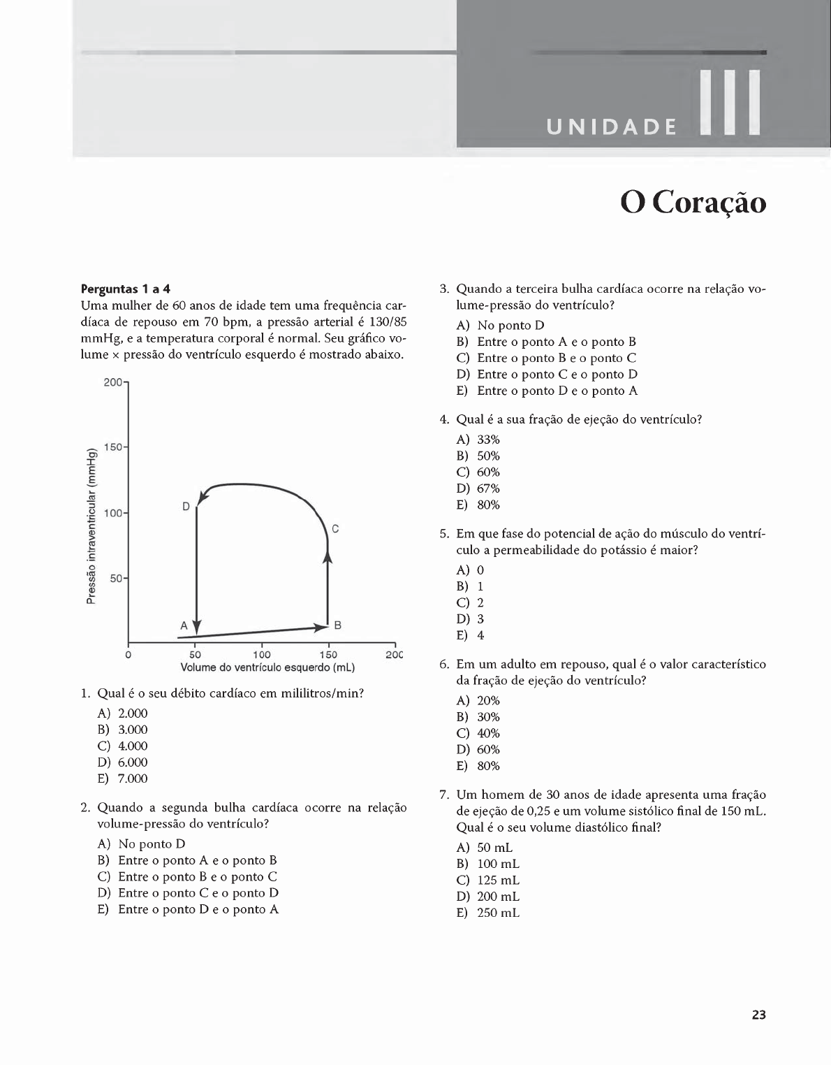 U N I D A D E O Cora^áo Perguntas 1 a 4 Urna mulher de 60 anos de idade tem urna frequéncia car- díaca de repouso em 70 bpm, a pressáo arterial é 130/85 mmHg, e a temperatura corporal é normal. Seu gráfico vo- lunte x pressáo do ventrículo esquerdo é mostrado abaixo. 1. Qual é o seu débito cardíaco em mililitros/min? A) 2.000 B) 3.000 C) 4.000 D) 6.000 E) 7.000 2. Quando a segunda bulha cardíaca o corre na rela^áo volume-pressáo do ventrículo? A) No ponto D B) Entre o ponto A e o ponto B C) Entre o ponto B e o ponto C D) Entre o ponto C e o ponto D E) Entre o ponto D e o ponto A 3. Quando a terceira bulha cardíaca ocorre na rela^áo vo- lume-pressáo do ventrículo? A) No ponto D B) Entre o ponto A e o ponto B C) Entre o ponto B e o ponto C D) Entre o ponto C e o ponto D E) Entre o ponto D e o ponto A 4. Qual é a sua fra<;áo de eje<;áo do ventrículo? A) 33% B) 50% C) 60% D) 67% E) 80% 5. Em que fase do potencial de a<;áo do músculo do ventrí- culo a permeabilidade do potássio é maior? A) 0 B) 1 C) 2 D) 3 E) 4 6. Em um adulto em repouso, qual é o valor característico da fra<;áo de eje<;áo do ventrículo? A) 20% B) 30% C) 40% D) 60% E) 80% 7. Um homem de 30 anos de idade apresenta urna fra<;áo de eje<;áo de 0,25 e um volume sistólico final de 150 mL. Qual é o seu volume diastólico final? A) 50 mL B) 100 mL C) 125 mL D) 200 mL E) 250 mL 23booksmedicos.org UNIDADE III O Coraçâo 8. Qual das seguintes afirmaçôes sobre o músculo cardí- aco é mais exata? A) Os túbulos T do músculo cardíaco podem armaze- nar muito menos càlcio do que os túbulos T do músculo esquelético B) A força e a contraçâo do músculo cardíaco depen- derá da quantidade de càlcio ao redor dos miócitos cardíacos C) No músculo cardíaco o inicio do potencial de açâo provoca urna abertura ime diata dos canais lentos de càlcio D) A repolarizaçâo do músculo cardíaco é provocada pela abertura dos canais de sòdio E) Os mucopolissacarídios dentro dos túbulos T se ligam aos íons cloreto 9. O ECG de um homem de 60 anos de idade mostra um intervalo R-R de 0,55 s. Qual das seguintes opçôes ex- plica melhor sua condiçâo? A) Ele apresenta febre B) Ele apresenta frequência cardíaca normal C) Eie apresenta excesso de estimulaçâo parassimpá- tica do nò S-A D) Eie é um atleta praticante em repouso E) Eie apresenta hiperpolarizaçâo do nò S-A 10. Qual das seguintes opçôes é a causa provável para o coraçâo entrar em contraçâo espástica? A) Aumento da temperatura corporal B) Aumento da atividade simpàtica C) Diminuiçâo de ions potàssio no líquido extracelular D) Excesso de ions potàssio no líquido extracelular E) Excesso de càlcio no líquido extracelular 11. Qual dos eventos a seguir ocorre no final do periodo de ejeçâo do ventrículo? A) Fechamento das valvas A-V B) Abertura da valva aòrtica C) A valva aòrtica permanece aberta D) Abertura das valvas A-V E) Fechamento da valva pulmonar 12. Qual das seguintes fases do ciclo cardiaco ocorre m e- diatamente após o inicio da onda QRS? A) Relaxamento isovolumétrico B) Ejeçâo do ventrículo C) Sistole do àtrio D) Diàstase E) Contraçâo isovolumétrica 13. Qual das seguintes condiçôes resultará em um coraçâo dilatado e flácido? A) Excesso de ions càlcio no sangue B) Excesso de ions potàssio no sangue C) Excesso de ions sòdio no sangue D) Aumento da estimulaçâo simpática E) Aumento da concentraçâo de norepinefrina no sangue 14. Um atleta bem condicionado de 25 anos de idade pesa 80 kg. Durante estimulado simpática intensa, qual é o nivel de plato da sua curva de fundo do débito cardíaco? A) 3 L/min B) 5 L/min C) 10 L/min D) 13 L/min E) 25 L/min 15. Qual dos seguintes eventos está associado á primeira bulha cardíaca? A) Fechamento da valva aórtica B) Período de enchimento rápido dos ventrículos du- rante a diástole C) Inicio da diástole D) Abertura das valvas A-V E) Fechamento das valvas A-V 16. Qual das seguintes cóndilo es no nó A-V causaria di- minuido na frequéncia cardíaca? A) Aumento da permeabilidade de sodio B) Diminuido dos níveis de acetilcolina C) Aumento dos níveis de norepinefrina D) Aumento da permeabilidade de potássio E) Aumento da permeabilidade de cálcio 17. A estimulado simpática do corado A) Libera acetilcolina ñas term inales simpáticas B) Diminui a frequéncia de descarga do nó sinoatrial C) Diminui a excitabilidade do corado D) Libera norepinefrina ñas terminados simpáticas E) Diminui a contratibilidade cardíaca 18. Qual é o retardo total normal do impulso cardíaco no nó A-V e no feixe A-V? A) 0,22 s B) 0,18 s C) 0,16 s D) 0,13 s E) 0,09 s 19. Qual das seguintes opdes explica melhor como a esti- mulado simpática afeta o corado? A) Diminui a permeabilidade do nó S-A ao sodio B) Diminui a permeabilidade do nó A-V ao sodio C) Aumenta a permeabilidade do nó S-A ao potássio D) Há aumento na taxa de tendéncia de prolongamento do potencial de repouso da membrana do nó S-A E) Diminui a permeabilidade do músculo cardíaco ao cálcio 20. Qual das seguintes estruturas terá a resposta mais lenta de condudo do potencial de ado cardíaco? A) Músculo atrial B) Via internodal anterior C) Fibras do feixe A-V D) Ramos subendocárdicos E) Músculo ventricular 24 booksmedicos.org 21. Se o nó S-A descarrega em 0,00 s, quando o potencial de at^ ào normalmente chegarà a superficie do epicàr- dio na base do ventrículo esquerdo? A) 0,22 s B) 0,18 s C) 0,16 s D) 0,12 s E) 0,09 s 22. Se o nó S-A descarrega em 0,00 s, quando o potencial de agào normalmente chegarà ao feixe A-V (fascículo atrioventricular)? A) 0,22 s B) 0,18 s C) 0,16 s D) 0,12 s E) 0,09 s 23. Qual das seguintes condi<;òes no nó S-A causará dimi- nuido da frequència cardiaca? A) Aumento dos niveis de norepinefrina B) Aumento da permeabilidade do sòdio C) Aumento da permeabilidade do càlcio D) Aumento da permeabilidade do potàssio E) Diminuido dos niveis de acetilc