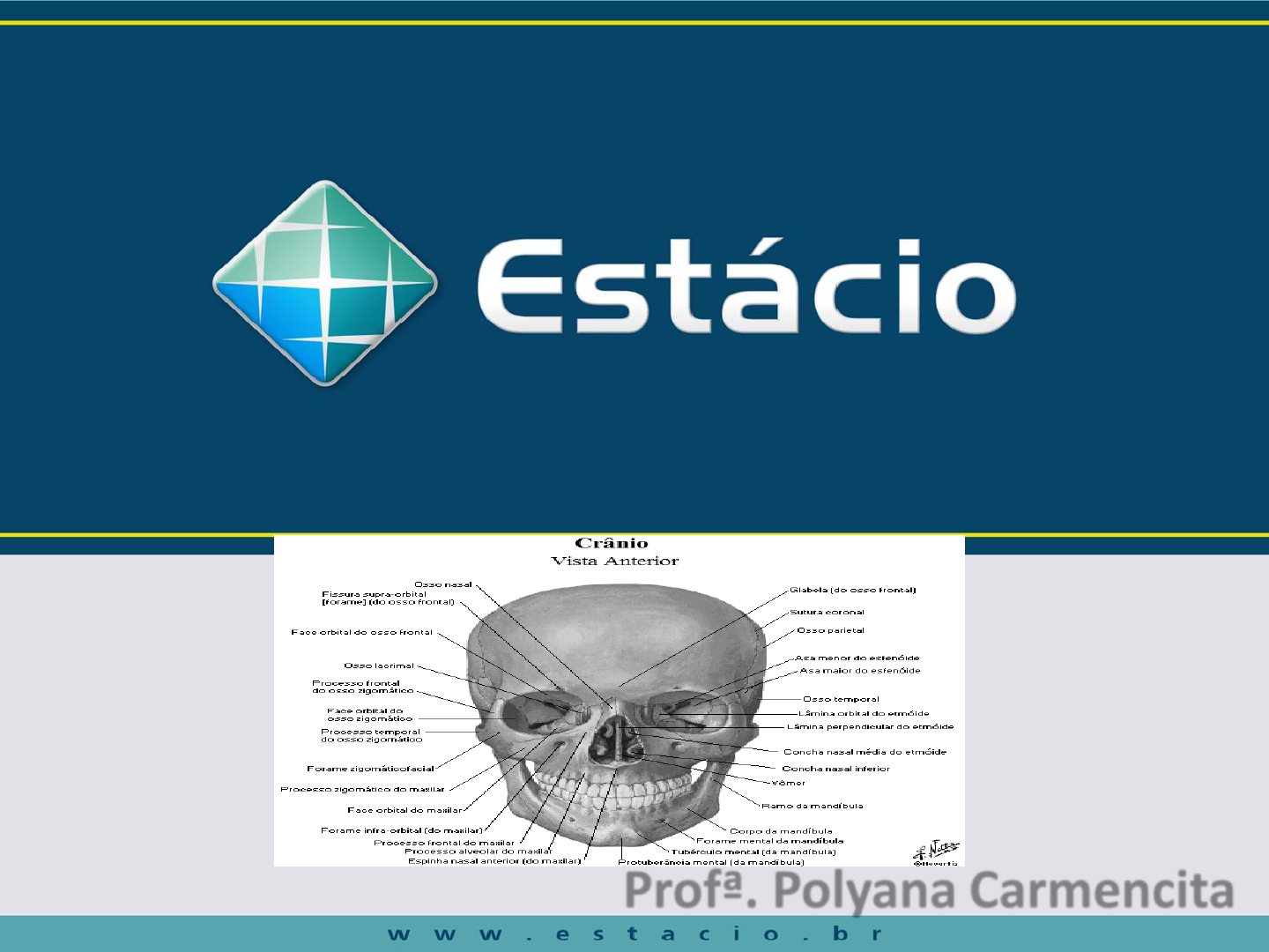 Anatomia da Cabeça e Pescoço Profª. Polyana Carmencita Ossos e Articulações da Cabeça e Pescoço Funções do Crânio FUNÇÃO PRIMORDIALForma uma caixa óssea para abrigar e proteger o encéfalo; Possui cavidades para órgãos de sensibilidade específica (visão, audição, equilíbrio, olfação e gustação); Apresenta abertura para passagem de ar e do alimento; Possui os ossos mandíbula,maxilares e os dentes, necessários para mastigação. Órbita Abertura Piriforme Os ossos da cabeça são unidos por articulações chamadas suturas, com exceção da mandíbula; O crânio é composto por 22 ossos e se divide em neurocrânio (protege o encéfalo) e viscerocrânio (abriga e protege as regiões faciais). Neurocrânio e Viscerocrânio • O neurocrânio é composto por 8 ossos: frontal(1), parietal (2), occipital (1), temporal (2), esfenóide (1) e etmóide (1). • O viscerocrânio (ossos da face) é composto por 14 ossos: maxila (2), palatino (2), zigomático (2), lacrimal (2), nasal (2), vômer (1), concha nasal inferior (2) e mandíbula (1). Base interna do crânio, Base externa do crânio e Calvária O teto do neurocrânio é conhecido como calvária (calota craniana); O assoalho é conhecido como base do crânio; A base externa do crânio é a parte inferior do neurocrânio e viscerocrânio menos a mandíbula; A base interna do crânio possui três depressões importantes que são: as fossas anterior, média e posterior do crânio. Calota Craniana (Calvária) • Formada pelos ossos FRONTAL, PARIETAIS E OCCIPTAL. Base Externa do Crânio Base Externa do Crânio Base do Interna do Crânio Ossos da Base Interna do Crânio • FRONTAL, ETMÓIDE, ESFENÓIDE ,OCCIPITAL e ossos pares TEMPORAIS. FOSSAS CRANIANAS FOSSA ANTERIOR DO CRÂNIO FOSSA MÉDIA DO CRÂNIO FOSSA POSTERIOR DO CRÂNIO Divisão da Base da Cavidade Craniana Fossa média Fossa anterior Fossa posterior Base Interna do Crânio FOSSA CRANIANA ANTERIOR: formada pelo osso frontal e etmóide; FOSSA CRANIANA MÉDIA: formada pelo esfenóide e temporais; FOSSA CRANIANA POSTERIOR: formada pelo Occipital. Órbita A órbita é uma cavidade óssea, piramidal, situada no viscerocrânio com sua base na frente e seu ápice atrás. Função: acomodar e proteger os bulbos dos olhos e seus músculos, nervos e vasos, junto com a maior parte do aparelho lacrimal. Os ossos que formam a órbita são: frontal, lacrimal, esfenóide, etmóide, zigomático, palatino e maxila. Ossículos da Audição São três pequenos ossos situados no interior da cavidade da orelha média, na parte petrosa de cada osso temporal. De fora para dentro, estes ossos são: martelo, bigorna e estribo. Seus movimentos transmitem impulsos sonoros através da cavidade da orelha média. AUDIÇÃO : REALIZADA PELAS ORELHAS EXTERNA, MÉDIA E INTERNA / Equilíbrio * REVISANDO Ossos: do Neurocrânio Viscerocrânio (Face) • Frontal Maxilares • Parietais Palatinos • Temporais- 3 partes: escamosa, timpânica e petrosa Lacrimais • Occipital Nasais • Esfenóide Zigomáticos • Etmóide Conchas Nasais Inferiores Vômer Mandíbula Osso hióide É um osso especial, em forma de “U”, localizado na porção ântero-superior do pescoço, entre a mandíbula e a laringe; É a única parte do esqueleto que não se articula com nenhum outro osso, mas está suspenso pelos ligamentos estilo-hióideos, que se fixam nos processos estilóides; Grupos musculares se fixam no osso hióide e em razão de suas posições são chamados de supra- hióideos e infra-hióideos. PRINCIPAIS ACIDENTES ANATÔMICOS DOS OSSOS Osso frontal Processo Estilóide O frontal é um osso ímpar que forma a região ântero-superior do crânio. • Inicia seu desenvolvimento como dois ossos separados,formando a sutura METÓPICA. * O frontal articula-se com doze ossos: esfenóide, etmóide, parietais (2), nasais (2), maxilares (2), lacrimais (2) e zigomáticos (2). • FRONTAL margem supra-orbitária, glabela, forame supra-orbital, seio frontal. • OCCIPITAL forame magno, protuberância occipital externa, fossa cerebelar, côndilos do occipital. • TEMPORAIS processo zigomático, meato acústico externo, fossa mandibular,canal carótico, fossa jugular, processos mastóide e estilóide. Ossos Parietais OSSO TEMPORAL OSSO OCCIPITAL Seu detalhe mais marcante é o largo Forame MAGNO, pelo qual a cavidade craniana se comunica com o canal vertebral. * O occipital se articula com 6 ossos: 2 parietais, 2 temporais, esfenóide e o Atlas. OSSO TEMPORAL É um osso muito complexo e muito importante,pois no seu interior encontra-se o aparelho auditivo. * Articula-se com 5 ossos: occipital, parietal, zigomático, esfenóide e mandíbula. Osso Etmóide *Articula-se com treze ossos: frontal, esfenóide, nasais, lacrimais, maxilares, palatinos, conchas nasais inferiores e o vômer. OSSO ETMÓIDE Lâminas do Etmóide: – Lâmina Crivosa: possui esse nome por ser perfurada por finos forames crivosos (forames olfatórios); - Lâmina Perpendicular: forma a maior parte do septo nasal, que divide o nariz em cavidades direita e esquerda. OSSO ETMÓIDE OSSO ETMÓIDE ETMÓIDE -Lamina perpendicular - Lamina cribriforme - Crista Etmoidal (Galli) - Massas laterais Concha nasal superior e Concha nasal média ESFENÓIDE -Asa maior e asa menor - Sela turca (túrcica) - Processo pterigóide - Forames oval, espinhoso, redondo e lácero - Canal óptico - Fissura orbitária superior - Seio esfenoidal OSSO ESFENÓIDE *É rodeado por outros ossos, articulando-se posteriormente com a parte basilar do occipital; lateralmente com os ossos temporal e parietal, e anteriormente com os ossos frontal e etmóide. Esfenóide OSSOS MAXILARES MAXILAR • Forame infra-orbitário • Espinha nasal anterior • Abertura Piriforme • Processo alveolar e palatino • Seios maxilares ZIGOMÁTICO • Forame zigomáticofacial • Processo frontal • Processo temporal Osso Vômer Osso Vômer Osso Vômer Osso Zigomático *Se articula com ossos maxilares, os