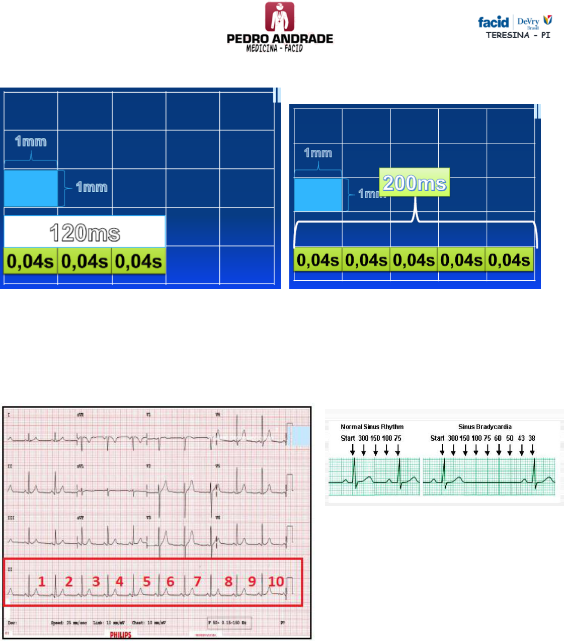 CALCULAR A FC conta qntos QRS tem no D2 longo e conta qntos QRS tem e multiplica por 6 Verificamos q há 10 → 10 x 6 = 60bpm – 10 para mais ou para menos Então a FC está entre 50 e 70bpm ONDA P: 2-100 Intervalo PR: 120-200: é o tempo do início da contração do átrio até chegar no ventrículo 400 - - ACIMA de 400 já é MORTE SÚBITA Intervalo QT Intervalo PR ONDA P: CONTRAÇÃO ATRIAL Átrio DIREITO – ALTURA da ONDA P Átrio ESQUERDO – COMPRIMENTO da ONDA P CONVENÇÃO: a melhor derivação p ver onda P é a DII – OLHA ONDA P em D2 ONDA P: 2-100 É sempre positiva em na derivação DII É sempre NEGATIVA em AVR É RITMO SINUSAL Intervalo PR: 120-200ms: é o tempo do início da contração do átrio até chegar no ventrículo Não pode ser muito rápido - chegar c 80ms – senão pega o ventrículo de maneira PRECOCE Não pode ser muito lento – não pode passar de 200ms – senão pega o ventrículo dormindo Esse intervalo tem q ser >120 e < 200ms: é o tempo NORMAL DO ESTÍMULO SAIR DO ÁTRIO P O VENTRÍCULO. PR LONGO: velocidade DIMINUÍDO PR CURTO: velocidade AUMENTADA QRS – 120ms – é o tempo q o ventrículo se DESPOLARIZA intervalo QRS mede o tempo da despolarização ventricular. Pra achar o VD eu procuro ele em R de V1 e R de V2 Pcte com DPOC, Hipertensão Pulmonar, Enfisematoso vou atrás de R de V1 e R de V2 O ventrículo ESQUERDO é o R de V4V5V6 = pcte HIPERTENSO R – Representa o tempo q o estímulo demora pra passar na parede do ventrículo HIPERTROFIA DE VE = V4V5V6 = pcte HIPERTENSO ONDA T – é a REpolarização ventricular Em V1 ela pode ser POITIVA ou NEGATIVA, pode não existir = não analisar Em V2 A V6 SEMPRE tem q ser POSITIVA – P SER NORMAL TEM Q SER POSITIVA OBS: QNDO NEGATIVA É DOENÇA INTERVALO QT: 400ms = 2QUADRADÕES - > 400 = MORTE SÚBITA É O TEMPO Q O VENTRÍCULO APARECE NO ECG PAREDE INFERIOR Menina de 23 anos tem algo importante lá em baixo Pelo menos algo positivo 23F = D2, D3 e avF = a parede inferior do ECG Olha o QRS – SE TIVER PELO MENOS 1 QRS POSITIVO – ESSE EIXO tá NORMAL BASTA 1 QRS POSITIVO pra o eixo do coração TA NORMAL O R DE V1 É AO MESMO TEMPO VD E VE O R DE V2 É AO MESMO TEMPO VD E VE ONDE OLHO O VD(V1 e V2) É O MESMO LOCAL ONDE VEJO O SEPTO INTERVENTRICULAR → VD DE V1 a V6 é chamado de parede ANTerior PARA ANALISAR O ECG: 1º - VELOCIDADE DO PAPEL: 25mms 2º - verificar se o eletrodo está colocado corretamente: tudo q representa o lado DIREITO tem q tá NEGATIVO, ENTÃO: tudo q tá em avR tem q tá NEGATIVO. SE EM avR tiver algo POSITIVO: ou é erro de eletrodo. 3º - depois q olha o avR, OLHA A ONDA P 4º - OLHA SE O RITMO É SINUSAL: onda P POSITIVA em D2 e NEGATIVA em avR = RITMO SINUSAL 5º - Ver se o VD está presente: olha o R de V1 e o R de V2 6º - Ver se o VE está presente: olha o R de V4V5V6 = ENTAO a despolarização ventricular está normal, se ele se polarizou agora vai se REpolarizar. 7º - onda T – tem q ser POSITIVA de V2 a V6 = ENTAO a REpolarização ESTÁ NORMAL 8º - EIXO AXIAL NORMAL = D2, D3 e avF POSITIVOS FC Pega o intervalo RR Se a distância entre o RR for de 1 QUADRADÃO 1 QUADRADÃO tem 5 quadradinhos 1500/5 = 300bpm Se a distância entre o RR for de 2 QUADRADÕES (são 10 quadradinhos) – 1500/ 10 = 150bpm Se a distância entre o RR for de 3 QUADRADÕES (são 15 quadradinhos) – 1500/15 = 100bpm Se a distância entre o RR for de 4 QUADRADÕES (são 20 quadradinhos) – 1500/20 = 75bpm Se a distância entre o RR for de 5 QUADRADÕES (são 25 quadradinhos) – 1500/25 = 60bpm FC NORMAL = entre 60-100bpm BRADIcardia < 60bpm TAQUIcardia > 100bpm Distância entre RR > 5 QUADRADÕES – BRADIcardia Distância entre RR < 3 QUADRADÕES – TAQUIcardia INTERVALO PR: mede a condução AV(átrio-ventricular) Mede o tempo da atividade elétrica q sai do átrio até o ventrículo Vai do início da onda P até o início do complexo QRS PR NORMAL – vai de 120 a 200ms – de 3 a 5 quadradinhos PR longo: LENTIFICAÇÃO PR curto: RITMO SINUSAL: Onda P vem antes do QRS em D2 e é POSITIVA QRS estreito ou alargado? Ritmo SINUSAL + QRS ALARGADO = Bloqueio de ramo (direito ou esquerdo) RITMO SINUSAL RITMO SINUSAL RITMO JUNCIONAL RITMO JUNCIONAL QRS ESTREITO AUSÊNCIA DE ONDA P EXTRASISTOLE VENTRICULAR QRS ALARGADO EXTRASÍSTOLE SUPRAVENTRICULAR → QRS ESTREITO TAQUICARDIAS QRS ESTREITO RR REGULAR O Q ALTERA É A ONDA P (PRESENTE, INVERTIDA, AUSENTE) TAQUICARDIA → FC > 100 QRS ESTREITO = SUPRA VENTRICULAR RR REGULAR ONDA P – PRESENTE → TAQUICARDIA SINUSAL TAQUICARDIA → FC > 100 QRS ESTREITO = SUPRA VENTRICULAR RR REGULAR ONDA P NEGATIVA, INVERTIDA, DISMÓRFICA → TAQUICARDIA ATRIAL TAQUI SUPRA – TTO: ADENOSINA FLUTTER ATRIAL - TTO DO FLUTTER É CARDIOVERSÃO FLUTTER ATRIAL COM ALTA FREQUENCIA – “NÃO CONFUNDIR COM FV” Aqui no FLUTTER é BEM ORGANIZADO FIBRILAÇÃO ATRIAL de BAIXA resposta ventricular → FC < 100 AUSÊNSIA DE ONDA P RR Irregular FIBRILAÇÃO ATRIAL COM BAIXA RESPOSTA VENTRICULAR → FC < 50bpm RR IRREGULAR AUSÊNCIA DE ONDA P FIBRILAÇÃO ATRIAL COM ALTA RESPOSTA VENTRICULAR FIBRILAÇÃO ATRIAL COM ALTA RESPOSTA VENTRICULAR FIBRILOFLUTTER MARCAPASSO UNICAMERAL ATIVIDADE ELÉTRICA SEM PULSO = AESP → RITMO IDIOVENTRICULAR TTO = MASSAGEM NEM CARDIOVERTE NEM DESFIBRILA = FAZ MASSAGEM TAQUICARDIA VENTRICULAR MONOMÓRFICA QRS ALARGADO RR REGULARTAQUICARDIA VENTRICULAR POLIMÓRFICA TTO = SULFATO DE MAGNÉSIO WOLFF-PARKINSON-WHITE = PR CURTO + ONDA DELTA WOLFF-PARKINSON-WHITE COM ALTA RESPOSTA BAV DE 1º GRAU → INTERVALO PR LONGO BAV DE 2º GRAU – HÁ A PAERDA DE UM QRS TIPOS: MOBITZ 1 e MOBITZ 2 BAV DE 2º GRAU MOBITZ 1 O intervalo PR vai prolongando até PERDER um QRS BAV DE 2º GRAU MOBITZ 2 DICA: INTERVALO PR VAI SE DISTANCIANDO E DEREPENTE HÁ PERDA DE QRS BAV TOTAL BLOQUEIO DE RAMO DIREITO (BRD) OLHA V1 e V2 OLHA V1 e V2, E EM D1 = MACETE – ORELHA DE COELHO BLOQUEIO DE RAMO ESQUERDO SINAL DE MESETA, BARRA GREGA TTO: FIBRINOLÍTICO OU ANGIOPLAST