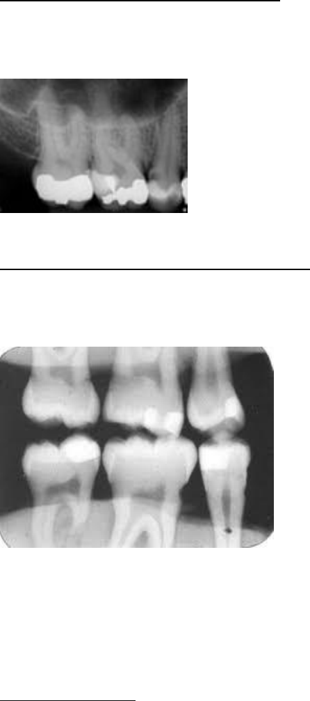 ELVIRA RACHEL CARVALHO FERREIRA QUINDERÉ Diferentes materiais utilizados na odontologia Obs: apenas lauda-se a região que é a radiografia. Não podendo dar nenhuma suspeita de diagnostico de dentes adjacentes ao da região. Materiais utilizados para restauração Material obturador: ele localiza-se no interior do núcleo, na raiz. Material restaurador: localizado na coroa. Matérias utilizados em dentistica – metálicos Imagem radiopaca. • Amalgama é um exemplo. imagem sugestiva de imagem radiopaca em dente 17 (O), 16 (MO) Materiais utilizados em dentistica – não metálicos Imagem de baixa radiopacidade • Resinas, acrílico, cimento de ionômero de vidro. Obs: é necessário sempre falar as faces que a restauração se encontra, podendo ser: M (mesial), O (oclusal), D (distal) ou MOD. Exemplos: M+O ; O+D ; O ; M ; D; Em alguns casos os materiais restauradores podem estar insatisfatórios, tendo que serem descritos no laudo. Em casos de material restauradores insatisfatórios + cárie, não é necessário laudar a cárie! Matérias obturadores • Guta percha (radiopaco leve – usado em todos os casos de endodontia), cone de prata (usado antigamente) ELVIRA RACHEL CARVALHO FERREIRA QUINDERÉ Podem estar satisfatórias, além do limite apical ou aquém do limite apical. O nível de obturação da imagem a seguir está bem próximo ao ápice dental, classificando-se em obturação satisfatória. Imagem sugestiva de matéria obturador no interior do conduto de elemento 46. Além do limite apical: quando o material obturador passa o limite o apical. Aquém do limite apical: quando o material obturador não chega no limite apical Exemplo: ELVIRA RACHEL CARVALHO FERREIRA QUINDERÉ • Material obturador aquém, porém não tem lesão periapical: imagem sugestiva de material obturador aquém do limite apical 37, sugere-se proservação (acompanhar). • Material obturador aquém com lesão periapical: imagem sugestiva de material obturador aquém do limite apical 37, sugere-se avaliação de endodontia. Implante: ausência do dente x pino: presença de raiz Destruição coronária x resto radicular Destruição coronária: consegue-se recuperar o núcleo e fazer uma coroa total. Resto radicular: é só o resto de uma raiz, não tem mais nenhuma função e é necessário extrai- la. Imagem sugestiva de resto radicular de elemento 16 Imagem sugestiva de destruição coronária de elemento 46 Próteses As próteses de cerâmicas não possuem metal nenhum, não tendo radiopacidade. E existe próteses que possuem metal, são elas: coroas metálicas, núcleos metálicos e etc, sendo bem radiopacas. ELVIRA RACHEL CARVALHO FERREIRA QUINDERÉ Imagem sugestiva de material protético em coroa 46, imagem sugestiva de material obturador satisfatório de 46, imagem sugestiva de lesão periapical 46, resina de baixa radiopacidade em 47 Imagem sugestiva de material obturador aquém do limite apical em 15, imagem sugestiva de reconstrução coronária protética 15, imagem sugestiva de restaurador insatisfatório (OD) em 14 , imagem sugestiva de pino intra radicular em 14 obs: o material protético pode estar de forma insatisfatória, não atingindo os lados proximais do dente. Sendo necessário especificar no laudo que esta prótese está insatisfatória. Implante: O implante ocorre quando há ausência de núcleo, introduzido com o “pino” Imagem de ponte fixa Imagem sugestiva de ponte parcial fixa 44-46 ELVIRA RACHEL CARVALHO FERREIRA QUINDERÉ → dente ausente: 12 ; imagem sugestiva de pino para implante em região de 12 ; imagem sugestiva de coroa protética sobre implante 12 ; imagem sugestiva de material obturador em dente 11