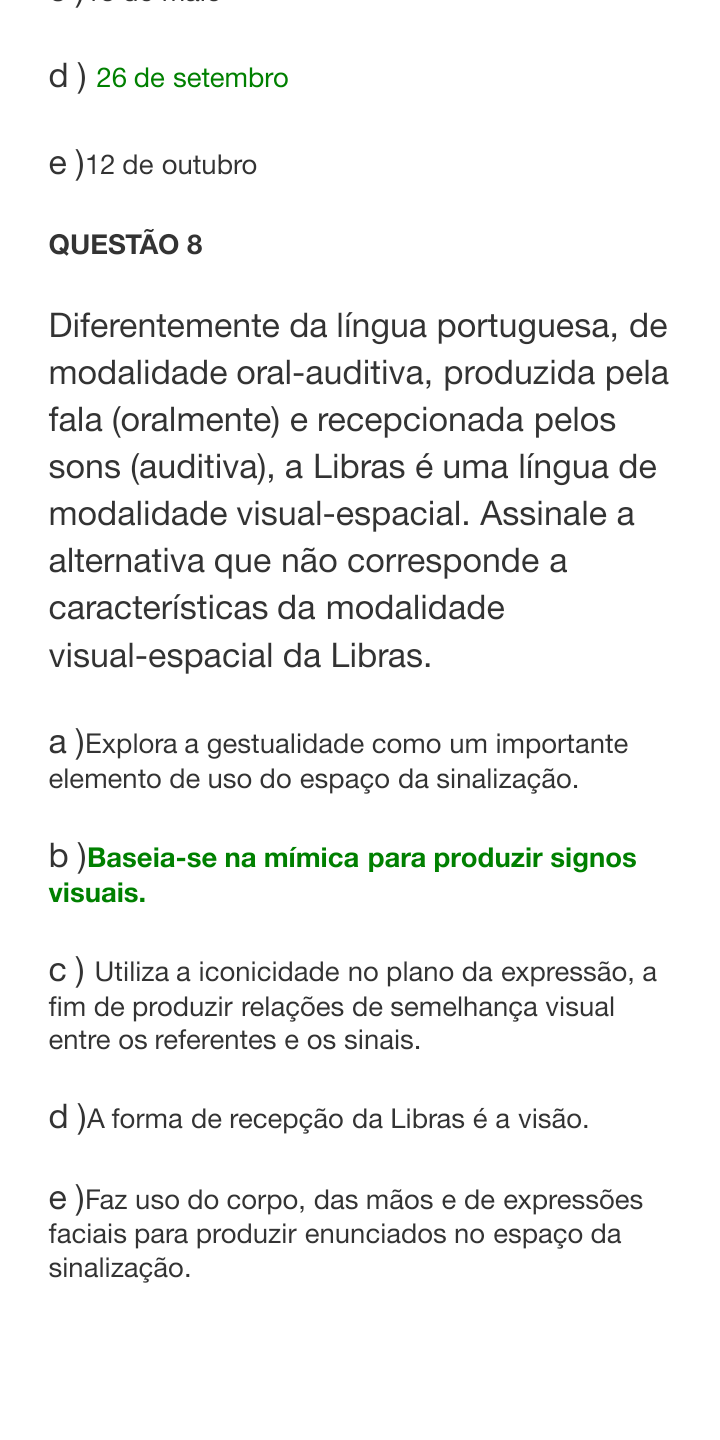 Diferentemente da língua portuguesa, de modalidade oral-auditiva, produzida pela fala (oralmente) e recepcionada pelos sons (auditiva), a Libras é uma língua de modalidade visual-espacial. Assinale a