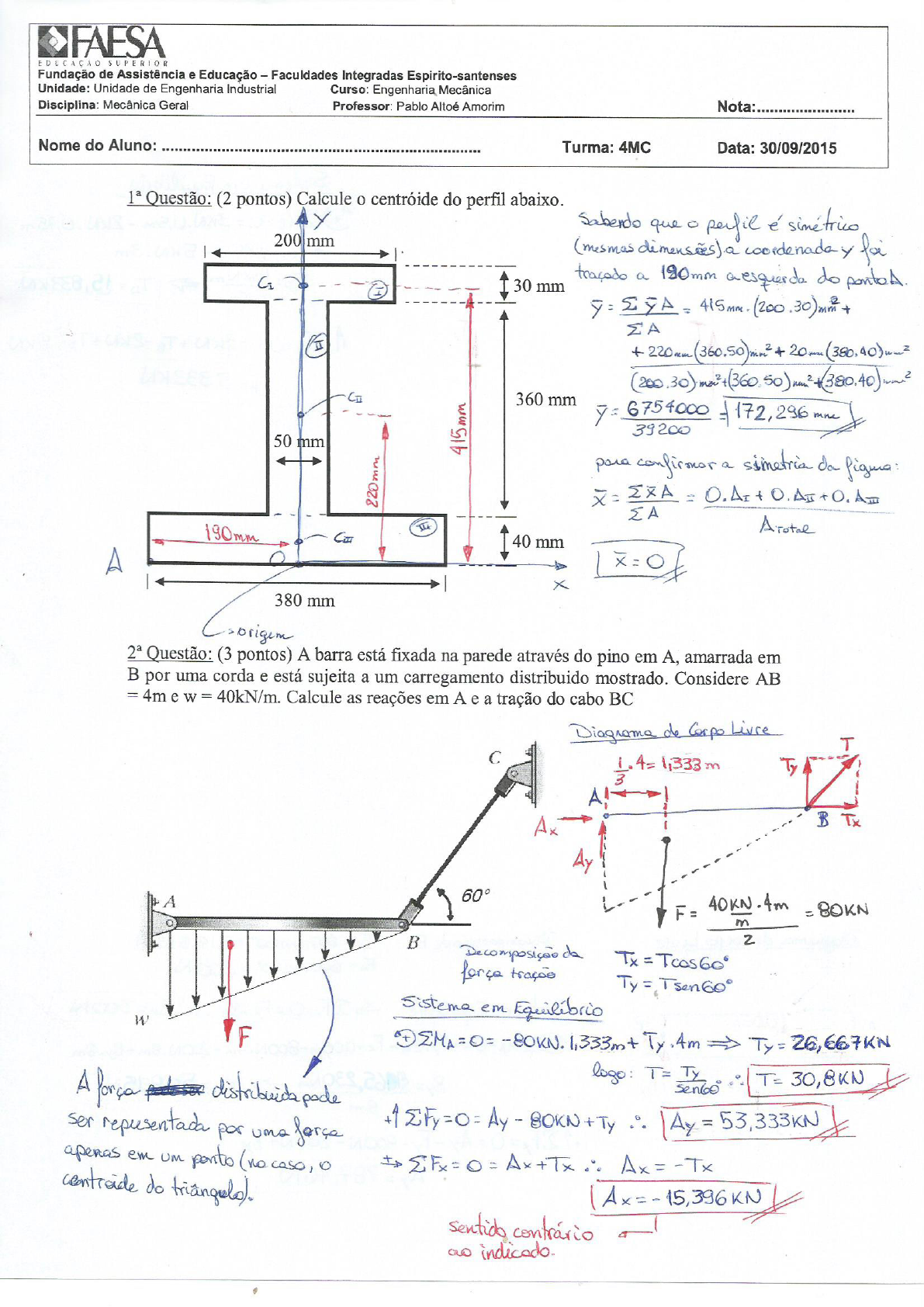 Fundação de Assistência e Educação – Faculdades Integradas Espirito-santenses Unidade: Unidade de Engenharia Industrial Curso: Engenharia Mecânica Disciplina: Mecânica Geral Professor: Pablo Altoé Amorim Nota:....................... Nome do Aluno: ........................................................................... Turma: 4MC Data: 28/09/2015 1ª Questão: Uma extremidade da barra AB apóia-se no canto A e a outra atada ao cabo BD. Com uma carga de 160N aplicada no centro C da barra, determine a reação em A e a força de tração do cabo. Questão Extra (ponto extra): Uma força de 4250N está aplicada na barra AB, presa por dois cabos BC e BD. Determine a reação na junta esférica em A. 200 mm 360 mm 240 mm 240 mm 160 N A C B D Fundação de Assistência e Educação – Faculdades Integradas Espirito-santenses Unidade: Unidade de Engenharia Industrial Curso: Engenharia Mecânica Disciplina: Mecânica Geral Professor: Pablo Altoé Amorim Nota:....................... Nome do Aluno: ........................................................................... Turma: 4MA Data: 29/09/2015 1ª Questão: Uma barra leve tem um bloco de 15kg pendurado em seu ponto médio C. Roletes em A e C estão apioados em superfícies sem atrito, e um cado horizontal AD está preso em A. Determine as reações em A e B, e a tração no cabo AD. Questão Extra (ponto extra): Uma força de 4250N está aplicada na barra AB, presa por dois cabos BC e BD. Determine a reação na junta esférica em A.