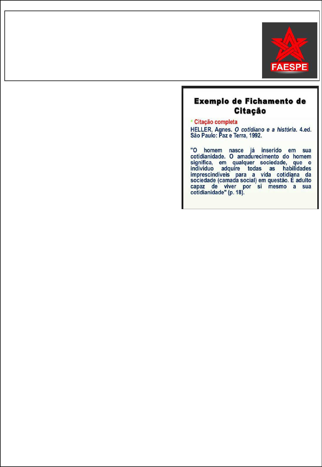 1 FUNDAÇÃO ANTARES DE ENSINO SUPERIOR, PÓS-GRADUAÇÃO PESQUISA E EXTENSÃO- FAESPE. CIDADE: Pontalina – GO. DATA: 23/03/2019 CURSO: Pedagogia. PROFESSORA: Ma. Luzia Marina Keller Morlóc. CONTEÚDO: Arte e Movimento na Educação Infantil GRUPO 01 / 03 TRABALHO: Fichamento - Citação O fichamento é um registro feito em fichas. Nele se resume as ideias principais de um texto, que pode ser um livro, ou parte dele, um artigo de revista e uma reportagem jornalística, por exemplo. Os fichamentos seguem a seguinte “estrutura”: cabeçalho, referência bibliográfica e texto com o conteúdo principal. Citação Fichamento que consiste na reunião das frases mais importantes citadas em um texto. Por isso devem ser transcritas entre aspas. É preciso ter especial atenção para que as citações façam sentido, especialmente quando partes das frases são omitidas. Neste caso, você deve utilizar reticências entre colchetes [...] ou parênteses (...). A PRODUÇÃO CULTURAL DA CRIANÇA Partindo da premissa de que a produção de conhecimento acerca da infância está intimamente ligada ao lugar social que a criança ocupa na relação com o outro. A cultura passa a ser entendida como um sistema simbólico somado a ideia de que as crianças vão incorporando-a gradativamente ao aprender “coisas” que podem ser revistas. Para Cohn (2005, p. 33), a questão deixa de ser apenas como a criança formula um sentido ao mundo que a rodeia, e passa a ser a busca de um novo mundo. Portanto, para a autora, a diferença entre as crianças e os adultos não é quantitativo, mas qualitativa, a criança não sabe menos, sabe outra coisa, isso não quer dizer que a antropologia da criança se confunda com análises do desenvolvimento cognitivo, pelo contrário, dialoga com ela. A questão não é saber em que condição cognitiva a criança elabora sentidos e significados e sim a partir de que sistema simbólico o faz. A consideração das crianças como atores sócios de pleno direito, e não como menores ou como componentes acessórios ou meios da sociedade dos adultos, implica o reconhecimento da capacidade simbólica por parte das crianças e a constituição das suas representações e crenças em sistemas organizados, isto é, em culturas. (SARMENTO, 1997, p.20). O conceito de cultura da infância traz a compreensão e a contribuição para se pensar a criança como ator social, capaz de intervir, modificar e atuar na dinâmica cultural e social dos sujeitos. Desta forma a cultura da infância não se manifesta no vazio e também não é impermeável, uma vez que a cultura “é o próprio ato de ordenar estruturar o mundo percebido através dos símbolos. Portanto, homem e cultura estão indissoluvelmente ligados: só há cultura através do homem, e o homem só existe pela cultura” (DUARTE JUNIOR, 1998, p. 50). Cada criança relaciona-se com o meio produzindo sua interpretação do mundo e interagindo com o mesmo de acordo com as diferentes marcas que lhes são atravessadas. Compreendendo a criança como um sujeito social, inserida nas teias configuracionais da sociedade, fazendo parte de um processo histórico, produtora de culturas e com participação no jogo de construção dos conhecimentos sociais, daí a 2 importância de considerar as produções do seu universo de representações e analisar suas formas de participação social. Considero, a partir das leituras que trago, a infância como uma categoria de pesquisa, por ser uma construção social, constituída a partir das representações coletivas sobre as crianças e suas interações nos diferentes contextos das teias de interdependência social da qual fazem parte. A forma como a infância se configurou na modernidade está relacionada com os preceitos e normas sociais que também configuram a sociedade. Os comportamentos do indivíduo são resultantes desse longo processo social, mas também resultantes de todas as influências e intervenções modeladoras dos adultos civilizados com os quais teve contato desde os primeiros momentos da vida, defende Elias (1990, p. 15). As mudanças de comportamento e a dependência social da criança em relação aos pais estão intimamente relacionadas com a configuração da infância. Ou seja, se os processos culturais dizem respeito aos valores, crenças, mas também às representações e sistemas simbólicos constituídos socialmente, circunscritos a uma época e espaço determinado, na forma como vão se configurando aos processos civilizadores, os processos culturais intrinsecamente estão presentes na formação desse sujeito criança. Como a concepção de configuração das infâncias, segue esse mesmo princípio teórico, pois as crianças estão inseridas nas teias configuracionais da sociedade, os processos que compõem as culturas nas infâncias são circunscritos a uma dada época e local, mas marcadas por um processo que se dá também em longo prazo e relaciona-se diretamente aos processos civilizadores. Mais específico sobre a produção cultural das crianças, compreendo que essa produção não fica descolado da própria compreensão do sujeito criança que temos, assim vamos ampliando olhares sobre a produção propriamente dita, ou melhor, nessa relação de aprender e ensinar arte na educação infantil, que é do que venho buscando reflexões a partir do próprio problema dessa investigação, qual seja: reflexões sobre quais as possíveis contribuições do ensino da arte no desenvolvimento da formação estética da criança? Aprender e ensinar arte na educação infantil Para falar do ensinar e aprender arte, especificamente contemplando a arte na educação infantil está o professor de arte, ele atua em consonância com os demais educadores da instituição, aprofundando conceitos e linguagens da arte. A função desse profissional não seria simplesmente o de “ministrar aulas” fragmentadas de arte, mas, sobretudo de organizar um espaço de cultura que po