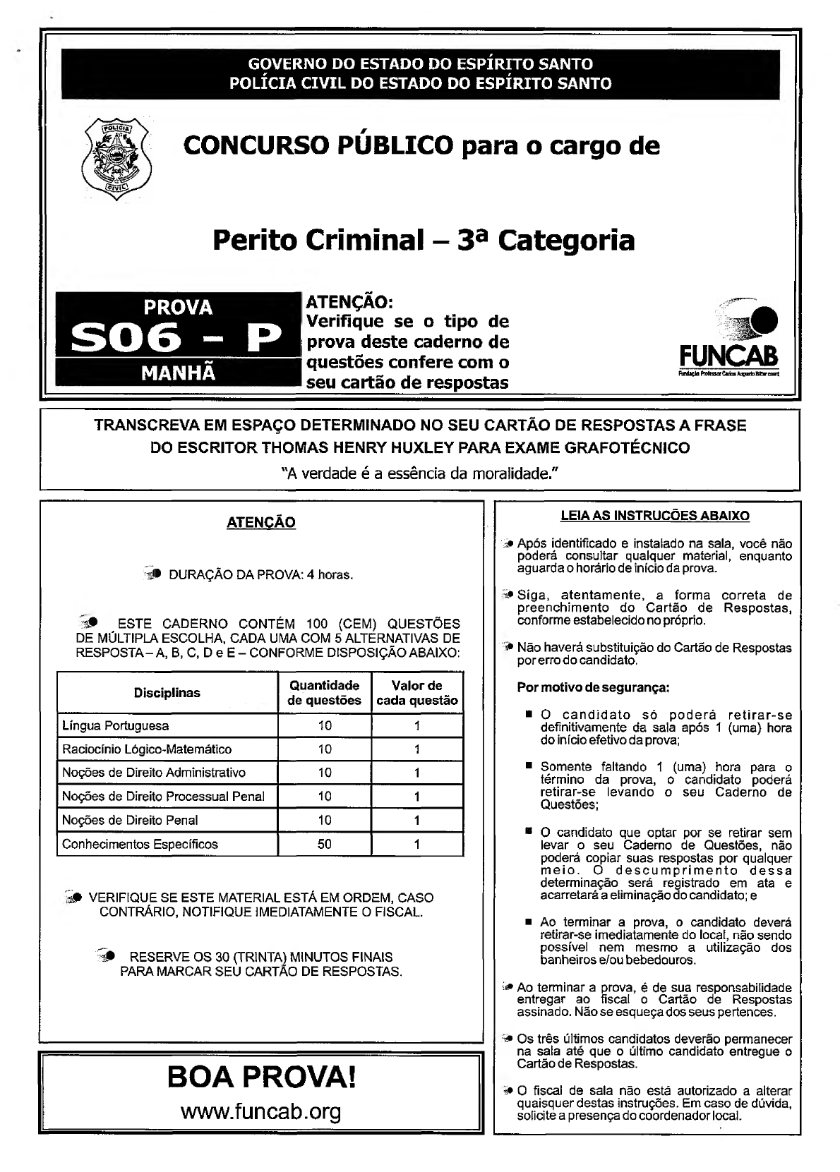 GOVERNO DO ESTADO DO ESPÍRITO SANTO POLÍCIA C IV IL DO ESTADO DO ESPÍRITO SANTO CONCURSO PÚBLICO para o cargo de Perito Criminal - 3a Categoria PROVA MANHÃ ATENÇÃO: Verifique se o tipo de prova deste caderno de questões confere com o seu cartão de respostas FUNCAB Rwliçjfl tofmor Cfcfai Aagurt> BIBbt curt TRANSCREVA EM ESPAÇO DETERMINADO NO SEU CARTÃO DE RESPOSTAS A FRASE DO ESCRITOR THOMAS HENRY HUXLEY PARA EXAME GRAFOTÉCNICO "A verdade é a essência da moralidade." ATENÇÃO :9 i DURAÇÃO DA PROVA: 4 horas. 3# ESTE CADERNO CONTÉM 100 (CEM) QUESTÕES DE MÚLTIPLA ESCOLHA, CADA UMA COM 5 ALTERNATIVAS DE RESPOSTA-A, B, C, D e E - CONFORME DISPOSIÇÃO ABAIXO: Disciplinas Quantidade de questões Valor de cada questão Língua Portuguesa 10 1 Raciocínio Lógico-Matemático 10 1 Noções de Direito Administrativo 10 1 Noções de Direito Processual Penal 10 1 Noções de Direito Penal 10 1 Conhecimentos Específicos 50 1 " l* VERIFIQUE SE ESTE MATERIAL ESTÁ EM ORDEM, CASO CONTRÁRIO, NOTIFIQUE IMEDIATAMENTE O FISCAL. 9 * * RESERVE OS 30 (TRINTA) MINUTOS FINAIS PARA MARCAR SEU CARTAO DE RESPOSTAS. BO A PROVA! www.funcab.org LEIA AS INSTRUÇÕES ABAIXO 'í» Após identificado e instalado na sala, você não poderá consultar qualquer material, enquanto aguarda o horário de início da prova. S» Siga, atentamente, a forma correta de preenchimento do Cartão de Respostas, conforme estabelecido no próprio. # Não haverá substituição do Cartão de Respostas por erro do candidato. Por motivo de segurança: * O cand ida to só poderá re tira r-se definitivamente da sala após 1 (uma) hora do início efetivo da prova; ■ Somente faltando 1 (uma) hora para o término da prova, o candidato poderá retirar-se levando o seu Caderno de Questões; ■ O candidato que optar por se retirar sem levar o seu Caderno de Questões, não poderá copiar suas respostas por qualquer meio. O d e s cu m p r i m e n t o dessa determinação será registrado em ata e acarretará a eliminação do candidato; e ■ Ao terminar a prova, o candidato deverá retirar-se imediatamente do local, não sendo possível nem mesmo a utilização dos banheiros e/ou bebedouros. ^ Ao terminar a prova, é de sua responsabilidade entregar ao fiscal o Cartão de Respostas assinado. Não se esqueça dos seus pertences. y» Qs três últimos candidatos deverão permanecer na sala até que o último candidato entregue o Cartão de Respostas. í# O fiscal de sala não está autorizado a alterar quaisquer destas instruções. Em caso de dúvida, solicite a presença do coordenador locai. ( LÍNGUA PORTUGUESA... ) Leia o texto abaixo e responda às questões propostas. O homem cuja orelha cresceu Estava escrevendo, sentiu a orelha pesada. Pensou que fosse cansaço, eram 11 da noite, estava fazendo hora extra. Escriturário de uma firma de tecidos, solteiro, 35 anos, ganhava pouco, reforçava com extras. Mas o peso foi aumentando e ele percebeu que as orelhas cresciam. Apavorado, passou a mão. Deviam ter uns dez centímetros. Eram moles, como de cachorro. Correu ao banheiro. As orelhas estavam na altura do ombro e continuavam crescendo. Ficou só olhando. Elas cresciam, chegavam à cintura. Finas, compridas, como fitas de came, enrugadas. Procurou uma tesoura, ia cortar a orelha, não importava que doesse. Mas não encontrou, as gavetas das moças estavam fechadas. O armário de material também. O melhor era correr para a pensão, se fechar, antes que não pudesse mais andar na rua. Se tivesse um amigo, ou namorada, iria mostrar o que estava acontecendo. Mas o escriturário não conhecia ninguém a não ser os colegas de escritório. Colegas, não amigos. Ele abriu a camisa, enfiou as orelhas para dentro. Enrolou uma toalha na cabeça, como se estivesse machucado. Quando chegou na pensão, a orelha saía pela perna da calça. O escriturário tirou a roupa. Deitou-se, louco para dormir e esquecer. E se fosse ao médico? Um otorrinolaringologista. A esta hora da noite? Olhava o forro branco, incapaz de pensar, dormiu de desespero. Ao acordar, viu aos pés da cama o monte de uns trinta centímetros de altura. A orelha crescera e se enrolara como cobra. Tentou se levantar. Difícil. Precisava segurar as orelhas enroladas. Pesavam. Ficou na cama. E sentia a orelha crescendo, com uma cosquinha. O sangue correndo para iá, os nervos, músculos, a pele se formando, rápido. Às quatro da tarde, toda a cama tinha sido tomada pela orelha. O escriturário sentia fome, sede. Às dez da noite, sua barriga roncava. A orelha tinha caído para fóra da cama. Dormiu. Acordou no meio da noite com o barulhinho da orelha crescendo. Dormiu de novo e quando acordou na manhã seguinte, o quarto se enchera com a orelha. Ela estava em cima do guarda-roupa, embaixo da cama, na pia. E forçava a porta. Ao meio-dia, a orelha derrubou a porta, saiu pelo corredor. Duas horas mais tarde, encheu o corredor. Inundou a casa. Os hóspedes fugiram para a rua. Chamaram a polícia, o corpo de bombeiros. A orelha saiu para o quintal. Para a rua. Vieram os açougueiros com facas, machados, serrotes. Os açougueiros trabalharam o dia inteiro cortando e amontoando. O prefeito mandou dar a carne aos pobres. Vieram os favelados, as organizações de assistência social, irmandades religiosas, donos de restaurantes, vendedores de churrasquinho na porta do estádio, donas de casa. Vinham com cestas, carrinhos, carroças, camionetas. Toda a população apanhou carne de orelha. Apareceu um administrador, trouxe sacos de plástico, higiênicos, organizou filas, fez uma distribuição racional. E quando todos tinham levado carne para aquele dia e para os outros, começaram a estocar. Encheram silos, frigoríficos, geladeiras. Quando não havia mais onde estocar a carne de orelha, cham aram outras cidades. Vieram novos açougueiros. E a orelha crescia, era cortada e crescia, e os açougueiros trabalhavam. E vinham outros açougueiros. E os outros se cansavam. E a cidad
