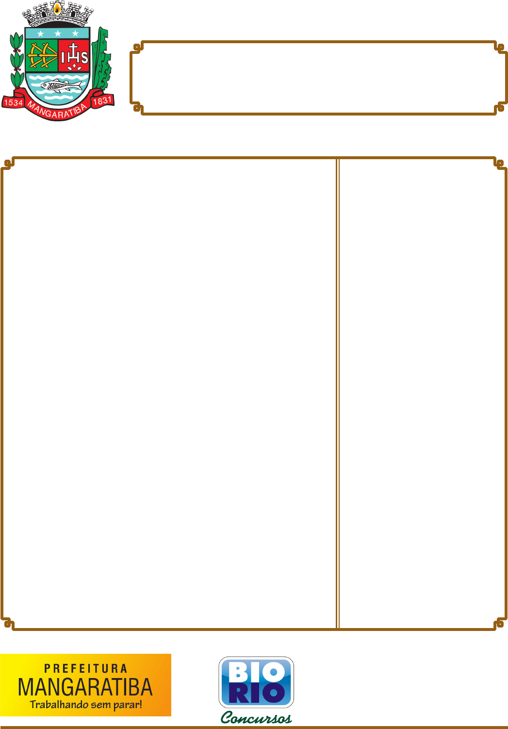 LEIA COM ATENÇÃO AS INSTRUÇÕES 1 - A duração das provas será de 4 (quatro) horas, já incluído o tempo de preenchimento do Cartão de Respostas. 2 - O candidato que, na primeira hora de prova, se ausentar da sala e a ela não retornar, será eliminado. 3 - Os 3 (três) últimos candidatos a terminar a prova deverão permanecer na sala até que todos tenham finalizado suas provas e somente poderão sair juntos do recinto, após aposição em ata de suas respectivas assinaturas. 4 - O candidato NÃO poderá levar o seu Caderno de Questões (Provas Objetivas) e NÃO poderá copiar o gabarito (assinalamentos). A imagem do seu Cartão de Respostas será disponibilizada na página do concurso em http://concursos. biorio.org.br na data prevista no cronograma. INSTRUÇÕES - PROVA OBJETIVA 1 - Confira atentamente se este Caderno de Questões (Provas), que contém 60 (sessenta) questões objetivas, está completo. 2 - Cada questão da Prova Objetiva conterá 5 (cinco) opções e somente uma correta. 3 - Confira se os seus dados pessoais, o cargo escolhido, indicados no cartão de respostas, estão corretos. Se notar qualquer divergência, notifique imediatamente ao Fiscal de Sala ou ao Chefe de Local. Terminada a conferência, você deve assinar o cartão de respostas no espaço apropriado. 4 - Confira atentamente se o cargo e o número do caderno que estão no caderno de questões é o mesmo do que consta em seu cartão de respostas e na etiqueta com seus dados colada na mesa/cadeira onde foi designado para sentar. Se notar qualquer divergência, notifique imediatamente ao Fiscal de Sala ou ao Chefe de Local. 5 - Cuide de seu cartão de respostas. Ele não pode ser rasurado, amassado, dobrado nem manchado. 6 - Se você marcar mais de uma alternativa, sua resposta será considerada errada mesmo que uma das alternativas indicadas seja a correta. 7 - O fiscal de sala não poderá prestar qualquer esclarecimento sobre o conteúdo da prova. Caso discorde de qualquer questão o candidato deverá entrar com recurso administrativo contra as questões na data prevista no cronograma. AGENDA l 23/01 (tarde) e 24/01/2016 (Manhã e Tarde), Provas Objetivas. l 25/01/2016, Divulgação dos Exemplares dos Cadernos de Questões (Provas) das Provas Objetivas. l 25/01/2016, Divulgação dos Gabaritos Preliminares das Provas Objetivas. l 27/01/2016, Disponibilização das Imagens dos Cartões Respostas das Provas Objetivas. l 28/01 e 29/01/2016, Interposição de Recursos contra as questões das Provas Objetivas. l 28/01 e 29/01/2016, Interposição de Recursos contra as questões das Provas Discursivas. l 16/02/2016, Divulgação dos Gabaritos Definitivos das Provas Objetivas. l 16/02/2016, Relação Final de Notas das Provas Objetivas. l 23/02/2016, Relação Final de Notas das Provas Objetivas. l 24/02 e 25/02/2016, Interposição de Recursos contra as Notas Preliminares das Provas Discursivas. l 20/02 e/ou 21/02/2016, Prova Prática. l 24/02 e 25/02/2016, Interposição de Recursos contra as Notas Preliminares das Provas Discursivas. l 23/02 e 24/02/2016, Interposição de Recursos contra as Notas Preliminares das Provas Práticas. l 03/03/2016, Resultado Final. CADERNO: 1CÓDIGO: ASS26 ASSISTENTE SOCIAL Prefeitura Municipal de Mangaratiba INFORMAÇÕES: l Tel: (21) 3525-2480 das 09 às 18h l Internet: http://concursos.biorio.org.br l E-mail: mangaratiba2015@biorio.org.br ASSISTENTE SOCIAL CADERNO 1 2 LÍNGUA PORTUGUESA QUESTÃO 1 “Não paramos de nos divertir por ficarmos velhos. Envelhecemos porque paramos de nos divertir”. (Nouailles) Nessa frase ocorreu a troca da(o): (A) premissa pela conclusão. (B) causa pelo efeito. (C) efeito pela causa. (D) fato pela explicação. (E) explicação pelo fato. QUESTÃO 2 “Há muita comédia na televisão, isso causa comédia nas ruas?” (Dick Cavett) A frase acima se contrapõe ao seguinte pensamento: (A) a TV produz matérias de má qualidade. (B) a TV é responsável pela violência. (C) a TV causa profundas mudanças sociais. (D) a TV atinge todas as camadas da população. (E) a TV tem alto poder de convencimento. QUESTÃO 3 O paralelismo sintático foi desobedecido na seguinte frase: (A) “Sucesso é conseguir o que você quer e felicidade é gostar do que você conseguiu”. (Dale Carnegie) (B) “Para o otimista todas as portas têm maçanetas e dobradiças, para o pessimista todas as portas têm trincos e fechaduras”. (William Arthur Ward) (C) “Se não houver frutos, valeu a beleza das flores; se não houver flores, valeu a sombra das folhas; se não houver folhas, valeu a intenção da semente”. (Henfil) (D) “É barato construir castelos no ar e bem cara a sua destruição”. (F. Mauriac) (E) “Um acontecimento vivido é finito. Um acontecimento lembrado é ilimitado”. (Walter Benjamin) QUESTÃO 4 A frase abaixo em que a palavra “porque” deveria ter uma grafia diferente é: (A) “A única coisa sem mistério é a felicidade porque ela se justifica por si só”. (Jorge Luís Borges) (B) “No fim tudo dá certo, se não deu certo é porque ainda não chegou ao fim”. (Fernando Sabino) (C) “Não chore porque acabou, sorria porque aconteceu”. (Dr. Seuss) (D) “Você pode se queixar porque a rosa tem espinhos ou se alegrar porque os espinhos têm rosas”. (Tom Wilson) (E) “A razão porque muitas pessoas se perdem em pensamentos é que estão em território não-familiar”. (Alfred E. Newman) QUESTÃO 5 A maneira inadequada de trocar uma frase negativa por uma positiva, mantendo-se o mesmo sentido, é exemplificada em: (A) “O homem está pronto para morrer por uma ideia desde que a ideia não esteja bastante clara para ele”. (Paul Eldridge) / esteja bastante obscura (B) “Comédia não é nada além de tragédia adiada”. (Pico Iyer) / é somente (C) “O otimista não sabe o que o espera”. (Millôr Fernandes) / ignora, desconhece (D) “A imaginação muitas vezes nos conduz a mundos que nunca fomos, mas sem ela n