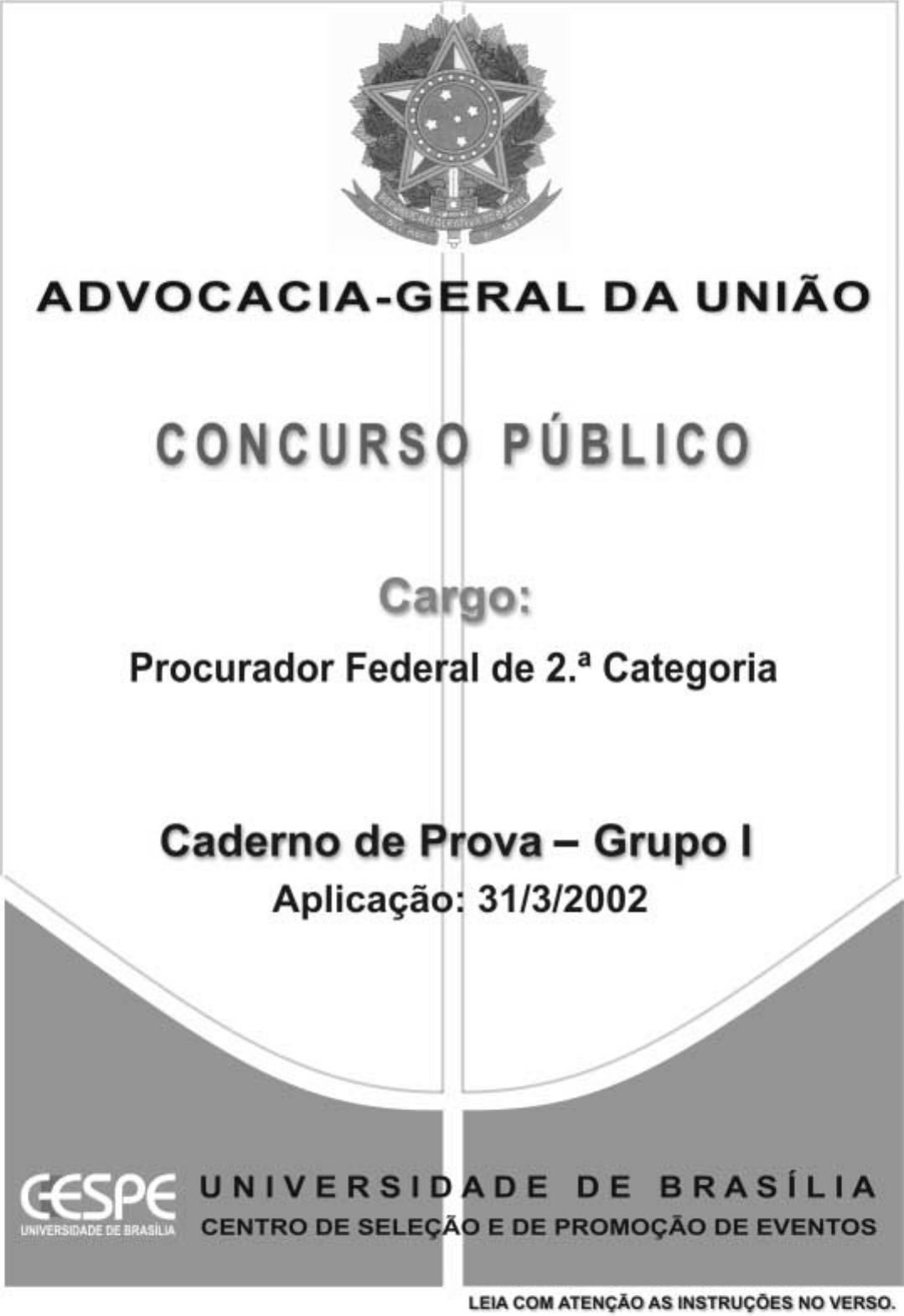ADVOCACIA-GERAL DA UNIÃO Concurso Público – Aplicação: 31/3/2002 CARGO: PROCURADOR FEDERAL DE 2.ª CATEGORIA INSTRUÇÕES 1 Este caderno consta da prova objetiva do Grupo I. 2 Caso o caderno esteja incompleto ou tenha qualquer defeito, o candidato deverá solicitar ao fiscal de sala mais próximo que tome as providências cabíveis. 3 Recomenda-se não marcar ao acaso: cada item cuja resposta divirja do gabarito oficial definitivo acarretará a perda de 0,20 ponto, conforme consta no Edital n.o 1/2002 – CESPE/UnB, de 1.º/2/2002. 4 Não é permitida a utilização de nenhum material de consulta que não seja fornecido pelo CESPE. 5 Durante a prova, o candidato não deverá levantar-se ou comunicar-se com outros candidatos. 6 A duração da prova é de quatro horas, já incluído o tempo destinado à identificação — que será feita no decorrer da prova — e ao preenchimento da Folha de Respostas. 7 A desobediência a qualquer uma das determinações constantes nas presentes Instruções, na Folha de Rascunho ou na Folha de Respostas poderá implicar a anulação da prova do candidato. AGENDA I 2/4/2002 – Divulgação dos gabaritos oficiais preliminares das provas objetivas na Internet — no endereço eletrônico http://www.cespe.unb.br — e nos quadros de avisos do CESPE/UnB, em Brasília. II 3 e 4/4/2002 – Recebimento de recursos contra os gabaritos oficiais preliminares das provas objetivas exclusivamente nos locais que serão informados na divulgação desses gabaritos. III 15/5/2002 – Data provável da divulgação (após a apreciação de eventuais recursos), no Diário Oficial da União e nos locais mencionados no item I, do resultado final das provas objetivas e do resultado provisório da prova discursiva. Observações: • Não serão objeto de conhecimento recursos em desacordo com o estabelecido no item 11 DOS RECURSOS do Edital n.o 1/2002 – CESPE/UnB, de 1.º/2/2002. • Informações relativas ao concurso poderão ser obtidas pelo telefone 0(XX)–61–448–0100. • É permitida a reprodução deste material, desde que citada a fonte. UnB / CESPE – AGU Grupo I Concurso Público – Aplicação: 31/3/2002 Cargo: Procurador Federal de 2.ª Categoria – 1 / 13 É permitida a reprodução, desde que citada a fonte. ADVOCACIA-GERAL DA UNIÃO Concurso Público – Aplicação: 31/3/2002 CARGO: PROCURADOR FEDERAL DE 2.ª CATEGORIA GRUPO I Nas questões de 1 a 42, marque, de acordo com o comando de cada uma delas: itens CERTOS na coluna C; itens ERRADOS na coluna E. Na Folha de Respostas, a indicação do campo SR servirá somente para caracterizar que o candidato desconhece a resposta correta; portanto, a sua marcação não implicará apenação ao candidato. Use a Folha de Rascunho para as devidas marcações e, posteriormente, a Folha de Respostas. QUESTÃO 1 Quanto à Constituição, às normas constitucionais, ao poder constituinte e aos direitos sociais, julgue os itens abaixo. Ø Uma das classificações das constituições leva em consideração os mecanismos previstos para a mudança delas, do que resultam as categorias de constituições rígidas, flexíveis e semi-rígidas; as flexíveis são aquelas que não exigem mecanismos especiais de alteração, mais solenes e complexos que os aplicados à produção do direito infraconstitucional; em todas essas espécies, devido à supremacia da Constituição, deve haver mecanismos adequados de controle de constitucionalidade. Ù Embora polêmica a existência das chamadas normas programáticas, a doutrina e a jurisprudência prosseguem fazendo referência a elas; essas normas juridicizam valores que cabe ao Estado realizar, e sua normatização dirige-se ao Poder Legislativo — ao qual cabe disciplinar os aspectos legais dos programas constitucionais —, mas também se destina aos demais órgãos do Estado. Ú Se uma norma jurídica infraconstitucional admitir diferentes possibilidades de interpretação, mas nenhuma delas permitir a compatibilização da norma com o texto constitucional, então não se deverá deixar de declarar a inconstitucionalidade daquela mediante o emprego da chamada interpretação conforme a Constituição. Û Considere a seguinte situação hipotética. O Congresso Nacional instalou uma comissão de revisão constitucional com a finalidade de atualizar a Constituição de 1988. Por considerar que os procedimentos de reforma constitucional vigentes seriam excessivamente difíceis, a comissão sugeriu, no início de seus trabalhos, que se aprovasse emenda constitucional para abrandar os requisitos para a atualização pretendida, no período de revisão. Nessa situação, desde que a emenda em questão fosse aprovada em conformidade com os procedimentos em vigor, não haveria óbice, segundo entende a doutrina, à validade da emenda constitucional nem à validade das emendas que viessem a ser aprovadas de acordo com os novos requisitos constitucionais. Ü Embora os direitos sociais não estejam relacionados especificamente no art. 5.º da Constituição, é, em geral, aceito pela doutrina que esses direitos integram os chamados direitos fundamentais e que não dizem respeito exclusivamente àqueles decorrentes do contrato de trabalho. QUESTÃO 2 No atinente aos direitos fundamentais, julgue os itens seguintes. Ø Historicamente, os direitos que hoje se conhecem como fundamentais surgiram como limitações à ingerência abusiva do Estado na esfera da vida individual; esses direitos, essencialmente ligados à defesa da liberdade, são o que atualmente se denomina direitos de primeira geração (ou de primeira dimensão). Ù Embora a jurisprudência seja predominante quanto à possibilidade de advogados poderem ser processados por crime contra a honra praticado no exercício profissional, a aplicação de normas penais a essas condutas fere, a rigor, o direito à liberdade de expressão, que tem assento constitucional e status de direito fundamental. Ú Considerando que o ar