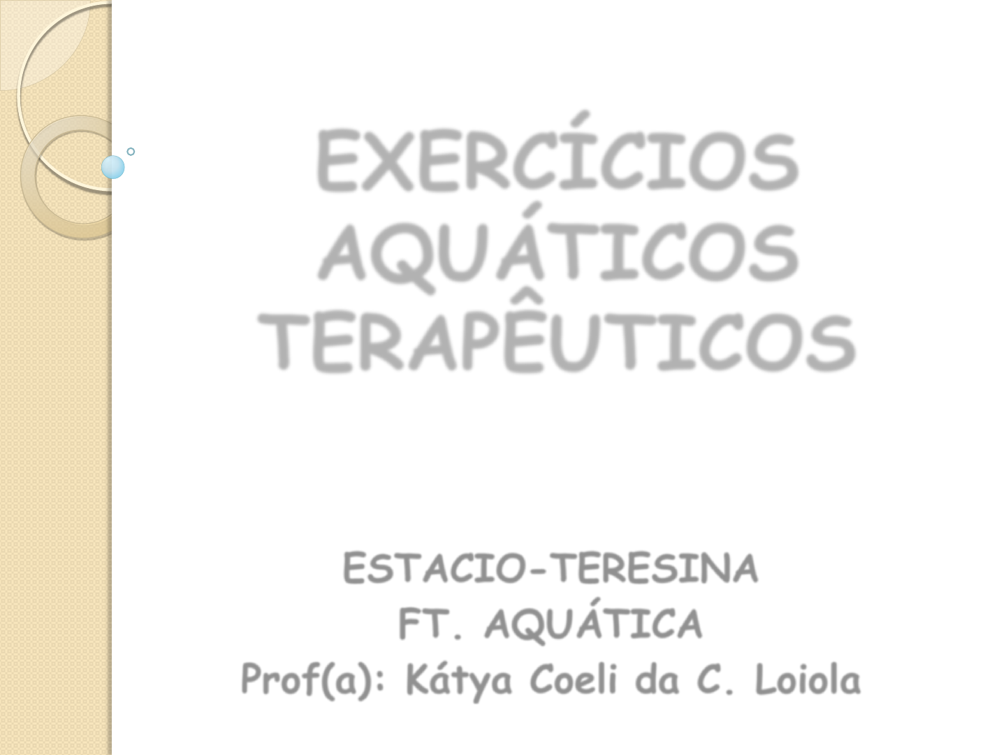 EXERCÍCIOS AQUÁTICOS TERAPÊUTICOS ESTACIO-TERESINA FT. AQUÁTICA Prof(a): Kátya Coeli da C. Loiola O que são os Exercícios Aquáticos Terapêuticos (EAT)? “União dos exercícios aquáticos com a terapia física”. Utiliza os exercícios aquáticos para ajudar na reabilitação de várias patologias; Promove uma maior independência entre os pacientes Maximiza o uso da piscina; Requer um menor tempo do terapeuta INDICAÇÕES E CONTRA-INDICAÇÕES INDICAÇÕES DOS EXERCÍCIOS AQUÁTICOS TERAPÊUTICOS Tratamento de adultos com afecções ortopédicas, neurológicas, geriátricas, reumatológicas, cardiorespiratórias. Tratamento de crianças com distúrbios neurológicos, deficiência mental, TDAH. CONTRA-INDICAÇÕES ABSOLUTAS Comprometimentos cardiovasculares e respiratórios: Insuficiência respiratória grave Úlceras varicosas Coronariopatias instáveis com crises de angina; Insuficiência cardíaca Hipertensão arterial grave e instável; Hipotensão arterial Infecções: Fístula cutânea Ferida aberta Escara Micose Infecções urinárias Conjuntivite Otite Incontinência fecal e urinária CONTRA-INDICAÇÕES RELACIONADAS AO ESTADO DO PACIENTE Enfermidades neurológicas progressivas (miopatias); Afecções agudas (febre e gripe); Lesões cutâneas (feridas mal curadas); Câncer; Tuberculose; Sarna e piolho; Queimaduras graves; Estado geral muito debilitao Sensibilidade ao cloro Epilepsia Disfagia Perfuração timpânica Bolsa de colostomia Hidrofobia Menstruação CONTRA-INDICAÇÕES RELATIVAS TÉCNICAS BÁSICAS COMPONENTES DO EAT AQUECIMENTO ALONGAMENTO FORTALECIMENTO RELAXAMENTO AQUECIMENTO São exercícios adaptativos de baixa intensidade utilizados no início da sessão Permite ao corpo ajustar-se ao começo da atividade e preparar-se para a demanda física que será necessária; Deve ser gradual Prepara a musculatura para o alongamento/fortalecimento Os músculos ficam mais flexíveis reduz a chance de lesões melhora a circulação INDICAÇÕES: Quando exercícios de alongamento/fortalecimento precisam ser implementados; Prevenção de lesões; OBJETIVOS: Aumentar a temperatura corporal e dos músculos; ↓ Lesões musculares/ligamentares por estresse; Realizar exercícios de ADM nas áreas envolvidas primariamente; Identificar ADM doloridas/limitadas e áreas de envolvimento secundário que interfiram na reabilitação; Ajudar a prevenir deformidades ORIENTAÇÕES AO TERAPEUTA: O paciente deve realizar o aquecimento antes do alongamento/fortalecimento; Quanto mais fria a água, maior a duração do aquecimento; Os exercícios de aquecimento devem envolver áreas adjacentes Ex: caminhadas, mobilizações articulares, exercícios respiratórios Atuam para melhorar a flexibilidade e a ADM de uma articulação ou de uma série de articulações Alongamentos passivos: força externa Alongamentos ativos: participação do paciente Diminui a tensão no músculo e facilita a distensão ligamentar/tendínea Evitar overstretched: hipermobilidade Evitar movimentos balísticos durante o alongamento: microlesões musculares ALONGAMENTO Incentivar alongamentos estáticos: produzem alongamento muscular mais eficiente Duração de cada alongamento: 10 a 60” INDICAÇÕES: ADM por contratura e tecidos moles, músculos, tecidos epidermais; Deformidades esqueléticas que podem levar a assimetrias corporais e posturais; Desequilíbrios musculares; Tensão muscular, dores musculares que diminuam a ADM OBJETIVOS: Restaurar a ADM normal da articulação; Restaurar a mobilidade das partes moles; Prevenir encurtamento ou tensionamento irreversível da articulação; Facilitar relaxamento muscular; Reduzir o risco de lesões músculo-esqueléticas ORIENTAÇÕES AO TERAPEUTA: O terapeuta deve avaliar se a ADM comprometida é por encurtamento no músculo ou patologia articular; Selecionar exercícios de acordo com a indicação do paciente; Cuidados com a hipermobilidade articular; Evitar estresse muscular realizando movimento lentos e controlados; Observar a postura adequada do paciente durante a realização dos alongamentos; Pode-se associar exercícios respiratórios; Alongamentos efetivos: “sensação de repuxamento; Pode-se utilizar dispositivos auxiliares de flutuação; Observar o tempo. FORTALECIMENTO Força muscular é a máxima tensão que o músculo pode exercer numa única contração Resistência muscular é a habilidade de um grupo muscular de executar repetidas contrações em um determinado período de tempo Lei do uso e desuso; Restauração da função após uma lesão, cirurgia ou restrição do movimento; Resistência muscular é específica de cada grupo muscular; Progressão do exercício de forma gradual. INDICAÇÕES: Quando há um músculo fraco após qualquer tipo de lesão ou restrição do movimento; Quando o paciente não pode deambular em terra e executar AVD’s; Falta de condicionamento; Preparar o paciente para prática de exercícios de fortalecimento em terra. ORIENTAÇÕES AO TERAPEUTA: Controle dos movimentos; Observar a “dor’ Implementar a resistência de modo progressivo: - ↑ o braço de alavanca -Movimentando um flutuador da posição proximal; -↑ o nº de flutuadores ou o tamanho dos flutuadores; - Aumentando a superfície da área de resistência Criando um fluxo turbulento; - ↑ a velocidade do movimento; Movimentando pesos pela superfície da água Trabalhe o paciente em diferentes profundidades; Observe a ADM do paciente para iniciar o fortalecimento da articulação; Repetições X resistência. Em casos de edema: exercícios em piscina profunda. Qdo. a dor e o edema ↓ (exercícios isotônicos); Estabilização do paciente para evitar compensações RELAXAMENTO “ É um esforço consciente para eliminar tensões nos músculos” Fatores de tensão: psicológicos, estresse muscular, fadiga, dor; Lei de inervação recíproca de Sherrington: contração máxima relaxamento máximo; Efeitos fisiológicos do corpo em imersão na água aq