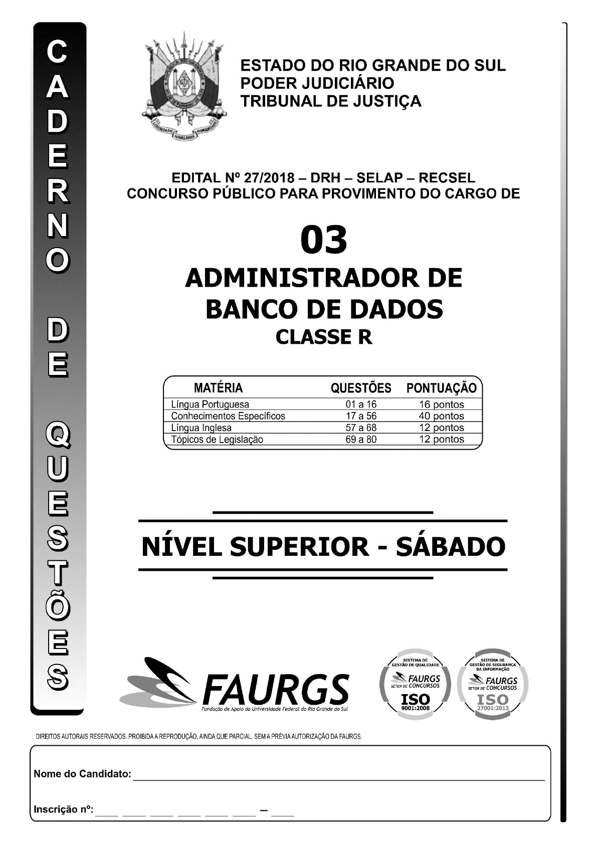 FAURGS – TJ - RS – Edital 27/2018 – DRH-SELAP-RECSEL 03 – Administrador de Banco de Dados Pág. 1 FAURGS – TJ - RS – Edital 27/2018 – DRH-SELAP-RECSEL 03 – Administrador de Banco de Dados Pág. 2 FAURGS – TJ - RS – Edital 27/2018 – DRH-SELAP-RECSEL 03 – Administrador de Banco de Dados Pág. 3 Instrução: As questões 01 a 08 referem-se ao texto abaixo. Tanta coisa feia, suja e malvada acontecendo que, às vezes, dá vontade de esquecer de tudo. Nem que seja por duas horas. Isso a gente consegue com um livro – mas só de noite, no conforto do lar e deixando o celular no silencioso para não se deixar seduzir por avisos de mensagens que nunca, nem por um segundo, param de entrar. Assim como a aventura humana pode ser dividida em antes e depois da invenção da poltrona, nas palavras de Millôr Fernandes, o poder de concen- tração do homem está dividido em antes e depois das redes sociais. Dom Casmurro, a chegada à Lua, a própria internet: para nossa sorte, tudo aconteceu antes do Instagram e do Facebook. Se fosse agora, talvez Marie Curie parasse para uma selfie bem no instante de isolar os elementos, ou Proust procrastinasse com posts bem-humorados diante da dificuldade de escrever milhares de páginas. Sabe-se lá o que seria da civilização. Existem dois territórios em que desligar o telefone é sagrado – se não por vontade do usuário, para não tomar uma vaia dos demais presentes. No teatro e no cinema, celulares e seus vícios deveriam ficar no fundo do bolso e da bolsa. Não que volta e meia a luz de uma tela não perturbe o escuro. Pior: que o som de uma chamada não interrompa a cerimônia do espetáculo. “Não posso falar agora, liga mais tarde. (…) O quê? Depois a gente conversa, só vê se a Julinha tem ração e dá um beijo no Rex, quer dizer, dá um beijo na Julinha e vê se o Rex tem ração. (…) Beijo, te ligo na saída.” Mas o assunto deste texto é o prazer de esquecer da vida assistindo a um filme. Aqui entra o Festival de Cinema do Rio, que acabou na semana passada depois de dez dias e dezenas de filmes exibidos por módicos onze reais a cada sessão. Em Porto Alegre também tem disso. O Capitólio, o Santander, a Casa de Cultura Mario Quintana e mostras como o Fantaspoa e Ela na Tela, que começa neste final de semana e vai até 25 de outubro, trazem muitas joias a preços populares para a cidade – quando não no amor. E por amor. Entre os tantos filmes do Festival do Rio, dois que gostaria de recomendar. O primeiro tem irritado cinéfilos mais xiitas por se tratar de uma cinebiografia bem-humo- rada demais, talvez, de Jean-Luc Godard. Azar o deles. O Formidável, do diretor Michel Hazanavicius, que já ganhou o Oscar por O Artista, é muito bom. Se é que viu, Godard odiou. O filme trata do período em que, depois de filmar A Chinesa, Godard, aos 37 anos, casa com a atriz Anne Wiazemsky, então com 19, autora do livro que serviu de base para o roteiro. De charmoso e irresistível, nas palavras de Anne, ele vira um chato de galochas (embora com seus encantos) ao abraçar o maoísmo e renegar seus filmes anteriores. O Formidável reconstitui as passeatas de maio de 68 em Paris, faz referências ao modo de Godard filmar, é irônico na medida e traz um sensacional protagonista, o ator Louis Garrel. É um filme para sair feliz do cinema, exatamente a sensação que o mestre não queria proporcionar a seus espectadores. E mais não conto para não dar spoiler. O segundo filme é O Artista do Desastre. O espec- tador ri até sem querer da reconstituição do “Cidadão Kane dos filmes ruins”, The Room. James Franco faz o papel de diretor do pior filme do mundo – e também é o diretor e produtor na vida real. Indo para casa de metrô, só tinha um pensamento: que bom vencer a preguiça e sair de casa em um domingo frio e chuvoso para ser feliz por duas horas. Adaptado de: TAJES, Claudia. Cinema também é resistência. Zero Hora, Caderno Donna, Porto Alegre, 24 de outubro de 2017. Disponível em http://revistadonna.clicrbs.com.br/ coluna/claudia-tajes-cinema-tambem-e-resistencia/. Acesso em 12/05/2018. 01. Em qual das frases abaixo NÃO ocorre elipse? (A) Nem que seja por duas horas. (l. 02-03) (B) Em Porto Alegre também tem disso. (l. 34-35) (C) Azar o deles. (l. 43) (D) Se é que viu, Godard odiou. (l. 45-46) (E) E mais não conto para não dar spoiler. (l. 58-59) 02. Em qual das alternativas abaixo a preposição NÃO introduz um adjunto adverbial? (A) com um livro (l. 03-04) (B) de noite (l. 04) (C) por avisos de mensagens (l. 05-06) (D) para nossa sorte (l. 12) (E) até 25 de outubro (l. 37-38) 03. Assinale a alternativa que apresenta análise morfo- lógica e análise sintática corretas. (A) Artigo um (l. 06) na função sintática de adjunto adnominal. (B) Numeral dois (l. 19) na função sintática de adjunto adverbial. (C) Artigo uma (l. 21) na função sintática de adjunto adnominal. (D) Numeral dois (l. 40) na função sintática de adjunto adverbial. (E) Numeral um na expressão É um filme (l. 56), na função sintática de adjunto adnominal. 01. 02. 03. 04. 05. 06. 07. 08. 09. 10. 11. 12. 13. 14. 15. 16. 17. 18. 19. 20. 21. 22. 23. 24. 25. 26. 27. 28. 29. 30. 31. 32. 33. 34. 35. 36. 37. 38. 39. 40. 41. 42. 43. 44. 45. 46. 47. 48. 49. 50. 51. 52. 53. 54. 55. 56. 57. 58. 59. 60. 61. 62. 63. 64. 65. 66. 67. FAURGS – TJ - RS – Edital 27/2018 – DRH-SELAP-RECSEL 03 – Administrador de Banco de Dados Pág. 4 04. Em relação à oração Existem dois territórios (l. 19), é correto afirmar que (A) este é um exemplo de oração sem sujeito. (B) o seu sujeito é indeterminado, uma vez que o verbo está conjugado na terceira pessoa do plural. (C) a expressão dois territórios (l. 19) é objeto direto da forma verbal existem (l. 19). (D) o sujeito concorda em número e pessoa com o predicado. (E) o sujeito não concorda com o predicado, por tratar-se de um caso de verbo impessoal, com sentido de existir. 0