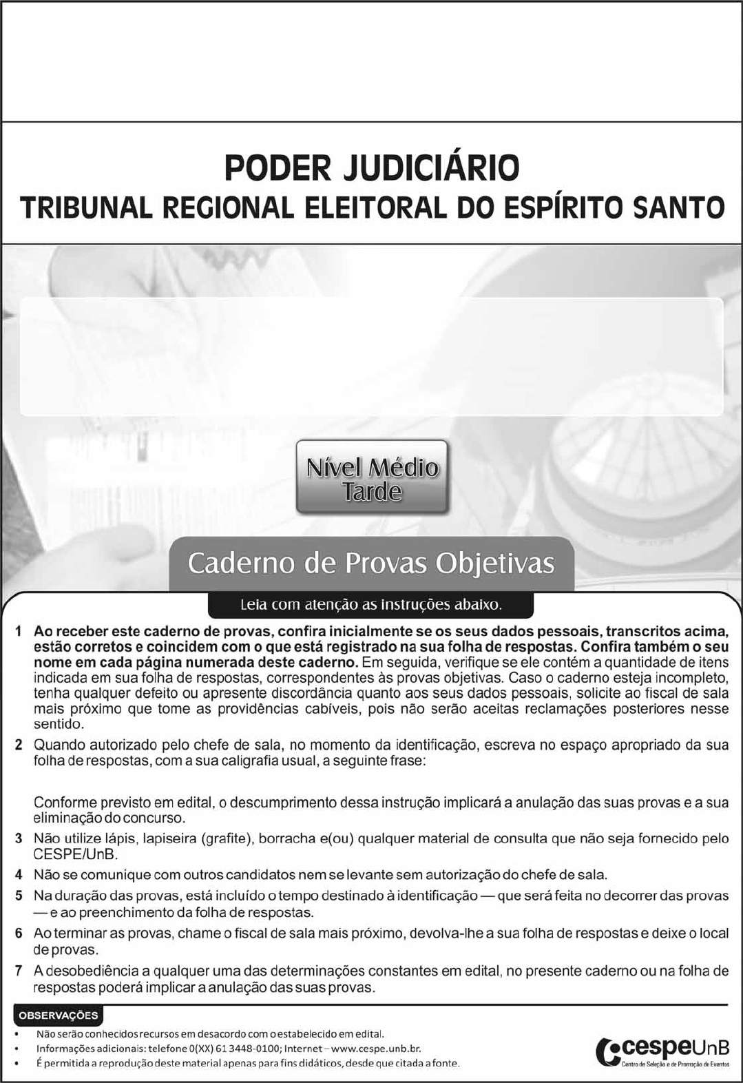 UnB/CESPE – TRE/ES – 1 – • De acordo com o comando a que cada um dos itens a seguir se refira, marque, na folha de respostas, para cada item: o campo designado com o código C, caso julgue o item CERTO; ou o campo designado com o código E, caso julgue o item ERRADO. A ausência de marcação ou a marcação de ambos os campos não serão apenadas, ou seja, não receberão pontuação negativa. Para as devidas marcações, use a folha de respostas, único documento válido para a correção das suas provas objetivas. • Nos itens que avaliam conhecimentos de informática, a menos que seja explicitamente informado o contrário, considere que todos os programas mencionados estão em configuração padrão, em português, que o mouse está configurado para pessoas destras, que expressões como clicar, clique simples e clique duplo referem-se a cliques com o botão esquerdo do mouse e que teclar corresponde à operação de pressionar uma tecla e, rapidamente, liberá-la, acionando-a apenas uma vez. Considere também que não há restrições de proteção, de funcionamento e de uso em relação aos programas, arquivos, diretórios, recursos e equipamentos mencionados. CONHECIMENTOS BÁSICOS No artigo 68 do Ato das Disposições Constitucionais1 Transitórias, dispôs a Carta Magna de 1988: “Aos remanescentes das comunidades dos quilombos que estejam ocupando suas terras é reconhecida a propriedade definitiva,4 devendo o Estado emitir-lhes os títulos respectivos.” Era o reconhecimento de um direito. Restava regulamentar a forma pela qual esse direito seria garantido. Em novembro de 2003,7 o presidente da República assinou o Decreto n.º 4.877, que estabelece, em seu artigo 2.º: “Consideram-se remanescentes das comunidades dos quilombos, para os fins deste decreto, os10 grupos étnico-raciais, segundo critérios de autoatribuição, com trajetória histórica própria, dotados de relações territoriais específicas, com presunção de ancestralidade negra relacionada13 com a resistência à opressão histórica sofrida.” E, logo em seguida, o parágrafo primeiro do mesmo artigo reafirma e esclarece: “Para os fins deste decreto, a16 caracterização dos remanescentes das comunidades dos quilombos será atestada mediante autodefinição da própria comunidade.”19 Essa regulamentação resultou naquilo que o professor Denis Rosenfield descreveu como “ressemantização da palavra quilombo”; segundo ele, “o quilombo já não significaria um22 povoado formado por escravos negros (...), mas uma identidade cultural.” O Estado de S.Paulo, 29/11/2010 (com adaptações). Com relação aos sentidos e a aspectos linguísticos do texto acima, julgue os itens a seguir. 1 O vocábulo ‘presunção’ (R.13) é empregado no texto com o sentido de suposição que se tem como verdadeira. 2 De acordo com os sentidos do texto, a palavra ‘ressemantização’ (R.21) pode, sem prejuízo para a informação do período, ser substituída por ressignificação. 3 Nas linhas de 2 a 14, os trechos entre aspas são citações literais de texto de natureza jurídica. 4 Em “emitir-lhes” (R.5), o pronome exerce a função de objeto direto. 5 Prejudica-se a correção gramatical do período ao se substituir ‘Consideram-se’ (R.9) por São considerados. 6 Mantêm-se as informações do período ao se substituir a palavra ‘remanescentes’ (R.9) por descendentes. A expansão do agronegócio, segundo as Contas1 Regionais do Brasil 2004-2008, divulgadas pelo IBGE, foi um notável vetor de crescimento das regiões menos desenvolvidas. A cana-de-açúcar, a soja e o café ajudaram Rondônia; as4 lavouras temporárias empurraram o Acre; o Amazonas sofreu percalços na área industrial, mas ganhou com a criação de gado, o café e o cultivo de frutas cítricas.7 Em Roraima, municípios como Normandia e Pacaraima deram alento ao cultivo de cereais. Também no Tocantins, no Maranhão, no Ceará, em Pernambuco, na Bahia10 e no Piauí o agronegócio teve peso decisivo. A produtividade da soja, no Piauí, foi a maior do país (3.231 kg/ha). A agropecuária contribuiu para as economias de Minas Gerais e,13 ainda mais, do Mato Grosso do Sul, do Mato Grosso e de Goiás. No Rio Grande do Sul e no Rio Grande do Norte, problemas climáticos afetaram o setor e, consequentemente, as16 economias locais. Em todo o país, os setores da construção civil e os serviços contribuíram para o aumento da riqueza. Eles indicam19 aumento da oferta de crédito e renda dos trabalhadores e acesso da população a serviços públicos e pessoais, comunicações, hotelaria e transporte.22 Idem, ibidem. Julgue os itens que se seguem, a respeito dos sentidos e de aspectos textuais e gramaticais do texto acima. 7 Em “contribuíram”, o emprego do acento gráfico justifica-se pela presença de ditongo em sílaba tônica. 8 O pronome “Eles” (R.19) retoma o antecedente “os setores da construção civil e os serviços” (R.18-19). 9 Mantém-se a informação do segundo período, ao se substituir o vocábulo “percalços” (R.6) por qualquer uma das seguintes palavras: dificuldades, transtornos, contratempos. 10 Na linha 10, as vírgulas logo após “Tocantins”, “Maranhão”, “Ceará” e “Pernambuco” justificam-se por isolarem termos de mesma função sintática componentes de uma enumeração. 11 Depreende-se das informações do texto que o Piauí foi o estado que produziu maior quantidade de soja em todo o Brasil. UnB/CESPE – TRE/ES – 2 – Considerando que os itens seguintes, na ordem em que estão apresentados, são partes sucessivas de um texto adaptado do jornal Estado de Minas de 29/11/2010, julgue-os com referência à correção gramatical. 12 Reforçado por 1,6 milhão de assinaturas colhidas em todo o país, tendo o eleitorado de Minas liderado a participação popular, a Lei da Ficha Limpa tornou-se o marco de um novo posicionamento da sociedade em relação da moralização da ad