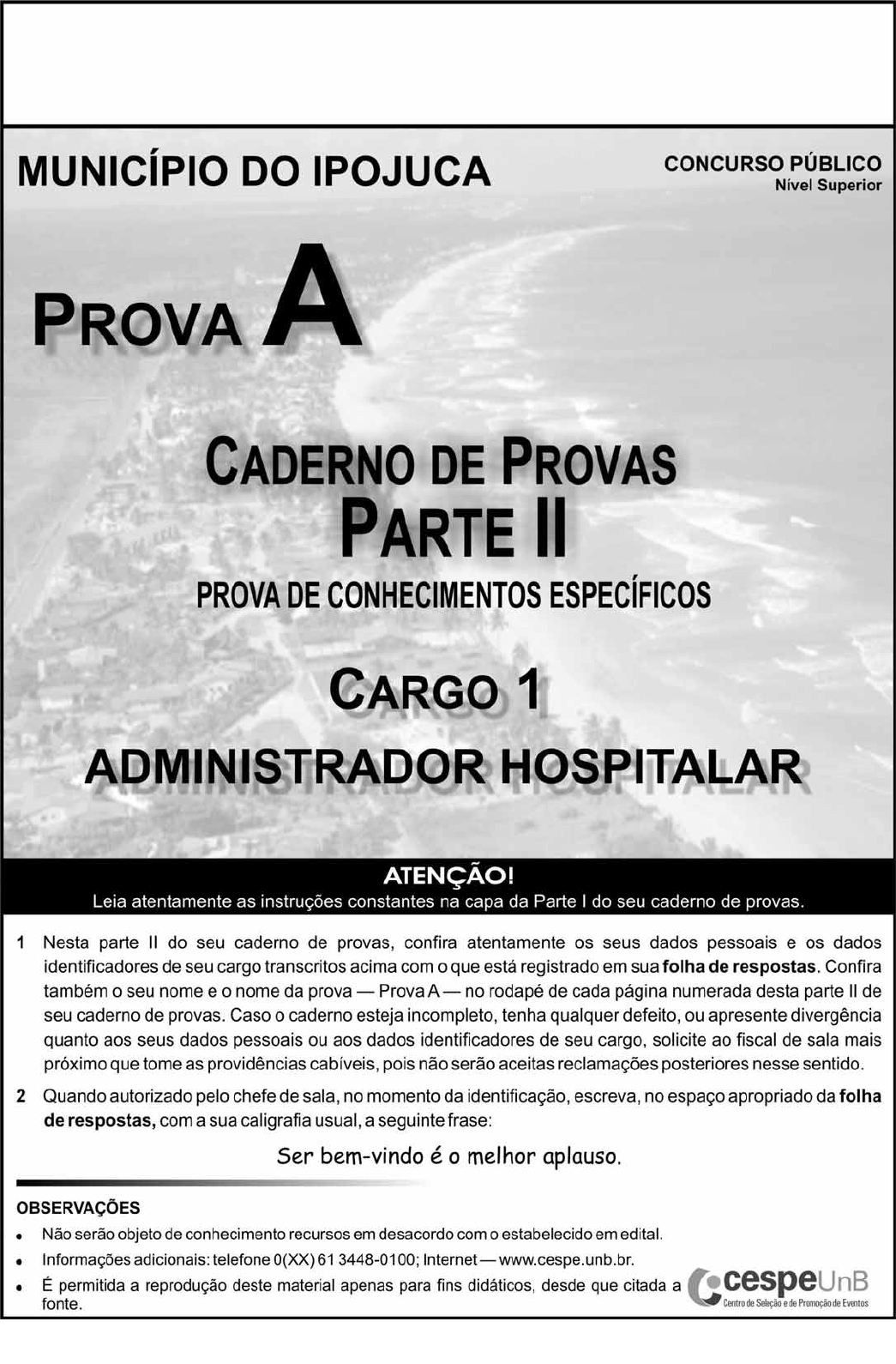 UnB/CESPE – IPOJUCA Prova A – 1 – CONHECIMENTOS ESPECÍFICOS Quanto à teoria geral da administração, julgue os itens a seguir. 51 A análise do ambiente interno, que trata de ameaças e oportunidades, e do ambiente externo, que identifica pontos fortes e fracos, é ferramenta essencial para o administrador hospitalar. 52 A administração científica, estruturada por Taylor, é embasada no estudo de tempos e movimentos, na padronização de ferramentas e do modo de fazer e na separação entre planejamento e execução. 53 A teoria da hierarquia das necessidades, preconizada por Maslow, parte da premissa de que o indivíduo deve se comportar no sentido de suprir as suas necessidades mais imediatas, priorizadas na seguinte escala: fisiológicas, de segurança, sociais, de estima e de autorrealização. A respeito de instituições de direito público e privado, julgue os itens que seguem. 54 Embora hospitais públicos não tenham por objetivo a obtenção de lucro, essas instituições devem buscar resultados positivos, uma vez que isso significa a ampliação de cobertura ou a melhoria dos serviços. 55 O ciclo de vida do ativo patrimonial encerra-se com a remoção, que no hospital privado, por meio da alienação do bem, é realizada sem dificuldade. No hospital público, por sua vez, a renovação se dá obrigatoriamente por meio da doação de bens a instituições de caridade previamente autorizadas pela comissão de alienação. 56 A controladoria exerce as funções de planejamento, de controle e de organização, sendo de sua responsabilidade promover a rentabilidade do negócio. Por isso, a controladoria é exclusiva de instituições de direito privado. Com relação ao planejamento estratégico, julgue os próximos itens. 57 O planejamento estratégico situacional (PES) possui quatro etapas previstas que se entrelaçam, a explicativa, a normativa, a estratégica e a tático-operacional. 58 O planejamento operacional descreve um processo interativo de áreas internas considerando as expectativas acerca de quando, onde e como as atividades se desenvolverão. Dessa forma, esse tipo de planejamento trata das certezas contidas na programação das atividades, em contraposição ao alto grau de incerteza de que trata o planejamento estratégico. Acerca da administração metodológica, julgue os itens subsequentes. 59 Espiral de projetos é a representação gráfica de um conceito de desenvolvimento de projetos ou processos. Ela é utilizada para estudos e projeções que envolvem grandes desafios e alta complexidade, como a implantação de um hospital, ou de projetos de modernização. 60 Programas podem ser considerados intervenções estruturadas que organizam uma unidade operacional ou um conjunto dessas unidades com a mesma abordagem, por objetivos e metas. Sem eles os resultados da missão institucional não ocorrerão espontaneamente. 61 Os modelos de avaliação externa da qualidade incluem a acreditação hospitalar, a certificação, os critérios de excelência e o ciclo PDCA. 62 Indicadores hospitalares são ferramentas para o contínuo acompanhamento e a retroalimentação das ações em andamento, além de base de informações confiáveis que compõem o histórico institucional. No que concerne à administração de serviços assistenciais, julgue os itens seguintes. 63 São comissões obrigatórias do hospital: de ética, de infecção hospitalar, de gerenciamento de riscos e de revisão de óbitos. 64 A abordagem metodológica conhecida como medicina embasada em evidências fornece excelentes provas que facilitam a decisão clínica. Essas provas são pesquisadas de forma sistemática e necessariamente empregam regras claras, que garantem o rigor científico. 65 No sistema de dose-unitária, a farmácia hospitalar separa a medicação e os correlatos a serem administrados em 24 horas para cada paciente, em uma única tira com vários compartimentos diferentes e separados de acordo com o horário de administração descrito na prescrição. 66 São funções da comissão de controle de infecção hospitalar (CCIH) educar continuamente o pessoal em todos os níveis, determinar e providenciar a implementação efetiva de políticas hospitalares relacionadas à investigação, ao controle e à prevenção de infecções e estabelecer o sistema de investigação epidemiológica. UnB/CESPE – IPOJUCA Prova A – 2 – Com relação à administração de recursos humanos, julgue os itens a seguir. 67 A gestão de pessoas possui papel estratégico na organização e deve ser estruturada em quatro frentes básicas: recrutamento e seleção; remuneração, benefícios e controle; capacitação, desenvolvimento e avaliação; e atenção ao profissional. 68 O empowerment, ou empoderamento, pode ser conceituado como a criação ou o fortalecimento do poder decisório nas mãos das pessoas da organização. Com isso, a empresa tende a desenvolver colaboradores mais atentos, comprometidos, motivados e criativos. No que se refere à administração de recursos materiais e patrimoniais, julgue os próximos itens. 69 Para que uma codificação se torne uma ferramenta efetiva de controle e facilitadora da gestão de materiais, é necessário que a estrutura estabelecida para ela atenda a requisitos como expansividade (o sistema de codificação deve aceitar ou comportar um aumento no rol de sua classificação), unicidade (possibilita identificar ou indicar características do material) e operacionalidade (facilidade de aplicação a processos manuais, mecânicos ou eletrônicos). 70 Itens de consumo regular ou de estoque são itens de consumo previsível, cuja compra deve ser embasada, principalmente, em consumo médio. Para esses itens, os pedidos de compra devem ser feitos apenas para reposição de estoque ou quando os pontos de ressuprimento forem atingidos. 71 A classificação XYZ é um método de análise qualitativa que determina a criticidade dos materiais e dos