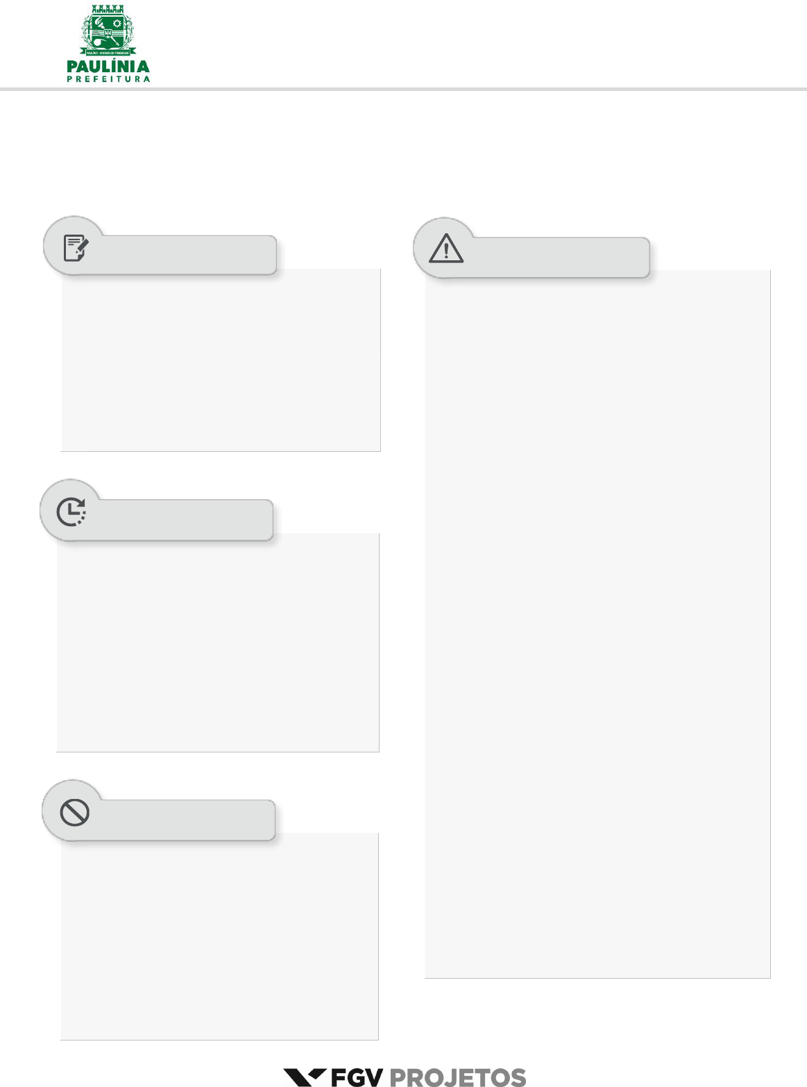 Prefeitura Municipal de Paulínia Concurso Público 2016 TARDE Nível Superior Procurador Tipo 1 – BRANCA Além deste caderno de prova, contendo sessenta questões objetivas e uma questão discursiva, você receberá do fiscal de sala: uma folha destinada às respostas das questões objetivas. uma folha de texto definitivo destinada à questão discursiva. As questões objetivas têm cinco alternativas de resposta (A, B, C, D, E) e somente uma delas está correta; Verifique se seu caderno está completo, sem repetição de questões ou falhas. Caso contrário, notifique imediatamente o fiscal da sala, para que sejam tomadas as devidas providências; Confira seus dados pessoais, especialmente nome, número de inscrição e documento de identidade e leia atentamente as instruções para preencher a folha de respostas; Use somente caneta esferográfica, fabricada em material transparente, com tinta preta ou azul; Assine seu nome apenas nos espaços reservados; Marque na folha de respostas o campo relativo à confirmação do tipo/cor de prova, conforme o caderno recebido; O preenchimento das respostas da prova objetiva é de sua responsabilidade e não será permitida a troca de folha de respostas em caso de erro; Reserve tempo suficiente para o preenchimento de suas respostas. Para fins de avaliação, serão levadas em consideração apenas as marcações realizadas na folha de respostas da prova objetiva, não sendo permitido anotar informações relativas às respostas em qualquer outro meio que não seja o caderno de prova; A FGV coletará as impressões digitais dos candidatos na folha de respostas; Os candidatos serão submetidos ao sistema de detecção de metais quando do ingresso e da saída de sanitários durante a realização das provas. 5 (cinco) horas é o tempo disponível para a realização da prova, já incluído o tempo para a marcação da folha de respostas da prova objetiva; 3 (três) horas após o início da prova é possível retirar-se da sala, sem levar o caderno de provas; Os candidatos poderão levar o caderno de provas somente no término do período de prova. Qualquer tipo de comunicação entre os candidatos durante a aplicação da prova; Levantar da cadeira sem autorização do fiscal de sala; Usar o sanitário ao término da prova, após deixar a sala. SUA PROVA TEMPO NÃO SERÁ PERMITIDO INFORMAÇÕES GERAIS Prefeitura Municipal de Paulínia-SP FGV – Projetos Procurador Tipo 1 – Cor BRANCA – Página 3 Língua Portuguesa 1 Assinale a opção que indica a frase em que a troca de posição dos termos sublinhados acarreta mudança de sentido. (A) “Um excelente modo de fazer o bem é a firme decisão de combater o mal.” (B) “A ética é a estética de dentro.” (C) “A pintura é poesia silenciosa, a poesia é pintura que fala.” (D) “A pintura é uma poesia que se vê e não se sente, e a poesia é uma pintura que se sente e não se vê.” (E) “Toda vez que pinto um retrato, perco um amigo.” 2 Assinale a opção em que o termo em função adjetiva sublinhado está adequadamente substituído por um adjetivo. (A) “A força do direito deve superar o direito da força.” / legal (B) “A justiça sem força é inútil, a força sem justiça é tirana.” / impávida (C) “Um financista é um agiota com imaginação.” / imaginário (D) “Realizar o impossível significa apenas que o chefe o incluirá nas suas tarefas de todos os dias.” / diaristas (E) “Muitos empregados, que se queixam da estupidez dos patrões, estariam desempregados se eles fossem mais espertos.” / pátrio 3 Em todas as frases a seguir, o conectivo sublinhado tem uma forma equivalente, à exceção de uma. Assinale-a. (A) “A fala é um efeito natural; mas, de um modo ou de outro, a natureza deixa o homem escolher aquele que mais lhe agrada.” / entretanto (B) “O que eu via parecia um sorriso do universo: pois minha embriaguez entrava pelos ouvidos e pelos olhos.” / portanto (C) “Se colocassem sob os nossos olhos aquelas coisas que nos fazem atravessar os mares para conhecê-las, nem faríamos caso delas.” / caso (D) “O homem que viaja para ver o mundo todo, cheio de tantas maravilhas, é como um sapo na sua poça d’água.” / tal qual (E) “Viajar é a ruína de toda felicidade! Não se consegue mais olhar para um edifício aqui depois de ter visto a Itália.” / após 4 Assinale a opção que apresenta o pensamento em que ocorreu a substantivação do termo sublinhado. (A) “O corpo é um dos nomes da alma, e não o mais indecente.” (B) “Se existe alguma coisa sagrada, esta é o corpo humano.” (C) “A amizade mais sólida é aquela entre os iguais.” (D) “Que o teu corpo não seja a primeira cova do teu esqueleto.” (E) “O espírito está pronto, mas a carne é fraca.” 5 Assinale a opção que apresenta a frase machadiana em que o vocábulo mesmo/mesma/mesmos/mesmas tem valor semântico diferente dos demais. (A) “Nem tudo é lealdade, nem tudo é resistência na mesma família.” (B) “Sem ter passado pelas provas da experiência, é muito raro dizer coisa com coisa a respeito do que apenas se vê em outros que não são da mesma espécie.” (C) “Não é preciso ter as mesmas ideias para dançar a mesma quadrilha.” (D) “O acaso é um deus e um diabo ao mesmo tempo.” (E) “Não será difícil achar a semelhança entre uma eleição e uma mágica: destacam-se em ambas as mesmas tramoias.” 6 As frases a seguir – de Machado de Assis – apresentam intertextualidades em relação a algum texto conhecido, à exceção de uma. Assinale-a. (A) “Não só de fé vive o homem, mas também de pão e seus compostos e similares.” (B) “O futuro a Deus pertence, dizem os cristãos.” (C) “O povo, graças à ilusão da Providência, costuma dizer que Deus dá o frio conforme a roupa.” (D) “As pessoas que foram crianças não esqueceram decerto a velha questão que se lhes propunha sobre qual nasceu primeiro, se