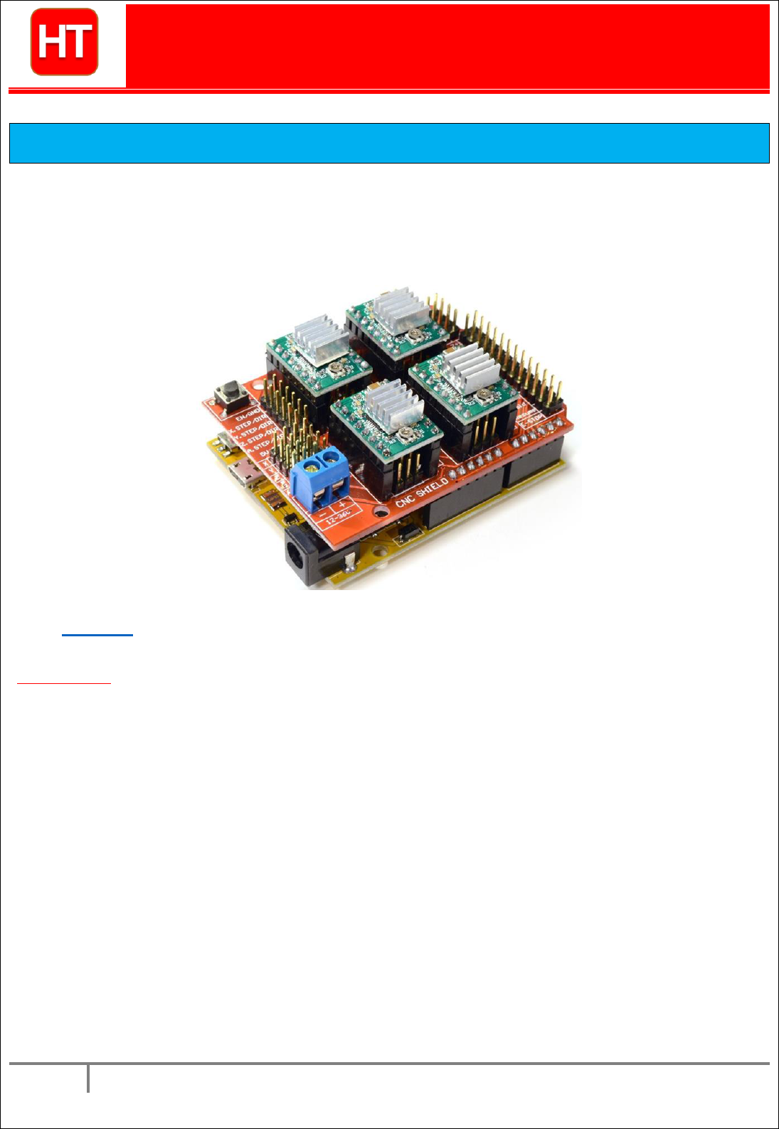1 www.handsontec.com Handson Technology User Manual 3-Axis CNC/Stepper Motor Shield for Arduino The Arduino CNC Shield makes it easy to get your CNC projects up and running in a few hours. It uses opensource firmware on Arduino to control 4 stepper motors using 4 pieces of A4988 Stepper Motor driver breakout board, with this shield and ArduinoUno/Mega, you can build all kinds of robotics, linear motion project or projects including CNC routers, laser cutters and even pick&place machines. SKU: DRV1001 Brief Data: GRBL 0.9 compatible. (Open source firmware that runs on an Arduino UNO that turns G-code commands into stepper signals) 4-Axis support (X, Y, Z , A-Can duplicate X,Y,Z or do a full 4th axis with custom firmware using pins D12 and D13) 2 x End stops for each axis (6 in total) Coolant enable Uses removable A4988 compatible stepper drivers. (A4988, DRV8825 and others)(Not Included) Jumpers to set the Micro-Stepping for the stepper drivers. (Some drivers like the DRV8825 can do up to 1/32 micro-stepping ) Compact design. Stepper Motors can be connected with 4-pin Molex connectors or soldered in place. Runs on 12-36VDC. (At the moment only the DRV8825 drivers can handle up to 36V so please consider the operation voltage when powering the board.) 2 www.handsontec.com Table of Contents 1. Configuring Micro Stepping for Each Axis ..................................................................................................................... 3 2. GRBL Control Software/Firmware for Arduino ............................................................................................................. 4 3. Hooking Up the Stepper Motor to CNC Shield .............................................................................................................. 7 4. G-Code Sender .............................................................................................................................................................. 8 5. Recommended Driver Board & Accessory .................................................................................................................. 10 3 www.handsontec.com 1. Configuring Micro Stepping for Each Axis Each axis has 3 jumpers that can be set to configure the micro stepping for the A4988 plug-in driver board. Micro-stepping jumper location, before inserting A4988. In the tables below „High‟ indicates that a jumper is insert and „Low‟ indicates that no jumper is inserted. MS0 MS1 MS2 Microstep Resolution Low Low Low Full Step High Low Low ½ Step Low High Low ¼ Step High High Low 1 /8 Step High High High 1 /16 Step 4 www.handsontec.com After setting the microstep jumper, you can plug-in A4988 driver boards as shown in the photo below. The photo also shown this CNC sit nicely on top of Arduino Uno board, without any external jumper wires. !!! Beware of the orientation of the A4988 driver boards! You will destroy the A4988 driver board if plug-in with wrong orientation. 2. GRBL Control Software/Firmware for Arduino Before you can use this CNC shield with Arduino, a control firmware need to be downloaded into Arduino board. We are going to use „GRBL‟ to accomplish our job. GRBL is open-source software that runs on an Arduino Uno that takes G-Code commands via Serial and turns the commands into motor signals. Grbl is a no-compromise, high performance, low cost alternative to parallel-port-based motion control for CNC machine. It accepts standards-compliant g-code and has been tested with the output of several CAM tools with no problems. Arcs, circles and helical motion are fully supported, as well as, all other primary g-code commands. Macro functions, variables, and most canned cycles are not supported, but we think GUIs can do a much better job at translating them into straight g-code anyhow. A copy of this open-source firmware can be downloaded from the below link: Following the below steps to prepare this CNC Shield board to function properly: 1. Download a copy of GRBL from: https://github.com/grbl/grbl 5 www.handsontec.com Unzip this file into your local hardisk location, you may want to create a special new folder for this purpose for easy locating of all files needed in your project. Locate an Arduino sketch „grblUpload.ino‟ in this folder where you have unzip the files. Below is the files structures located in my local hardisk: Open up this sketch „grblUpload.ino‟ and you should see the screen as below: 6 www.handsontec.com Click the upload icon as usual to „compile/upload‟ as you normally upload Arduino sketch. When you see „done uploading‟, click the „Serial Monitor‟ on Arduino IDE as shown below: 7 www.handsontec.com If you can receive response message “ Grbl 0.9j ['$' for help] ” from your Serial Monitor, congratulation! You have successful uploaded the „GRBL‟ firmware into your Arduino board. 3. Hooking Up the Stepper Motor to CNC Shield Connect steppers motor to CNC Shield board as the below block diagram. of the CNC Shield connected to 3-stepper motor: Your CNC Shield board is now ready to go for a test run, let’s try to turn the motor as to our instruction !! 8 www.handsontec.com 4. G-Code Sender To send commands to your CNC/3-axis stepper motor driver board you need a g-code sender to send command and instruction. Download the Universal-G-Code-Sender. Universal GcodeSender is a Java based GRBL compatible cross platform G-Code sender. Use this program to run a GRBL controlled CNC machine. Once downloaded, connect the UNO board USB to your computer and take note of the COM port it is connected to. Run the start-windows.bat or the JAR file directly. You will be presented with the following screen: Click the “Machine Control” tab. Select the “Port” number which your Arduino board is attached to. Select 115200 as the Baud rate as this is the speed configured in “GRBL” firmware. Click “Open” button to start the communication for controlling this shield board. 9 www.handsonte