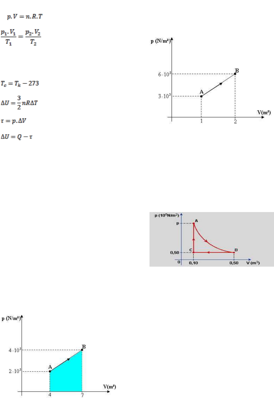 TERMODINÂMICA R=0,082 atm.L / mol.K R=8,31 J/ mol K 1) Qual a energia interna de 1,5 mols de um gás perfeito na temperatura de 20°C? 2) Quando são colocados 12 moles de um gás em um recipiente com êmbolo que mantém a pressão igual a da atmosfera, inicialmente ocupando 2m³. Ao empurrar-se o êmbolo, o volume ocupado passa a ser 1m³. Considerando a pressão atmosférica igual a 100000N/m², qual é o trabalho realizado sob o gás? 3) Sobre um sistema realiza-se um trabalho de 3000 J e, em conseqüência ele fornece 500 cal ao meio externo durante o mesmo intervalo de tempo. Se 1 cal = 4,2 J, determine a variação de energia do sistema. 4) Uma transformação é dada pelo gráfico abaixo: Qual o trabalho realizado por este gás? 5) O gráfico abaixo ilustra uma transformação 100 moles de gás ideal monoatômico recebem do meio exterior uma quantidade de calor 1800000 J. Determine: a) o trabalho realizado pelo gás; b) a variação da energia interna do gás; c) a temperatura do gás no estado A. 6) Classifique cada transformação presente no diagrama de Clapeyron em transformação isobárica, transformação isotérmica e transformação isovolumétrica. Escreva como ficaria a 1ª lei da Termodinâmica em cada caso. A→B: ____________________________ B→C: ____________________________ C→A: ____________________________ 7) A Segunda Lei da Termodinâmica, estabelecida por Clausius, pode ser enunciada da seguinte forma: “O calor não passa espontaneamente de um corpo para outro de temperatura mais alta”. Poderíamos, assim como fizeram Kelvin e Planck, enunciar corretamente essa lei da seguinte maneira: A) “É impossível construir uma máquina térmica operando em ciclos cujo único efeito seja retirar calor de uma fonte e convertê-lo integralmente em trabalho.” B) “A entropia decresce nas transformações reversíveis.” C) “Para que uma máquina térmica consiga converter calor em trabalho, deve operar em ciclos entre fontes à mesma temperatura.” D) “Somente quando há duas fontes de calor, uma quente e uma fria, o calor pode ser completamente convertido em trabalho.” E) “É possível construir uma máquina de motoperpétuo, desde que se reduzam as perdas, igualando a entropia a zero.” 8) Um gás sofre duas transformações em sequência, primeiro uma transformação isométrica, onde recebe 200 joules de calor, em seguida uma transformação isobárica recebendo 150 joules de calor, conforme figura ao lado. Calcule em cada processo o trabalho realizado na transformação e a variação da energia interna do gás. 9) O gráfico abaixo ilustra uma transformação 100 moles de gás ideal monoatômico recebem do meio exterior uma quantidade de calor 1800000 J. Dado R=8,31 J/mol.K. Determine: a) o trabalho realizado pelo gás; b) a variação da energia interna do gás; c) a temperatura do gás no estado A. 10) A respeito da primeira lei da Termodinâmica, marque a alternativa incorreta: a) Em uma transformação isotérmica, a variação da energia interna é nula. b) A primeira lei da Termodinâmica trata da conservação da energia. c) Em uma transformação isocórica, não haverá realização de trabalho. d) Em uma transformação adiabática, o trabalho será realizado pelo gás quando a variação da energia interna é positiva. e) A primeira lei da Termodinâmica diz que o calor fornecido a um gás é igual à soma do trabalho realizado pelo gás e a sua variação da energia interna. 11) Em uma transformação termodinâmica sofrida por uma amostra de gás ideal, o volume e a temperatura absoluta variam como indica o gráfico a seguir, enquanto a pressão se mantém igual a 20 N/m 2 . Sabendo-se que nessa transformação o gás absorve 250 J de calor, pode-se afirmar que a variação de sua energia interna é de a) 100 J. b) 150 J. c) 250 J. d) 350 J. e) 400 J. 12) Um gás sofre a transformação termodinâmica cíclica ABCA representada no gráfico p × V. No trecho AB a transformação é isotérmica. Analise as afirmações: ( ) A pressão no ponto A é 2,5 × 10 5 N/m 2 . ( ) No trecho AB o sistema não troca calor com a vizinhança. ( ) No trecho BC o trabalho é realizado pelo gás e vale 2,0 × 10 4 J. ( ) No trecho CA não há realização de trabalho.