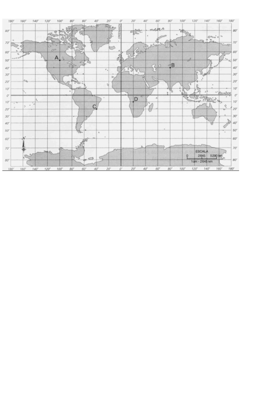 01 (UNICENTRO) Analise o mapa a seguir. (Disponível em: <http://f1colombo-geografando.blogspot.com.br/2011/04/mapas-coordenadas-geograficas.html>. Acesso em: 13 jul. 2013.) Assinale a alternativa que apresenta, correta e respectivamente, as coordenadas geográficas (latitude e longitude) dos pontos A, B, C e D marcados no mapa. a) 50°N e 100°L; 80°N e 40°O; 40°S e 20°L; 20°S e 10°O b) 50°N e 100°O; 40°N e 80°L; 20°S e 40°L; 10°S e 20°O c) 50°N e 100°O; 40°N e 80°L; 20°S e 40°O; 10°S e 20°L d) 100°S e 50°L; 80°S e 40°L; 20°N e 40°O; 20°N e 10°O e) 100°S e 50°O; 40°S e 80°O; 40°N e 20°L; 10°N e 20°L 02(MACKENZIE) Em um mapa com escala de 1: 70.000.000, foi traçada uma rota de navegação aérea entre dois pontos, A e B. O ponto A, está a 45° oeste de Greenwich, enquanto o ponto B, a 75° oeste de Greenwich. Entre os pontos A e B, a rota de navegação media, no mapa, 20 mm. Sabendo-se que um avião partiu de A para B, às 14h, no dia 7 de novembro, em um voo de 2 horas, está correto afirmar que a distância percorrida e o horário local de chegada foram, respectivamente, a) 14.000 km e às 16h. b) 140 km e às 10h. c) 1.400 km e às 14h. d) 1.400 km e às 16h. e) 140 km e às 16h. 03(UFPR) A figura abaixo é o recorte de uma carta topográfica contendo dois possíveis traçados para uma rodovia estadual, com elevado fluxo de caminhões. Considerando os traçados sugeridos, aponte o mais adequado à rodovia, justificando a escolha a partir da análise do recorte da carta topográfica.