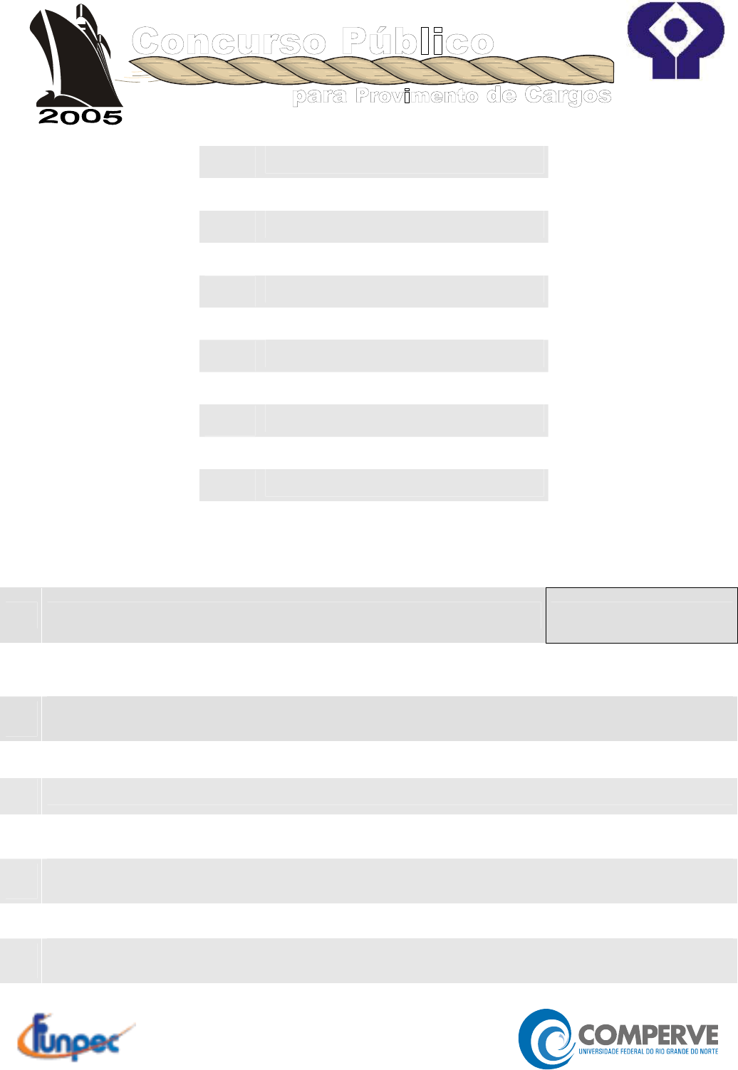 >� Eletricista de Manutenção >� Jatista >� Mecânico de Manutenção >� Operador de Guindaste >� Operador de Pá Mecânica >� Pedreiro >� Pintor Especializado >� Recepcionista >� Soldador >� Telefonista >� Torneiro Mecânico >� Trabalhador Portuário INSTRUÇÕES 1 Escreva seu Número de Inscrição no retângulo a seguir: 2 Este Caderno contém, respectivamente, 25 questões de Português e 15 questões de Matemática. 3 Confira se o Caderno está completo e sem imperfeições gráficas que possam dificultar a leitura. Se verificar algum problema, comunique-o, imediatamente, ao Fiscal. 5 Cada questão apresenta apenas uma opção de resposta correta. 6 Utilize qualquer espaço deste Caderno para rascunhos e não destaque nenhuma folha. 7 Você dispõe de, no máximo, três horas para responder às 40 questões e preencher a Folha de Respostas. 8 A interpretação das questões faz parte da avaliação. Portanto, não peça esclarecimentos aos Fiscais. 8 O preenchimento da Folha de Respostas é de sua inteira responsabilidade. 9 Antes de retirar-se definitivamente da Sala, devolva ao Fiscal este Caderno e a Folha de Respostas. para Provimento de Cargos Concurso Público CODERN www.pciconcursos.com.br www.pciconcursos.com.br CODERN 2005 Concurso Público 1 PORTUGUÊS 01 a 25 As questões de número 01 a 16 referem-se ao texto reproduzido a seguir. A melhor opção Todos começaram a dizer que o ouro é a melhor opção de investimento. Fernão Soropita deixou-se convencer e, não tendo recursos bastantes para investir na Bolsa de Zurique, mandou fazer uma dentadura de ouro maciço. 3 Substituir sua dentadura convencional por outra, preciosa e ridícula, valeu- lhe aborrecimentos. O protético não queria aceitar a encomenda; mesmo se esforçando por executá-la com perfeição, o resultado foi insatisfatório. O 6 aparelho não aderia à boca. Seu peso era demasiado. A cada correção diminuía o valor em ouro. E o ouro subindo de cotação no mercado internacional. O pior é que Fernão passou a ter medo de todos que se aproximavam dele. O 9 receio de ser assaltado não o abandonava. Deixou de sorrir e até de abrir a boca. Na calçada a moça lhe perguntou onde ficava a rua Gonçalves Dias. Respondeu inadvertidamente, e a moça ficou fascinada pelo brilho do ouro ao 12 sol. Daí resultou uma relação amorosa, mas Fernão não foi feliz. A jovem apaixonara-se pela dentadura e não por ele. Mal se tornaram íntimos, arrancou-lhe a dentadura enquanto ele dormia, e desapareceu com ela.15 ANDRADE, Carlos Drummond de. A melhor opção. In:___. Rick e a Girafa. São Paulo: Ática, 2001, p. 68-69. (Coleção Para Gostar de Ler Júnior – v. 3). 01. Observe o trecho abaixo: “[...] a moça ficou fascinada pelo brilho do ouro ao sol.” O sentido da palavra sublinhada equivale a: A) chateada B) bronzeada C) encantada D) irritada O trecho a seguir servirá de base para as questões 02 e 03. "O receio de ser assaltado não o abandonava." (linhas 9 - 10) 02. As palavras sublinhadas são, respectivamente, A) pronome e artigo. B) artigo e pronome. C) artigo e artigo. D) pronome e pronome. 03. É antônimo da palavra receio: A) coragem B) pavor C) medo D) temor www.pciconcursos.com.br CODERN 2005 Concurso Público 2 As questões 4 e 5 referem-se ao trecho que segue: “A cada correção diminuía o valor em ouro.” 04. A palavra correção forma o plural do mesmo modo que: A) alemão C) relação B) mão D) pão 05. O verbo diminuir encontra-se no: A) pretérito perfeito B) pretérito imperfeito C) futuro do presente D) futuro do pretérito O trecho a seguir servirá de base para as questões 06, 07 e 08. "O protético não queria aceitar a encomenda; mesmo se esforçando por executá-la com perfeição, o resultado foi insatisfatório." (linhas 5 - 6) 06. Em termos de significado, protético pertence à mesma “família” do seguinte par de palavras: A) brilho − ouro C) perfeição − aborrecimento B) investimento − valor D) boca − dentadura 07. A forma verbal executá-la poderia ser substituída por: A) aceitá-la C) recebê-la B) fazê-la D) tomá-la 08. É sinônimo da palavra insatisfatório: A) agradável C) ruim B) aceitável D) positivo O trecho a seguir servirá de base para as questões 09 e 10. "[...] não tendo recursos bastantes para investir na Bolsa de Zurique [...]" 09. A forma verbal tendo denomina-se: A) gerúndio C) infinitivo impessoal B) particípio D) imperativo negativo 10. A palavra bastante está no plural porque concorda com o A) verbo investir. C) verbo ter. B) adjetivo. D) substantivo. www.pciconcursos.com.br CODERN 2005 Concurso Público 3 O trecho abaixo servirá de base para as questões 11, 12 e 13. "Mal se tornaram íntimos, arrancou-lhe a dentadura enquanto ele dormia, e desapareceu com ela.” (linhas 14 - 15) 11. Marque a opção correspondente ao número de formas verbais que o trecho contém: A) dois C) quatro B) três D) cinco 12. É antônimo da palavra desapareceu: A) partiu B) sumiu C) fugiu D) surgiu 13. Os pronomes pessoais lhe e ela são, respectivamente, A) oblíquo e reto. B) reto e oblíquo. C) oblíquo e oblíquo. D) reto e reto. Os dois trechos a seguir servirão de base para as questões 14 e 15. "Seu peso era demasiado." (linha 7) "Daí resultou uma relação amorosa [...]" (linha 13) 14. É sinônimo da palavra demasiado: A) exagerado B) exato C) ideal D) incalculável 15. As palavras seu e uma se classificam, respectivamente, em A) pronome pessoal e artigo definido. B) pronome possessivo e artigo definido. C) pronome pessoal e artigo indefinido. D) pronome possessivo e artigo indefinido. www.pciconcursos.com.br CODERN 2005 Concurso Público 4 16. Em: "A jovem apaixonara-se pela dentadura [...]", o masculino de jovem é formado como o da palavra sublinhada na seguinte frase: A) O cantor foi muito aplaudido. B) O tigre é um animal feroz. C) O cientista dedicou sua vida à pesquisa. D) O indivíduo entrou no carr