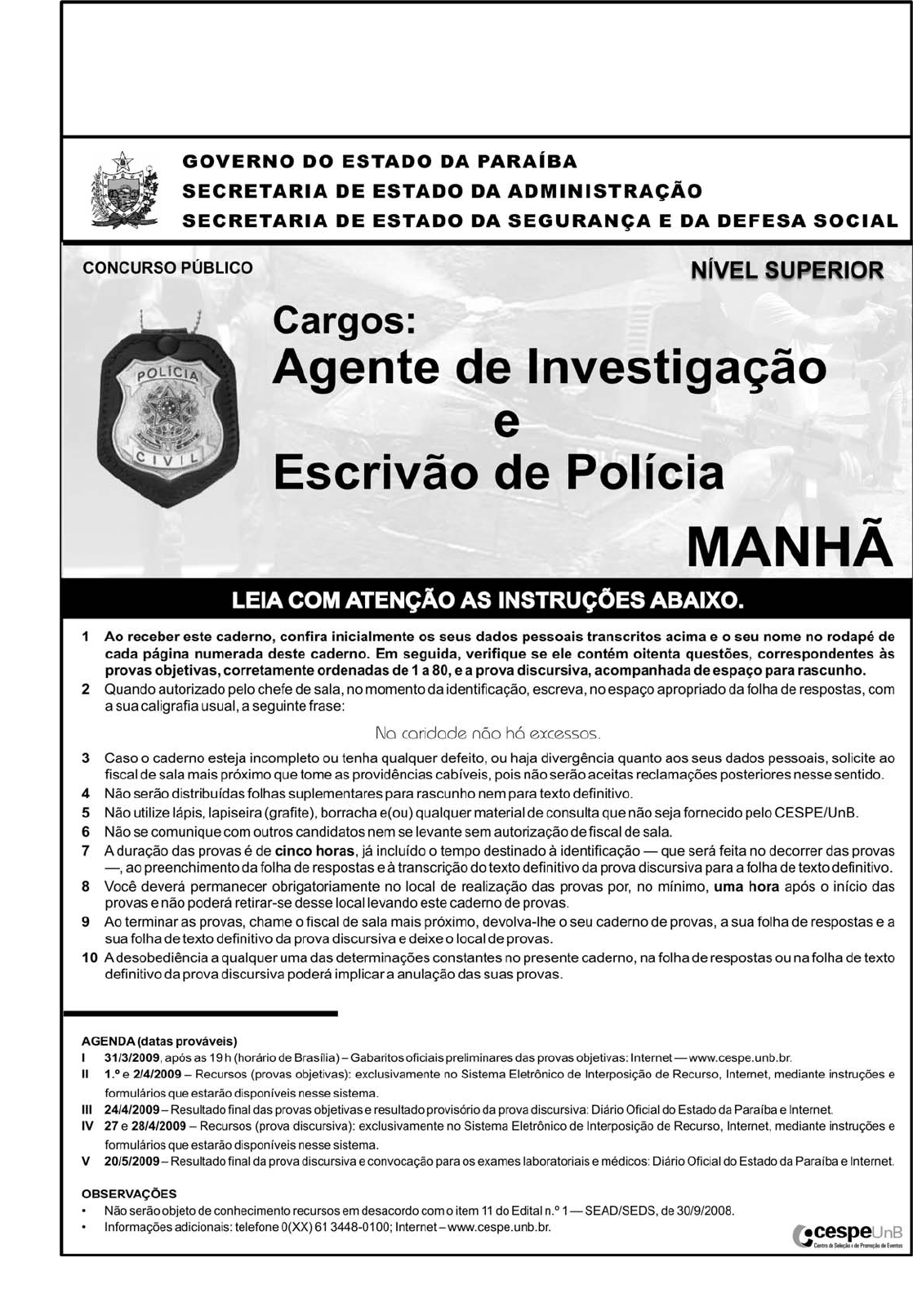 pcimarkpci MDAwMDowMDAwOjAwMDA6MDAwMDowMDAwOmZmZmY6YThlNDo5ZjAx:RnJpLCAyOSBNYXIgMjAxOSAxNDowODo0OSAtMDMwMA== www.pciconcursos.com.br pcimarkpci MDAwMDowMDAwOjAwMDA6MDAwMDowMDAwOmZmZmY6YThlNDo5ZjAx:RnJpLCAyOSBNYXIgMjAxOSAxNDowODo0OSAtMDMwMA== UnB/CESPE – SEAD/SEDS/PCPB Cargos: Agente de Investigação e Escrivão de Polícia – 1 – • Nas questões de 1 a 80, marque, para cada uma, a única opção correta, de acordo com o respectivo comando. Para as devidas marcações, use a Folha de Respostas, único documento válido para a correção das suas provas. • Nas questões que avaliam Noções de Informática, a menos que seja explicitamente informado o contrário, considere que: todos os programas mencionados estão em configuração-padrão, em português; o mouse está configurado para pessoas destras; expressões como clicar, clique simples e clique duplo referem-se a cliques com o botão esquerdo do mouse; teclar corresponde à operação de pressionar uma tecla e, rapidamente, liberá-la, acionando-a apenas uma vez. Considere também que não há restrições de proteção, de funcionamento e de uso em relação aos programas, arquivos, diretórios, recursos e equipamentos mencionados. CONHECIMENTOS BÁSICOS Texto para as questões de 1 a 3 As mudanças e transformações globais nas estruturas políticas e econômicas no mundo contemporâneo colocam em relevo as questões de identidade e as lutas pela afirmação e manutenção das identidades nacionais e étnicas. Mesmo que o passado que as identidades atuais reconstroem seja, sempre, apenas imaginado, ele proporciona alguma certeza em um clima que é de mudança, fluidez e crescente incerteza. As identidades em conflito estão localizadas no interior de mudanças sociais, políticas e econômicas, mudanças para as quais elas contribuem. Tomaz Tadeu da Silva (Org.). Stuart Hall e Kathryn Woodward. Identidade e diferença — A perspectiva dos estudos culturais. Petrópolis: Vozes, 2004, p. 24-5 (com adaptações). QUESTÃO 1 A argumentação textual se apoia na ideia de que A as transformações globais decorrem de conflitos de identidades nacionais e étnicas. B as lutas pela afirmação e manutenção das estruturas globais são necessárias. C as identidades atuais padecem de incerteza porque são apenas imaginadas. D as identidades não são fixas e integram as mudanças sociais e políticas. E as lutas pelas transformações sociais são o conflito de identidades. QUESTÃO 2 Os itens abaixo apresentam propostas de reescrita para a oração inicial do texto. Julgue-os quanto à concordância verbal e nominal. I A mudança e a transformação global na estrutura política e econômica no mundo contemporâneo coloca em relevo as questões de identidade. II A mudança e a transformação globais nas estruturas políticas e econômicas no mundo contemporâneo coloca em relevo as questões de identidade. III A existência de mudanças e transformações globais nas estruturas políticas e econômicas no mundo contemporâneo coloca em relevo as questões de identidade. IV O fato de as estruturas políticas e econômicas no mundo contemporâneo passarem por mudanças e transformações globais coloca em relevo as questões de identidade. Estão certos apenas os itens A I e II. B I e III. C II e III. D II e IV. E III e IV. QUESTÃO 3 Preservam-se a correção gramatical do texto e a coerência de sua argumentaçã,o ao se substituir, no início do segundo período, o conectivo “Mesmo que” por A Sendo que. B Ainda que. C Apesar de. D Embora. E Visto que. Texto para as questões 4 e 5 As mudanças na economia global têm produzido1 uma dispersão das demandas ao redor do mundo. Isso ocorre não apenas em termos de bens e serviços, mas também de mercados de trabalho. A migração dos trabalhadores não é,4 obviamente, nova, mas a globalização está estreitamente associada à aceleração da migração. E a migração produz identidades plurais, mas também identidades contestadas,7 em um processo que é caracterizado por grandes desigualdades em termos de desenvolvimento. Nesse processo, o fator de expulsão dos países pobres é mais forte10 que o fator de atração das sociedades pós-industriais e tecnologicamente avançadas. Idem, ibidem, p. 21 (com adaptações). QUESTÃO 4 Assinale a opção correspondente a relação de causa e efeito que se depreende da argumentação do texto. A A migração dos trabalhadores tem como causa a aceleração dos movimentos de globalização. B A formação de identidades plurais provoca mais resistência dos trabalhadores às mudanças na economia global. C A migração gera desigualdade de desenvolvimento e confronto entre países pobres e ricos. D A dispersão das demandas ao redor do mundo acelera a migração e a constituição de identidades plurais. E A atração que sociedades tecnologicamente avançadas exercem sobre os migrantes acarreta a expulsão de trabalhadores dos países pobres. QUESTÃO 5 O texto apresentaria erro gramatical caso se procedesse A à retirada da palavra “uma” (R.2). B à inserção da preposição de imediatamente antes do substantivo “serviços” (R.3). C à inserção da palavra uma logo antes de “aceleração” (R.6). D à retirada de “que é” (R.8). E ao deslocamento de “é mais forte” (R.10) para imediatamente antes de “o fator” (R.11). www.pciconcursos.com.br pcimarkpci MDAwMDowMDAwOjAwMDA6MDAwMDowMDAwOmZmZmY6YThlNDo5ZjAx:RnJpLCAyOSBNYXIgMjAxOSAxNDowODo0OSAtMDMwMA== UnB/CESPE – SEAD/SEDS/PCPB Cargos: Agente de Investigação e Escrivão de Polícia – 2 – QUESTÃO 6 O que temos em jogo com o poder simbólico é1 a imposição de um modo de apreensão do mundo social que configura a “naturalização” de uma ordem social vigente. Podemos nos questionar a serviço de quem está4 o poder. Quem são os excluídos pelo poder? O poder simbólico é uma forma transformada ou mascarada de outras formas de poder, notadamente