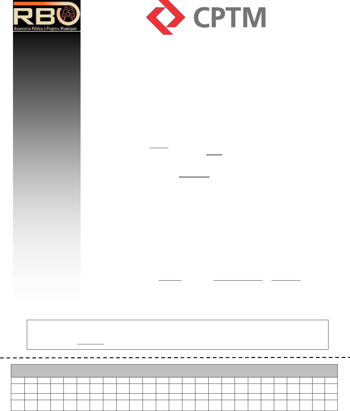 Divulgação de Gabarito: A partir de 11/09/2017 no site www.rboconcursos.com.br Destaque aqui e leve a parte inferior. COMPANHIA PAULISTA DE TRENS METROPOLITANOS – CPTM Concurso Público – Edital nº 003/2017 AGENTE DE CONSERVAÇÃO DE VIA INSTRUÇÕES PARA A REALIZAÇÃO DA PROVA ESCRITA DURAÇÃO DA PROVA: o Tempo máximo: 3 horas, incluso tempo para preenchimento da folha de respostas. o Tempo mínimo de permanência na sala: 1 hora. CADERNO DE QUESTÕES: o Este caderno é composto de 50 questões objetivas de múltipla escolha. o Confira se o seu caderno possui todas as páginas. o Utilize o Caderno de Questões como rascunho, transferindo as alternativas assinaladas para a Folha de Respostas. o Ao terminar a prova, o candidato entregará ao Fiscal de Sala, obrigatoriamente, o Caderno de Questões, que será disponibilizado para consulta no site www.rboconcursos.com.br durante o período aberto a recursos contra o gabarito. FOLHA DE RESPOSTAS: o Leia atentamente as instruções constantes em sua Folha de Respostas. o Utilize somente caneta esferográfica azul ou preta para preencher sua Folha de Respostas. o NÃO HAVERÁ TROCA DA FOLHA DE RESPOSTAS, portanto, tenha muita atenção ao assinalar a alternativa escolhida. o Assinale apenas UMA alternativa para cada questão. o Serão consideradas incorretas as questões com dupla marcação ou com rasuras. o O campo da alternativa escolhida deverá ser preenchido por inteiro, conforme instrução constante na própria Folha de Respostas. o Não esqueça de assinar a sua folha de respostas personalizada e devolvê-la ao fiscal. Qualquer intercorrência, comunique ao fiscal responsável pela aplicação da prova. (ATENÇÃO) Anotação das alternativas assinaladas pelo candidato para posterior conferência. 1 2 3 4 5 6 7 8 9 10 11 12 13 14 15 16 17 18 19 20 21 22 23 24 25 26 27 28 29 30 31 32 33 34 35 36 37 38 39 40 41 42 43 44 45 46 47 48 49 50 Companhia Paulista de Trens Metropolitanos – CPTM: Agente de Conservação de Via. 2 LÍNGUA PORTUGUESA Leia o texto abaixo para responder à questão 1. “Trem invertido” é o mais rápido da China e já começa a ser testado Os “aerotrens” já são uma realidade na China, mas uma nova linha férrea, suspensa, que começou a ser testada por engenheiros recentemente, promete levá-los a outro nível. Batizada de Skytrain, ela deve abrigar trens capazes de viajar até 70km/h, tornando-se a mais veloz do país. A nova linha pertence à cidade de Qingdao, na província litorânea de Shandong. Capaz de transportar até 510 passageiros em três ou cinco vagões, ele ainda é adaptável ao uso urbano e em áreas montanhosas. Além disso, já quebrou recordes de velocidade em sua etapa de testes, afirmam engenheiros. “Esse monotrilho usa a mais recente tecnologia de motor magnético (que emprega ímãs para anular o atrito e potencializar a velocidade), o que permite ter grandes vantagens com maior potência, menor volume físico, um nariz mais baixo e menos peso, realizando assim uma operação mais eficiente”, explicou Liu Yuwen, diretor técnico do projeto, ao Sputnik News. A nova linha férrea suspensa é a segunda modalidade em Qingdao, depois que outro “aerotrem” sustentado por baterias de lítio foi completado em Chengdu, no ano passado. Lá, os trens chegam à velocidade máxima de 60km/h. A China é o terceiro país no mundo a desenvolver linhas férreas suspensas, onde os trens são “invertidos” e se movem com o trilho na parte de cima do carro. Antes, Alemanha e Japão já tinham investido nessa modalidade de transporte. A primeira da história veio do país germânico, na cidade de Wuppertal, em 1901. Ela segue operante até hoje. Já o Japão abriga a linha férrea suspensa mais longa do mundo. A Chiba Urban Monorail, construída em 1988, engloba duas linhas que totalizam 15,2km de extensão. Disponível em: https://noticias.uol.com.br/internacional/ultimas- noticias/2017/07/23/trem-invertido-e-o-mais-rapido-da-china-e-ja- comeca-a-ser-testado.htm 1. De acordo com o texto, é correto afirmar que (A) a China é pioneira no investimento de “aerotrens”; começou antes da Alemanha e até mesmo do Japão. (B) o novo monotrilho da China pode ser o mais rápido do país. (C) a Alemanha e Japão, embora tenham investido em “aerotrens”, não conseguiram concretizar seus projetos, colocando a China no topo do ranking. (D) o trem mais rápido do mundo fica no Japão e, caso o trem invertido entre em funcionamento definitivo, ficará em segundo lugar. (E) a China é o terceiro país a desenvolver trens “invertidos”; o primeiro surgiu no Japão durante as Olimpíadas de 1964. Leia abaixo o fragmento da música “Trem das Onze”, de Adoniran Barbosa, para responder às questões 2 e 3. (...) Moro em Jaçanã Se eu perder esse trem Que sai agora às onze horas Só amanhã de manhã E além disso mulher Tem outra coisa Minha mãe não dorme Enquanto eu não chegar Sou filho único Tenho minha casa pra olhar 2. Assinale a alternativa em que a palavra destacada apresenta a mesma classificação que a palavra em destaque acima. (A) “Todos os dias é um vai-e-vem. A vida se repete na estação.” (Maria Rita) (B) “São dois trilhos me levando daqui pra outro lugar. Somos pares que o destino preferiu aproximar.” (Almir Sater) (C) “A vida é trem-bala parceiro. E a gente é só passageiro prestes a partir.” (Ana Vilela) (D) “E o meu coração, embora finja fazer mil viagens, fica batendo parado naquela estação.” (Adriana Calcanhotto) (E) “Ói, óia o trem, vem surgindo de trás das montanhas azuis.” (Raul Seixas) 3. A vírgula pode ser empregada sem que haja prejuízo gramatical ou de sentido na seguinte construção do texto: (A) “Se eu perder, esse trem(...)” (B) “E além disso, mulher (...)” (C) “Enquanto, eu não chegar (...)” (D) “Minha mãe, não dorme(...)” (E) “Tenho, minha casa, pra olhar” 4. Assinale a alternativa que não a