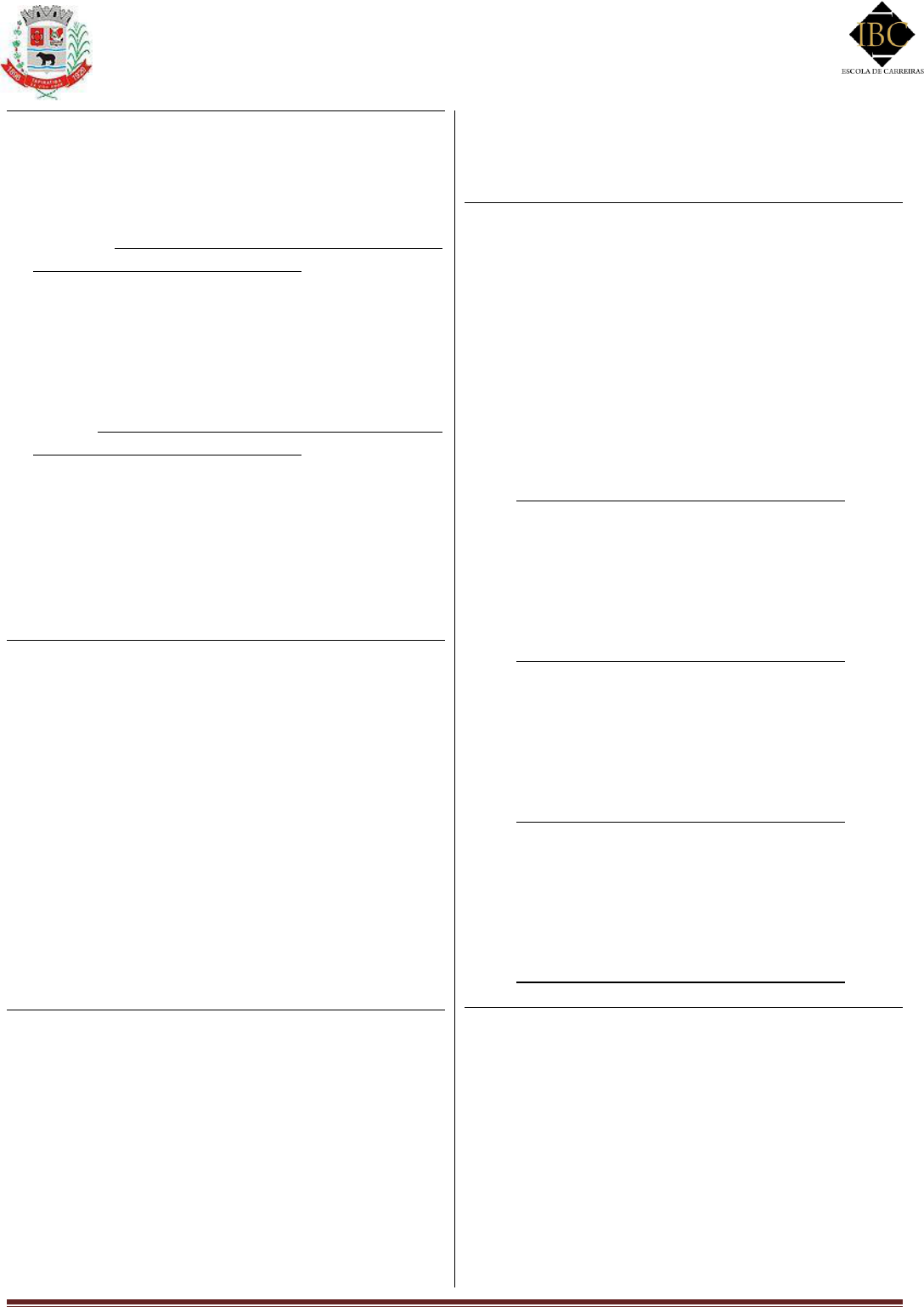 www.pciconcursos.com.br PREFEITURA DO MUNICÍPIO DE TAPIRATIBA -SP CONCURSO PÚBLICO DE PROVAS E TÍTULOS Nº CP - 01 /2014 PROVA OBJETIVA - CARGO – 4.08 – PEB II - INGLÊS Concurso Público de Provas e Títulos nº CP - 01/2014 – TAPIRATIBA – SP - IBC - Página 1 QUESTÃO 01 Segundo o Art. 208 da Constituição Federal, o dever do Estado com a educação será efetivado mediante a garantia de: I - progressiva universalização do ensino médio gratuito; (Redação dada pela Emenda Constitucional nº 14, de 1996) II - atendimento educacional especializado aos portadores de deficiência, preferencialmente na rede regular de ensino; III - educação infantil, em creche e pré-escola, às crianças até 5 (cinco) anos de idade; (Redação dada pela Emenda Constitucional nº 53, de 2006) IV - acesso aos níveis mais elevados do ensino, da pesquisa e da criação artística, segundo a capacidade de cada um; a) I, II e III apenas são verdadeiras b) II e III apenas são verdadeiras c) I apenas é verdadeira d) I, II, III e IV são verdadeiras QUESTÃO 02 No que concerne o art. 211 da Constituição Federal, assinale a alternativa incorreta: a) Os Municípios atuarão prioritariamente no ensino fundamental e na educação infantil. b) Os Estados e o Distrito Federal atuarão facultativamente no ensino fundamental e médio. c) A educação básica pública atenderá prioritariamente ao ensino regular d) Na organização de seus sistemas de ensino, a União, os Estados, o Distrito Federal e os Municípios definirão formas de colaboração, de modo a assegurar a universalização do ensino obrigatório. QUESTÃO 03 Coloque V para Verdadeiro e F para Falso. Conforme o Artigo 18 da Lei Federal 9394/96, os sistemas municipais de ensino compreendem: ( ) as instituições do ensino fundamental, médio e de educação infantil mantidas pelo Poder Público municipal; ( ) as instituições de educação infantil criadas e mantidas pela iniciativa privada; ( )os órgãos municipais de educação. a) V-, V-, V. b) V-, F-, V. c) F-, V-, V. d) V-, V-, F. QUESTÃO 04 Segundo o Inciso VIII do Artigo 12 da Lei Federal 9394/96 os estabelecimentos de ensino, respeitadas as normas comuns e as do seu sistema de ensino, terão a incumbência de notificar ao: a) Conselho Tutelar do Município, ao juiz competente da Comarca e ao respectivo representante do Ministério Público a relação dos alunos que apresentem quantidade de faltas acima de trinta por cento do percentual permitido em lei.(Incluído pela Lei nº 10.287, de 2001) b) Conselho Tutelar do Município, ao juiz competente da Comarca e ao respectivo representante do Ministério Público a relação dos alunos que apresentem quantidade de faltas acima de cinquenta por cento do percentual permitido em lei.(Incluído pela Lei nº 10.287, de 2001) c) Conselho Tutelar do Município, ao juiz competente da Comarca e ao respectivo representante do Ministério Público a relação dos alunos que apresentem quantidade de faltas acima de quarenta por cento do percentual permitido em lei.(Incluído pela Lei nº 10.287, de 2001) d) Conselho Tutelar do Município, ao juiz competente da Comarca e ao respectivo representante do Ministério Público a relação dos alunos que apresentem quantidade de faltas acima de sessenta por cento do percentual permitido em lei.(Incluído pela Lei nº 10.287, de 2001) QUESTÃO 05 O Inciso I do Artigo 24 da Lei Federal 9394/96 determina que a carga horária mínima anual será de; a) setecentas e setenta horas, distribuídas por um mínimo de cento e oitenta dias de efetivo trabalho escolar, excluído o tempo reservado aos exames finais, quando houver. b) oitocentas e dez horas, distribuídas por um mínimo de duzentos dias de efetivo trabalho www.pciconcursos.com.br PREFEITURA DO MUNICÍPIO DE TAPIRATIBA -SP CONCURSO PÚBLICO DE PROVAS E TÍTULOS Nº CP - 01 /2014 PROVA OBJETIVA - CARGO – 4.08 – PEB II - INGLÊS Concurso Público de Provas e Títulos nº CP - 01/2014 – TAPIRATIBA – SP - IBC - Página 2 escolar, excluído o tempo reservado aos exames finais, quando houver. c) oitocentas e quarenta horas, distribuídas por um mínimo de duzentos e vinte dias de efetivo trabalho escolar, excluído o tempo reservado aos exames finais, quando houver. d) oitocentas horas, distribuídas por um mínimo de duzentos dias de efetivo trabalho escolar, excluído o tempo reservado aos exames finais, quando houver. QUESTÃO 06 De acordo com o Artigo 26 da Lei Federal 9394/96, os currículos do ensino fundamental e médio devem ter uma base: a) Nacional comum, a ser complementada, em cada sistema de ensino e estabelecimento escolar, por uma parte diversificada, exigida pelas características regionais e locais da sociedade, da cultura, da economia e da clientela. b) regional comum, a ser complementada, em cada sistema de ensino e estabelecimento escolar, por uma parte diversificada, exigida pelas características regionais e locais da sociedade, da cultura, da economia e da clientela. c) estadual comum, a ser complementada, em cada sistema de ensino e estabelecimento escolar, por uma parte diversificada, exigida pelas características estaduais e locais da sociedade, da cultura, da economia e da clientela. d) Municipal comum, a ser complementada, em cada sistema de ensino e estabelecimento escolar, por uma parte diversificada, exigida pelas características municipais e locais da sociedade, da cultura, da economia e da clientela. QUESTÃO 07 O Artigo 58 da Lei Federal 8069/90 afirma que no processo educacional respeitar-se-ão os: a) Valores religiosos, artísticos e históricos próprios do contexto social da criança e do adolescente, garantindo-se a estes a liberdade da criação e o acesso às fontes de cultura. b) Valores morais, artísticos e históricos próprios do contexto social da criança e do adolescente, garantindo-se a estes a liberdade da criação e o acesso às fontes de cultura. c) Valores culturais, artísticos e his