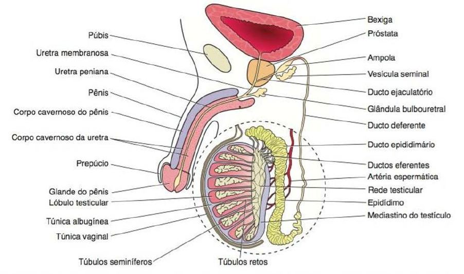 SISTEMA REPRODUTOR MASCULINO + COMPONENTES: Testículos Ductos Genitais Glândulas Acessórias Pênis + FUNÇÕES: Produção de gametas // de hormônios Transporte de gametas Excreção de urina Ejaculação 1) TESTÍCULO: - Envolvido por uma grossa capsula de tecido conjuntivo denso TÚNICA ALBUGÍNEA: - Capsula grossa de tecido conjuntivo denso que envolve cada testículo - é espessa na superfície dorsal e projeta-se para o interior formando o mediastino (do qual partem septos fibrosos que dividem-o em compartimentos piramidais/lóbulos testiculares) - Cada lóbulo é ocupado por parte dos Túbulos Seminíferos enovelados envolvidos por TC frouxo rico em vasos sanguíneos e linfáticos e nervos das células intersticiais/de Leydig TÚBULOS SEMINÍFEROS: - Produção de espermatozoides - São tubos enovelados - Iniciam em fundo cego e terminam em túbulos retos - Parede: epitélio germinativo ou epitélio seminífero, Células de Sertoli e Células de Linhagem Espermatogênica (função de produzir espermatozóides) - Lâmina Basal: - Bainha de Tecido conjuntivo: fibroblastos, Células de Leydig (ocupam a maior parte do espaço entre túbulos seminíferos - Camada interna: aderia à lâmina basal, contém células mielóides achatadas e contráteis com características de células musculares lisas - Os túbulos retos conectam os túbulos seminíferos a um labirinto de canais anastomosados em forma de rede, revestidos por um epitélio simples pavimentoso ou cúbico, constituindo a rede testicular no mediastino do testículo. Em continuação, ductos eferentes conectam à rede testicular ao início da porção seguinte o ducto do epidídimo. a) CÉLULAS DE SERTOLI: - Proteção - Barreira hemato-testicular - Fagocita os corpos residuais das espermátides - Apoia os espermas b) TECIDO INTERTISCIAL: - Entre os túbulos - Células de Leydig ou Cél. Intertisciais: produção de testosterona c) EPITÉLIO SEMINÍFERO ou GERMINATIVO: - Células de Sertoli - Células ..... OBS: Túbulos Seminíferos produzem espermatozóides Células Intersticiais/de Leydig: secretam andrógeno testicular + PROCESSO DE ESPERMATOGÊNESE: Espermatogônias --------> Espermatócitos (1º e 2º) ---------> Espermátides - Processo de formação de espermatozóides - Leva em torno de 2 meses da puberdade até a velhice - Ocorre nos testículos - Túbulos seminíferos: produção de espermatozóides - .................... - ..................... OBS: Na puberdade as espermatogônias iniciam um processo contínuo de divisões mitóticas e produzem sucessivas gerações de células. As células-filhas podem seguir dois caminhos: continuar se clividindo, mantendo-se como células-tronco de outras espermatogônias (chamadas espermatogônias de tipo A). ou diferenciarem-se durante sucessivos e.idos de divisão mitótic.as para se tornar espermatogônias de tipo B. + COMPONENTES DA ESPERMATOGÊNESE: - Células de Sertoli: apoiada na LB, projetam suas superfícies laterais em espermatogônia e espermatócitos para dar suporte de materia interstiscial à essas células que não tem acesso livro ao Líquido Intersticial formando uma Barreira Hemato-testicular. São importantes para a diferenciação de células gaméticas, tem função relacionada à nutrição e apoio mecânico, podem produzir uma substância que atua como fator de crescimento dos túbulos seminíferos. Fagocitam. Têm receptores para FSH e Testosterona. Função Secretora d lipídeo. - Células Instersticiais de Leydig: células endócrinas, estão isoladas ou em grupos, produtoras de Esteróides e Testosteronas, oriundas dos mesênquimas - FSH: estimula células de Sertoli - LH: estimula células de Leydig - A produção de LH e FSH é estimulada por GoRH produzido pelo Hipotálamo OBS: BARREIRA HEMATO-TESTICULAR: +PROCESSOS DA ESPERMATOGÊNESE: CÉLULA GERMINATIVA (OVOGÔNIA): - sofre Mitoses formando espermatogônias ESPERMATOGÔNIA: - apoiada na Lâmina Basal, podem se diferenciar ou manter a população de "células-tronco" - Cresce transformando-se em Espermatócito 1º, aumento do citoplasma - não sofre divisão ESPERMATÓCITO 1º - sofre Meiose II: origina 4 Espermátides ESPERMATÓCITO 2º - sofre Meiose II: origina 4 Espermátides ESPERMÁTIDE: - sofre Espermiogênese: origina Espermatozóide ESPERMATOZÓIDE + PROCESSOS DA ESPERMIOGÊNESE: - Processo dentro da Espermatogênese - Perda do citoplasma - Fusão do CG - Espermátide ----> Espermatozóide FASE DE GOLGI: - CG bem desenvolvido - Pequenos grânulos pós-acrossômicos acumulam-se no CG - Fundem para formar um único grânulo acrossômico: Vesícula Acrossômica - Centríolos migram em posição oposta ao acrossomo em formação e depois migram para perto do núcleo - começa a formar o Axonema - As espermátides começam a desenvolver polaridade a) Cabeça: - forma-se num dos extremo - CG produz enzimas que irão constituir o acrossoma posteriormente b) Peça intermediária: - forma-se no outro extremo - para onde convergem as Mitocôndrias - Centríolo distal começa a formar um Axonema FASE DO ACROSSOMA: - CG circunda o núcleo condensado, tornando-se no acrossomo - Vesícula e o Grânulo Acrossômico -Acrossomo (lisossomo) - Enzimas hidrolíticas - Corona radiata e Zona pelúcida (ovócito) .......... ............. ETAPA DO FLAGELO: - um dos Centríolos da célula sofre elongação tornando-se um flagelo ETAPA DE MATURAÇÃO: - Formação de um corpo residual (com excesso de citoplasma) - Citoplasma das espermátides - Corpos residuais - Fagocitados pelas Células de Sertoli - Espermatozóides - Lúmem do túbulo + FATORES QUE INFLUENCIAM A ESPERMATOGÊNESE: HORMÔNIOS: - FSH: age nas Cél. Sertoli (promove síntese e a secreção de proteína ligante de andrógeno-ABP) - LH: age nas Cél. Intersticiais de Leydig (estimula produção de testosterona) TEMPERATURA: - só acontece abaixo de 37º - testiculo mede aproximadamente 35º OUTROS: - Desnutrição - Alcoolismo - Irradiação - F