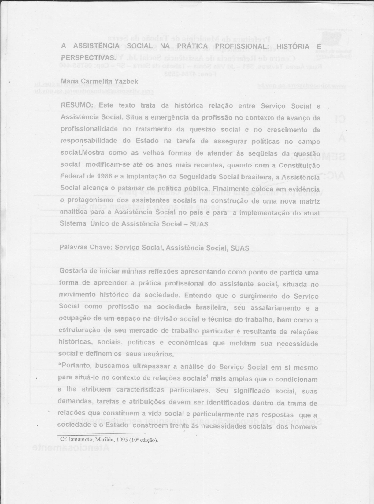 - lamamoto, Marilda. Relações sociais e serviço social no."Brasil: Esbôço de