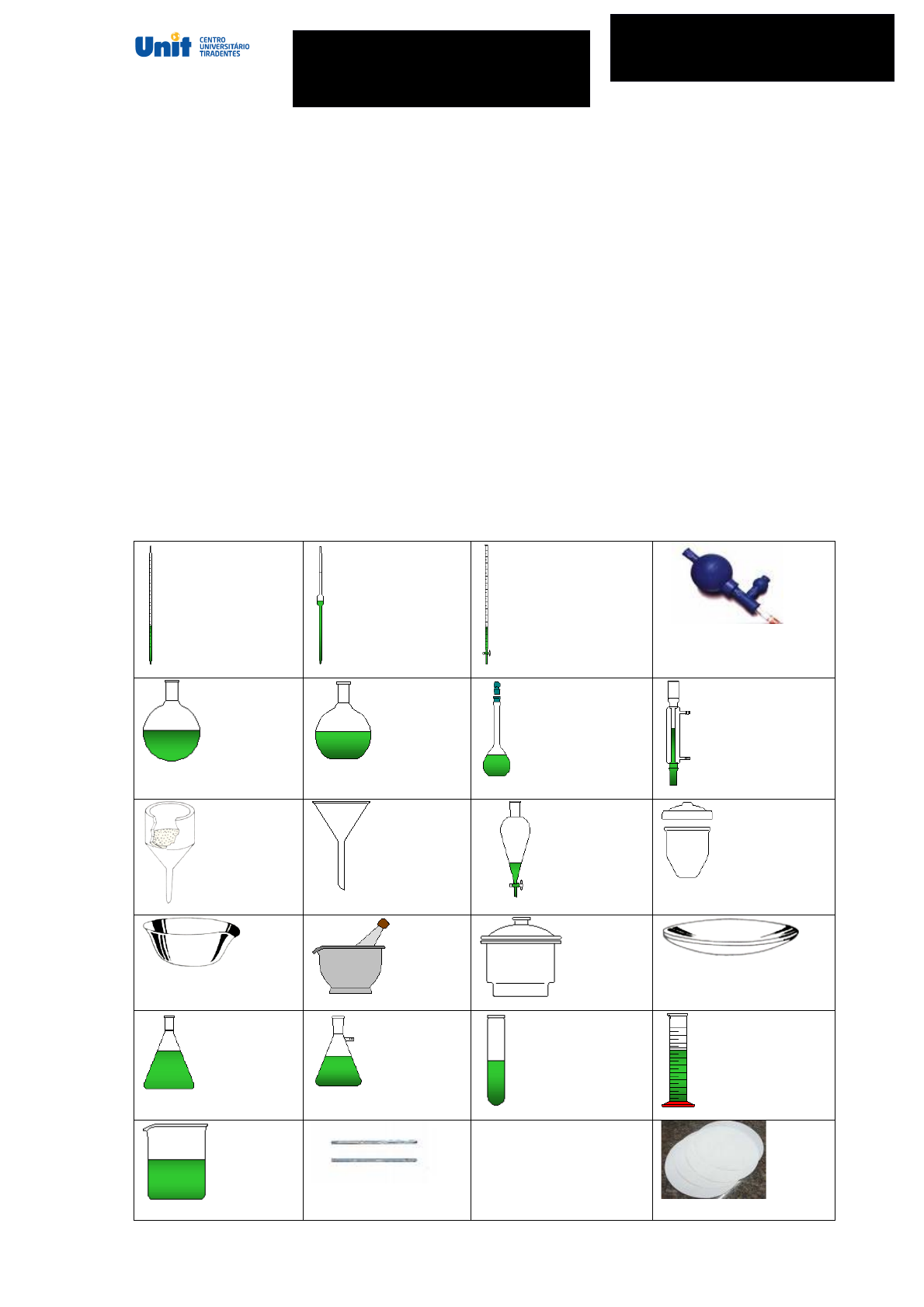 VIDRARIA DE LABORATÓRIO - PRÁTICA 01 1. INTRODUÇÃO. As vidrarias e equipamentos de laboratório são ferramentas úteis durante o desenvolvimento de um procedimento de laboratório. Por este motivo, estas necessitam de cuidados especiais de limpeza e manuseio. Vidrarias volumétricas referem um cuidado especial na aferição do volume. Deve-se tomar o cuidado de evitar erros comuns como o de Paralaxe, que está associado ao desvio de ângulo durante a leitura. Este erro é comum em vidrarias como a pipeta, bureta, balão volumétrico e proveta. Outro erro bastante comum está associado ao procedimento de pesagem, onde deve ser levado em consideração o nível da balança, o ajuste do zero e a limpeza do prato da balança. 2. OBJETIVO. Conhecer as vidrarias e equipamentos do laboratório. Na tabela abaixo estão descritas as principais vidrarias utilizadas em laboratório: 1 2 3 4 5 6 7 8 9 10 11 12 13 14 15 16 17 18 19 20 21 22 24 25 26 23 27 28 29 30 31 32 33 34 35 36 37 38 39 40 41 42 43 44 45 46