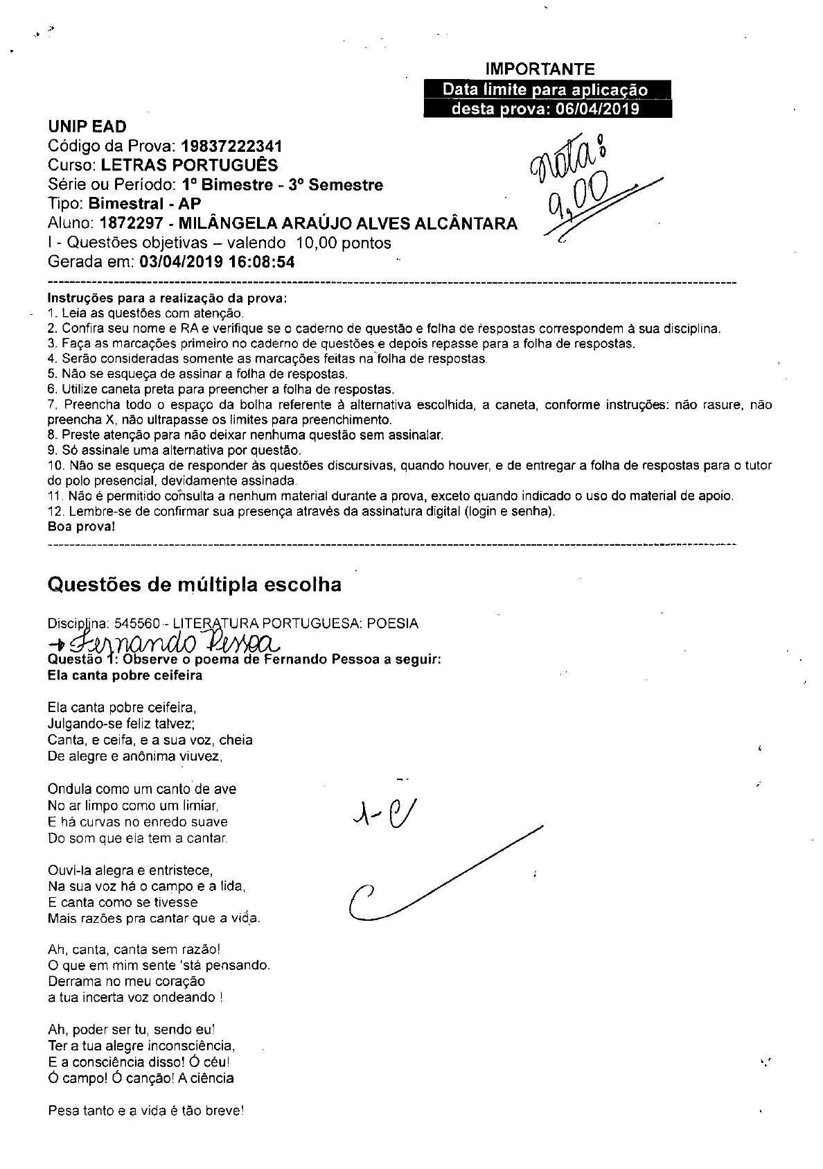 IMPORTANTE Data limite para aplica ão desta •rova: 06/04/2019 UNIP EAD Código da Prova: 19837222341 Curso: LETRAS PORTUGUÊS Série ou Período: 1° Bimestre - 3° Semestre Tipo: Bimestral -AP Aluno: 1872297- MILÂNGELA ARAÚJO ALVES ALCÂNTARA I - Questões objetivas — valendo 10,00 pontos Gerada em: 03/04/2019 16:08:54 Instruções para a realização da prova: Leia as questões com atenção. Confira seu nome e RA e verifique se o caderno de questão e folha de respostas correspondem à sua disciplina. Faça as marcações primeiro no caderno de questões e depois repasse para a folha de respostas. Serão consideradas somente as marcações feitas na'folha de respostas. Não se esqueça de assinar a folha de respostas. Utilize caneta preta para preencher a folha de respostas. Preencha todo o espaço da bolha referente à alternativa escolhida, a caneta, conforme instruções: não rasure, não preencha X, não ultrapasse os limites para preenchimento. Preste atenção para não deixar nenhuma questão sem assinalar. Só assinale uma alternativa por questão. Não se esqueça de responderás questões discursivas, quando houver, e de entregar a folha de respostas para o tutor do polo presencial, devidamente assinada. Não é permitido consulta a nenhum material durante a prova, exceto quando indicado o uso do material de apoio. Lembre-se de confirmar sua presença através da assinatura digital (login e senha). Boa prova! Questões de múltipla escolha Disciplina: 545560 •- LITERATURA PORTUGUESA: POESIA —to Questão 1: Observe o poema de Fernando Pessoa a seguir: Ela canta pobre ceifeira Ela canta pobre ceifeira, Julgando-se feliz talvez; Canta, e ceifa, e a sua voz, cheia De alegre e anônima viuvez, Ondula como um canto de ave No ar limpo como um limiar, E há curvas no enredo suave Do som que eia tem a cantar. Ouvi-Ia alegra e entristece, Na sua voz há o campo e a lida, E canta como se tivesse Mais razões pra cantar que a vida. Ah, canta, canta sem razão! O que em mim sente 'stá pensando. Derrama no meu coração a tua incerta voz ondeando ! Ah, poder ser tu, sendo eu! Ter a tua alegre inconsciência, E a consciência disso! ó céu! campo! ó canção!A ciência Pesa tanto e a vida é tão breve! Entrai por mim dentro! Tomai Minha alma a vossa sombra leve! Depois, levando-me, passai! Mucu e Agora, assinale a alternativa que NÃO corresponde a uma interpretação correta do poema: O canto da ceifeira, uma camponesa, provoca alegria e tristeza no eu lírico, talvez por revelar uma felicidade que ele não compreende. Neste poema, Pessoa enfatiza sua visão de que o poema é construído pela razão: "O que em mim sente istá +irando". ela simplicidade e bucolismo, observamos que Pessoa retoma as regras clássicas, típicas do Arcadismo. Nesse poema, podemos observar o resgate do lirismo medieval, assim como o uso das redondilhas camonianas. O eu lírico expressa um desejo de se colocar no lugar da camponesa, inconsciente dos problemas do mundo e feliz em sua simplicidade. Questão Quanto a Camilo Pessanha e seu estilo, é correto afirmar que: ecifyyLae-.7kefisofix O autor é o mais representativo poeta do modernismo português. (iNoificu kg As características típicas de sua obra são a descrição e a critica social. Cultuou os padrões clássicos de perfeição formal e racionalismo. ind),,-Devido ao tom pessimista e a temática da morte, vários de seus poemas nos remetem ao Romantismo, contudo ft são mais densos, maduros e repletos de símbolos. E) Os recursos sonoros mais usados são a ironia e as onomatopeias. Questão 3: As afirmativas a seguir referem-se às características do teatro de Gil Vicente. Analise se são .rra2mclabírrs.ckw ovi eilyz (V) É um teatro alegórico. As barcas, no Auto da barca do inferno, por exemplo, simbolizam a morte, um momento d passagem do mundo dos vivos para o céu ou inferno. ( As personagens-tipo representam uma determinada classe social, profissão, sexo ou idade. ( ) A maioria das peças são comédias de costumes, seguindo o lema latino de Plauto Ridendo castigat mores" (Pelo riso, corrigem-se os costumes). e) É chamado de popular por ser apresentado para o povo, em praça pública. Assinale a alternativa que corresponde à sequência exata: A) V-F-F-V. riaN v C) V-V-V-V V-F-F-F. F-V-V-V Questáo 4' As pale a alternativa em que todas as características de estilo são do Simbolismo: Complexidade, ressurreição dos valores humanos, naturalismo pornográfico. AÀ. LA . 6 V Poesia de sugestão, imagens vagas, mundo subjetivo. — O) Atmosfera de imprecisão, realismo cru, religiosidade. Uso de antíteses, paradoxos, descritivismo e racionalidade. Predomínio das ideias, da lógica, linguagem rebuscada, valorização dos detalhes e da vida cotidiana Questão 5: Veja a seguir um trecho de O uardado de rebanhos e ass nate a alternativa correta: -rp 0/Y1,0 Sou um guardador de rebanhos. rebanho é os meus pensamentos. os meus pensamentos são todos sensações. Penso com os olhos e com os ouvidos. -'6 E com as mãos e os pès com o nariz e a boca. árilial e A linguagem é rebuscada e complexa. O pensar é colocado acima do sentir; assim, o pensamento, o mundo das ideias é a essência de tudo. O esquema rítmico é rígido, formado por rimas interpoladas e ricas. o À D EDsesvei dpoot ms uaaéf ourmm aeçxãeomcpl ál os ds ioc as eenes ar uccli oi t na isCmaoe i no i quall oa st) cnl iras ri ecoar i dgardeeg odsa ev isduaa és ar e sg er anss a çã rígidas.o .... Questão 6: Leia os versos a seguir de "Sentimento dum Ocidental", de Cesário Verde: rit NO-ItiO 'UM, As burguesinhas do Catolicismo Resvalam pelo chão minado pelos canos! E lembram-me, ao chorar doente dos pianos, As freiras que os jejuns matavam de histerismo. Sobre eles,tliSCLRR gl.."0 afirmar que: Nessa sua fase romântica, o poeta passa a refletir sobre a religiosidade dos burgueses. O poeta utiliza um "lirismo" realista, descrevendo, inclusive, imagens disform