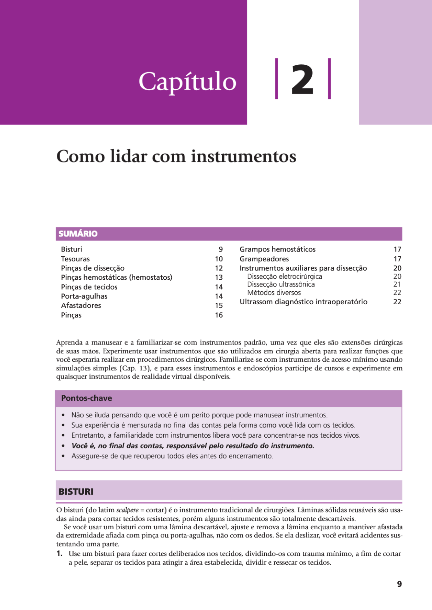 Capítulo Como lidar com instrumentos Bisturi 9 Grampos hemostáticos 17 Tesouras 10 G rampeadores 17 Pinçasde dissecção 12 Instrumentos auxiliarespara dissecção 20 Pinçashemostáticas (hemostatos) 13 DÍSSECÇÊO GÍGÍVOCÚÚIQÍCB 20 Pmças de teddos 14 Dlssecção ultrassônlca 21 Portaagmhas 14 Métodos diversos ' _ l _ 22 Afastadores 15 Ultrassom diagnostico Intraoperatorlo 22 Pinças 16 Aprmda a manusear e a familiarizar-secom instrumentos padrão, uma vez que eles são extensões cirúrgicas de suas mãos. Experimente usar instrumentos que são utilizadosem cirurgia aberta para realizar funções que você esperaria realizarem procedimentos cirúrgicos. Farniliarize-secom instrumentos de acessomínimousando simulações simples (Cap. 13), e para esses instrummtos e endoscópios participe de cursos e experimmte em quaisquer instrumentos de realidadevirtual disponíveis. Não se iluda pensando que você é um perito porque pode manusear instrumentos. Sua experiência é mensurada no final das contas pela forma como você lida com os tecidos. Entretanto, a familiaridadecom instrumentos libera você para concentrar-se nos tecidos vivos. Você é, no fina¡ das contas, responsável pelo resultado do instrumento. Assegurese de que recuperou todos eles antes do encerramento. BISTURI O bisturi (do latimscalpere = cortar) é o instrumento tradicionalde cirurgiões. Lâminassólidas reusáveis são usa- das ainda para cortar tecidos resistentes, porém alguns instrumentos são totalmente descartáveis. Se você usar um bisturi com uma lâmina descartável, ajuste e remova a lâmina enquanto a mantiver afastada da extremidade afiada com pinçaou porta-agulhas, não com os dedos. Se ela deslizar, você evitará acidentessus- tentando uma parte. 1. Use um bisturi para fazer cortes deliberadosnos tecidos, dividindo-oscom traumamínimo, a ñm de cortar a pele, separar os tecidos para atingir a área estabelecida, dividir e ressecar os tecidos. Capítulo | 2 | Como lidarcom instrumentos 2. Estenda a saliência da lâmina através do alvo, em vez de exercer pressão excessiva que pode resultar em um corte descontrolado. Estenda a lâmina sob pressão controlada para determinar a profundidadede corte. 3. Para cortar pele e estruturas similares, segure o instrumento de modo similaràquele para segurar uma faca de mesa (Fig. 2.1). Mantenha a lâmina na posição horizontal, suspensa abaixo de sua mão pronada,segurando entre o polegar e o dedo médio. Coloque seu dedo indicadorna parte posterior do instrumento na base da lâmina, para controlar a pressão exercida na mesma. Envolva seus dedos anular e mínimo ao redor do cabo para reforçarsua garra firme, de forma que a extremidade do cabo permaneçacontra o topo da região hipotenar. 4. Quando for necessário produzir uma punção pequena, uma incisão precisa, curta, ou cortar uma estrutura fina, segure o instrumento como uma caneta (Fig. 1.1). 5. Como norma você corta no plano sagital (do latim sagitm = seta; a via de uma seta precisamente longe de você), de longe para perto, e no plano transverso, do lado não dominante para o dominante. Se for necessário cortar do lado dominante para o não dominante, considere ir para o outro lado da mesa de operações usando sua mão não dominante, ou usando tesouras. 6. Não utilizede forma errada o bisturi tentando cortar metal ou osso, ou tente alavancaro instrumento durante uma manobra de corte Não continue a usar um bisturi sem corte, pois uma vez que a extremidade cortante esteja perdida, será necessário aplicarpressão excessiva e a incisão ficará irregular. 7. Nunca faça uma incisão incerta sem primeiro avaliar a situação exata; algumas são irrecuperáveis. Antes de fazer um plano de incisão crítica, avalie e, se necessário primeiramente desenhe na pele a linha pretendida com tinta azul de metileno.Ocasionalmente, é recomendável praticar no ar antes de fazerum corte controlado, regular, como os jogadores de golfe fazem quando se preparam para dar uma tacadapara arremessar a bola. Se uma estrutura importante for arriscada, interponha um instrumento protetor, tal como um afastador. Quando você for realizarum corte em uma estrutura linearem profundidade, pode colocar um dissector com ranhuras abaixo dela, para proteger os tecidos mais profundos. 8. Existe um escalpelo especial, denominadobisturi,conjecturado para ser citado após Pistorium (Pistoja moderna] em Tuscany,onde eles eram feitos. Ele tem uma lâmina curva, fina e longa, extremidade cega para corte lateral, ponta afiada para corte final através de uma abertura pequena. Nunca usei esse instrumento, preferindo melhorar o acesso e cortar sob visão direta. TESOURAS A ação de corte de tesouras (do latim cisorium = um instrumento de corte, de caedere = cortar) resulta do movi- mento de contato das extremidades entre as lâminas, ocasionando um leve ajuste em direção de urna sobre a outra. Se você segurar as tesouras acima da luz, com as extremidades para cima, deve ver luz entre as lâminas, exceto na junta e em um ponto de contato que se movimentaem direção às pontas conformevocê fecha as lâmi- nas. Se as lâminas saltarem de forma independente, a ação de corte é substituída por um efeito de mastigação, e isso ocorre se forem usadas tesouras delicadas para cortar tecidos resistentes_ As tesouras são feitas para serem manuseadaspor usuários destros, e a pressão lateral do polegar destro tende a ocasionar que as lâminas sejam pressionadas juntamente. Quando a tesoura é segurada na mão esquerda, a pressão do polegartende a alavancaras lâminasde forma independente. Fig. 2.1 Segure o bisturi para fazer uma incisãoregular longa. Estenda a saliência da lâmina, não o ponto, de seu lado não dominante para o dominante. Se você estiver cortando ao longo de um piano sagital, corte de longe para perto. 10 Tesouras_ A maioria das tesouras cirúrgicas possuem pontas arredondadas, porém para objetivos esp