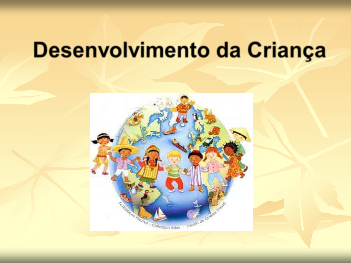 * Desenvolvimento da Criança * Desenvolvimento da Criança Evolução do processo geral de comunicação Linguagem não é uma conduta independente – relacionada ao desenvolvimento da inteligência e das habilidades de interação social Relações entre comunicação, inteligência e socialização * Desenvolvimento da Criança A partir das coisas próprias com que já nascemos (temperamento, o tipo físico, os reflexos dentre outros ) que são chamados de hereditárias, vamos aprendendo o mundo todo. De início aprendemos pelas pessoas mais próximas (os pais), depois pela família, pelos vizinhos, pela escola, pela Igreja. Toda a comunidade ajuda a educar. Cientistas estão descobrindo que o tipo de cuidado e atenção que são dedicadas as crianças exerce um efeito muito maior do que supunha sobre o desenvolvimento cerebral das mesmas. Sabe-se hoje que uma complicada mistura de hereditariedade e experiências vividas dão forma ao desenvolvimento cerebral. * Desenvolvimento da Criança As pesquisas mostram que experiências positivas nos campos emocional, físico e intelectual vivida pelas crianças em seus primeiros anos de vida são tão necessárias para o adequado desenvolvimento do seu cérebro quanto a boa alimentação é para o adequado e saudável crescimento de seu corpo. Ao nascimento, o cérebro tem cerca de 100 bilhões de células nervosas ou neurônios. Os neurônios crescem e conectam-se com outros, em sistemas que controlam diversas funções, como ver, ouvir, mover-se e expressar emoções. Estes sistemas, ativados por experiências repetidas fornecem substrato pra a organização e o funcionamento do cérebro ao longo da vida. O cérebro é a parte do corpo que nos permite sentir alegria ou desespero, responder aos outros de forma amorosa ou agressiva, usar a razão ou reagir. * Desenvolvimento da Criança Foi realizada uma pesquisa nos Estados Unidos que conclui que crianças que recebem cuidados calorosos são mais curiosas, se relacionam melhor com outras crianças, tem melhor desempenho na escola e lidam com as dificuldades da vida adulta com mais facilidade do que as crianças que não tem uma “conexão segura”. Não basta somente amarmos as crianças, o toque é importante e estimula a necessária liberação hormonal ao crescimento. Estudos revelam que a forma como os adultos estabelecem a disciplina, é crucial no desenvolvimento da criança. * Desenvolvimento da Criança Ao nascimento – cérebro possuindo cerca de 100 bilhões de células nervosas ou neurônios Controle de funções como ver, ouvir, mover-se e expressar emoções Experiências repetidas – fornecimento de substrato para a organização e o funcionamento do cérebro ao longo da vida * DESENVOLVIMENTO NEUROPSICOMOTOR Mielinização do SNC – período de maior atuação até os 2 anos de idade – estreita relação com o desenvolvimento das atividades motoras Leis gerais do desenvolvimento do SNC: Do geral para o específico Do céfalo para o caudal Do próximo para o distal * DESENVOLVIMENTO NEUROPSICOMOTOR Desenvolvimento neuropsicomotor satisfatório – desenvolvimento perceptual e sensorial Gênese do Processo de Cognição - Ação – interação organismo/meio (objetos e pessoas) Desenvolvimento considerado como um todo cognitivo linguagem motor emocional * DESENVOLVIMENTO DA COMUNICAÇÃO PRÉ-VERBAL A criança necessita ter uma razão ou motivo para se comunicar: uma intenção Há necessidade de se ter algo para comunicar: um conteúdo É também necessário um meio de comunicação: uma forma Há necessidade de ter pessoas com quem se comunicar: um parceiro Há de se ter condições favoráveis para a interação: uma situação ou contexto A criança também necessita ter capacidades cognitivas favoráveis: para atuar sobre o mundo e compreendê-lo. * Desenvolvimento da Comunicação Organização de experiências, construção de conhecimentos, sentimentos de desejos, elaboração dos conteúdos da atividade mental – atividade cognitiva Forma de comunicação – verbal ou não verbal. A comunicação possui função social. Importância do papel do adulto * NÍVEL I – COMUNICAÇÃO NÃO-INTENCIONAL- COMPORTAMENTOS REATIVOS Dois primeiros meses de vida Comportamentos caracterizados por reações determinadas por organizações nervosas reflexas Bebê mais reage ao mundo do que age sobre ele Não se constitui como sujeito * NÍVEL II – COMUNICAÇÃO NÃO INTENCIONAL- COMPORTAMENTOS ATIVOS Dos dois aos oito meses Maior capacidade de organizar procedimentos para explorar o mundo Coordenação sensório-motoras (mão/boca, visão/ audição, atividade manual com a atividade visual ) Pessoas e coisas tornam-se centros de grande interesse de exploração e de conhecimento para a criança. * Maior interesse pelos objetos e pessoas, maiores recursos para interagir e maior domínio motor compõem características importantes desta etapa A criança não é capaz de organizar procedimentos comunicativos intencionais Adultos – capazes de atribuir valores comunicativos aos comportamentos dos bebês Pode começar a prever resultados -descoberta de suas potencialidades expressivas -comunicação intencional usando recursos gestuais e verbais. * NÍVEL III – COMUNICAÇÃO PRÉ-LINGUÍSTICA INTENCIONAL ELEMENTAR Caracterizado pelo aparecimento de condutas comunicativas novas e que revelam a intencionalidade da criança Dos 8 aos 12 meses de idade Dirige comportamentos comunicativos intencionais ainda elementares Começa a compreender a possibilidade da utilização de recursos vocais na comunicação * NÍVEL III – COMUNICAÇÃO PRÉ-LINGUÍSTICA INTENCIONAL ELEMENTAR A criança dirige atitudes comunicativas aos outros, procurando dar início à interação ou respondendo às tentativas dos outros; Persiste no comportamento comunicativo até que o adulto responda e fica aguardando que o outro responda aos seus esforços. Progressos significativos no aspecto cognitivo * N