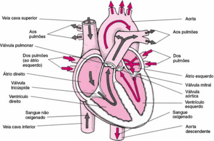 Sistema circulatório O coração e os vasos sanguíneos e o sangue formam o sistema cardiovascular ou circulatório. A circulação do sangue permite o transporte e a distribuição de nutrientes, gás oxigênio e hormônios para as células de vários órgãos. O sangue também transporta resíduos do metabolismo para que possam ser eliminados do corpo. O coração O coração de uma pessoa tem o tamanho aproximado de sua mão fechada, e bombeia o sangue para todo o corpo, sem parar; localiza-se no interior da cavidade torácica, entre os dois pulmões. O ápice (ponta do coração) está voltado para baixo, para a esquerda e para frente. O peso médio do coração é de aproximadamente 300 gramas, variando com o tamanho e o sexo da pessoa. Observe o esquema do coração humano, existem quatro cavidades: • Átrio direito e átrio esquerdo, em sua parte superior; • Ventrículo direito e ventrículo esquerdo, em sua parte inferior. O sangue que entra no átrio direito passa para o ventrículo direito e o sangue que entra no átrio esquerdo passa para o ventrículo esquerdo. Um átrio não se comunica com o outro átrio, assim como um ventrículo não se comunica com o outro ventrículo. O sangue passa do átrio direito para o ventrículo direito através da valva atrioventricular direita; e passa do átrio esquerdo para o ventrículo esquerdo através da valva atrioventricular esquerda. O coração humano um órgão cavitário (que apresenta cavidade), basicamente constituído por três camadas: • Pericárdio – é a membrana que reveste externamente o coração, como um saco. Esta membrana propicia uma superfície lisa e escorregadia ao coração, facilitando seu movimento ininterrupto; • Endocárdio – é uma membrana que reveste a superfície interna das cavidades do coração; • Miocárdio – é o músculo responsável pelas contrações vigorosas e involuntárias do coração; situa-se entre o pericárdio e o endocárdio. Quando, por algum motivo, as artérias coronárias – ramificações da aorta – não conseguem irrigar corretamente o miocárdio, pode ocorrer a morte (necrose) de células musculares, o que caracteriza o infarto do miocárdio. Existem três tipos básicos de vasos sanguíneos em nosso corpo: artérias, veias e capilares. Artérias As artérias são vasos de paredes relativamente espessa e muscular, que transporta sangue do coração para os diversos tecidos do corpo. A maioria das artérias transporta sangue oxigenado (rico em gás oxigênio), mas as artérias pulmonares transportam sangue não oxigenado (pobre em gás oxigênio) do coração até os pulmões. A aorta é a artéria mais calibrosa (de maior diâmetro) do corpo humano. Veias As veias são vasos de paredes relativamente fina, que transportam sangue dos diversos tecidos do corpo para o coração. A maioria das veias transporta sangue não oxigenado, mas as veias pulmonares transportam sangue oxigenado dos pulmões para o coração. As veias cavas superior e inferior são as mais calibrosas do corpo humano. No esquema abaixo você pode ver o caminho percorrido pelo sangue em nosso corpo. Observe-o e acompanhe a explicação. O sangue oxigenado é bombeado pelo ventrículo esquerdo do coração para o interior da aorta. Essa artéria distribui o sangue oxigenado para todo o corpo, através de inúmeras ramificações, como a artéria coronária, a artéria carótida e a artéria braquial. Nos tecidos, o sangue libera gás oxigênio e absorve gás carbônico. O sangue não oxigenado e rico em gás carbônico é transportado por veias diversas, que acabam desembocando naveia cava superior e na veia cava inferior. Essas veias levam então o sangue não oxigenado até o átrio direito. Deste, o sangue não oxigenado passa para o ventrículo direito e daí é transportado até os pulmões pelas artérias pulmonares. Nos pulmões, o sangue libera o gás carbônico e absorve o gás oxigênio captado do ambiente pelo sistema respiratório. Esse fenômeno, em que o sangue é oxigenado, chama-sehematose. Então, o sangue oxigenado retorna ao átrio esquerdo do coração, transportado pelas veias pulmonares. Do átrio esquerdo, o sangue oxigenado passa para o ventrículo esquerdo e daí é impulsionado para o interior da aorta, reiniciando o circuito. Num circuito completo pelo corpo, o sangue passa duas vezes pelo coração humano. Nesse circuito são reconhecidos dois tipos de circulação: a pequena circulação e a grande circulação. Pequena circulação- Também chamada circulação pulmonar, compreende o trajeto do sangue desde o ventrículo direito até o átrio esquerdo. Nessa circulação, o sangue passa pelos pulmões, onde é oxigenado. Grande circulação- Também chamada de circulação sistêmica, compreende o trajeto do sangue desde o ventrículo esquerdo até o átrio direito; nessa circulação, o sangue oxigenado fornece gás oxigênio os diversos tecidos do corpo, além de trazer ao coração o sangue não oxigenado dos tecidos. Pelo que foi descrito, e para facilitar a compreensão: • A aorta transporta sangue oxigenado do ventrículo esquerdo do coração para os diversos tecidos do corpo; • as veias cavas (superior e inferior) transportam sangue não oxigenado dos tecidos do corpo para o átrio direito do coração; • as artérias pulmonares transportam sangue não oxigenado do ventrículo direito do coração até os pulmões; • as veias pulmonares transportam sangue oxigenado dos pulmões até o átrio esquerdo do coração. Observe que, pelo lado direito do nosso coração, só passa sangue não oxigenado e, pelo lado esquerdo, só passa sangue oxigenado. Não ocorre, portanto, mistura de sangue oxigenado com o não oxigenado. A separação completa entre esses dois tipos de sangue contribui para a manutenção de uma temperatura constante no nosso organismo. Sendo os tecidos irrigados por sangue oxigenado, não “misturado” com sangue não oxigenado, nossas c