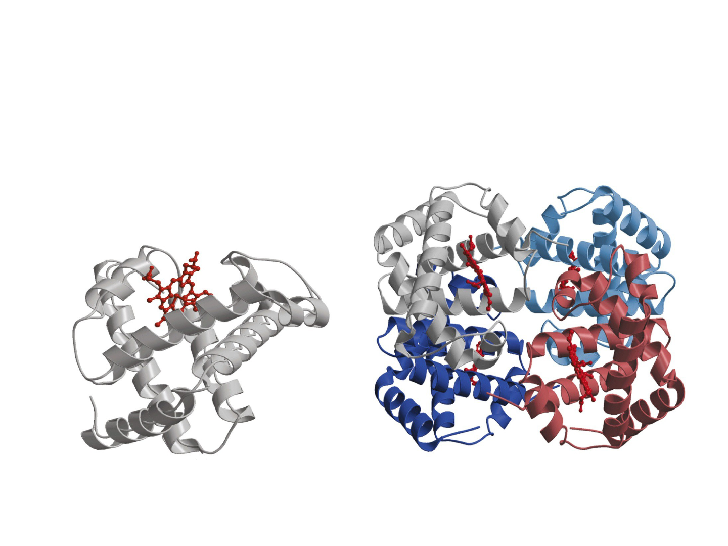 Proteínas globulares – ligação reversível de uma proteína a um ligante Hemeproteínas: transporte de oxigênio Mioglobina Hemoglobina Segmento -hélice Alça de ligação Grupamento heme • Armazenar e facilitar o transporte de oxigênio no músculo • Proteína intracelular músculo • Proteína monomérica contendo 153 resíduos de aminoácidos Mioglobina • O polipeptídeo é composto por 8 segmentos -hélices (A- H) conectados por alças (AB, CD, EF..) • Heme grupo prostético • Alta afinidade por O2 • Ferro forte tendência de ligar O2 • Ferro incorporado ao heme grupo prostético encontrado em proteinas transportadoras de O2 e citocromos Mioglobina: estrutura secundária e terciária -hélice Aminoácidos carregados são encontrados quase exclusivamente na superfície Grupamento heme localiza-se em uma fenda na molécula de globina, cercado de grupamentos apolares O interior da molécula é composto, praticamente, por aminoácidos hidrofóbicos Grupo heme Fe2+ Liga oxigênio reversivelmente Protoporfirina Grupo pirrólico Fe3+ O2 (oxidação) Heme Fe+2 O Fe2+ pode fazer 6 ligações coordenadas: é mantido no centro da molécula heme por ligações coordenadas aos quatro nitrogênios do anel de porfirina a Dois grupos propionil Quatro grupos metil Na protoporfirina IX os anéis pirrólicos apresentam como substituintes: Complexo de protoporfirina IX e íon ferroso Dois grupos vinil Fe2+ pode formar mais duas ligações adicionais: A sexta posição fica disponível para a ligação com o oxigênio. Tanto na mioglobina quanto na hemoglobina, a quinta ligação é feita com o aminoácido histidina (histidina F8 proximal). Quando o O2 se liga, as propriedades eletrônicas do ferro do heme se alteram Fe2+ O2 Fe3+ (oxidação) Cor púrpura do sangue venoso Vermelho brilhante do sangue arterial P + L ⇆ PL Kd Ka Ka = [PL] [P]·[L] Ka·[P]·[L] = [PL] = Sítios de ligação ocupados Sítios de ligação total = [PL] [PL] + [P] = Ka·[P]·[L] Ka·[P]·[L] + [P] = Ka·[P]·[L] Ka·[P]·[L] + [P] Ka·[P] Ka·[P] Ka·[P] [L] + 1 = [L] Ka Equações de equilíbrio Ka = constante de associação (M-1) (afinidade entre L e P)Kd = Ka 1 Kd = constante de dissociação (M) (Liberação do ligante da proteina) proteína ligante Proteína- ligante = saturação da proteína pelo ligante = [L] [L] + Kd Se = 0,5, então: Kd = [L] [L] (unidades arbitrárias) Kd = [Ligante] onde metade dos sítios de ligação disponíveis estão ocupados (meia saturação da P pelo L) A mioglobina é relativamente insensível a pequenas alterações na [O2]d, assim funciona bem como uma proteína armazenadora de O2. P50=0,26 kPa (O2 liga-se fortemente à mioglobina) = pO2 pO2 + P50 P50= Pressão parcial de O2 gasoso na qual a mioglobina está 50% saturada pO2= Pressão parcial do O2 na fase gasosa acima da solução Hemoglobina nos eritrócitos: transporte de O2 Eritrócitos são pequenos discos bicôncavos (diâmetro: 6 a 9 m) Ausência de organelas intracelulares Alta concentração de hemoglobina citosólica (34%) Transportar O2 dos pulmões para os tecidos periféricos 96% da hemoglobina saturada com O2 64% da hemoglobina saturada com O2 (Liberação de 1/3 do O2) Hemoglobina: transporte de O2 no sangue Tetrâmero: contém 2 cadeias (141 aminoácidos) e 2 cadeias (146 aminoácidos) – dímero de subunidades . 1 12 21 12 2 Os monômeros permanecem unidos por interações não- covalentes Hemoglobina: 4 grupos heme (1 para cada monômero) Mioglobina e hemoglobina: relação estrutural Grupo heme Mioglobina Cadeia da hemoglobina As estruturas tridimensionais das cadeias e e da mioglobina são similares. A cadeia e a mioglobina apresentam 8 segmentos -hélices (A- H), a cadeia não contém a hélice D Hemoglobina: estrutura quaternária As subunidades e fazem um contato extenso (interface - ): interações não-covalentes predominantemente hidrofóbicas, mas também pontes de hidrogênio e pares iônicos Interações fortes: interface 1-1 e 2-2 (35 resíduos de aminoácidos) Nas interfaces 1-2 e 2-1 as interações são mais fracas: envolvem 19 resíduos Permitem que os dímeros se movam um em relação ao outro Ligação do oxigênio à hemoglobina A mioglobina apresenta uma curva hiperbólica de ligação ao O2 liga o O2 com afinidade alta A hemoglobina apresenta uma curva sigmóide de ligação ao O2 transfere mais O2 para tecidos periféricos A curva sigmóide indica interação cooperativa entre os sítios de ligação A ligação do O2 a uma subunidade aumenta a afinidade das demais subunidades pelo O2 0,0 0,2 0,4 0,8 0,6 1,0 0,0 4,0 8,0 12 16 Pressão venosa Pressão arterial Hemoglobina Mioglobina pO2 (KPa) 0,5 - Hemoglobina: alterações conformacionais Forma T (desoxigenada) Forma R (oxigenada) A ligação do O2 provoca múltiplas alterações estruturais na molécula de hemoglobina Estudos com raio X revelaram 2 diferentes estruturas quaternárias: Desoxiemoglobina (T “tenso”): menor afinidade pelo O2 Oxiemoglobina (R “relaxado”): Alta afinidade pelo O2 (molécula mais compacta) estabilizado por muitos pares iônicos Oxi-Hb Desoxi-Hb 2 A rotação entre os dímeros 1-1 e 2-2 aproxima as subunidades do tetrâmero e estreita o canal central da hemoglobina A forma oxi (direita) forma canal mais apertado ao longo do espaço quando comparado à forma desoxi (acima). Hemoglobina: transição T R Hemoglobina: transição T R Ligação com O2: as subunidades individuais alteram-se pouco, mas os contatos 1-2 (e 2-1) sofrem um deslocamento A oxigenação provoca uma rotação de um dímero (1-1) em relação ao outro (2-2) em cerca de 15° Causam modificações estruturais quaternárias (os contatos 1-1 e 2-2 não são alterados significativamente) Desoxi Oxi Hemoglobina: alterações conformacionais Cooperatividade: a ligação do O2 a um grupo heme aumenta a afinidade dos demais grupos heme do tetrâmero pelo O2. Os grupos heme estão longe uns dos outros. Como um grupo heme altera a afin