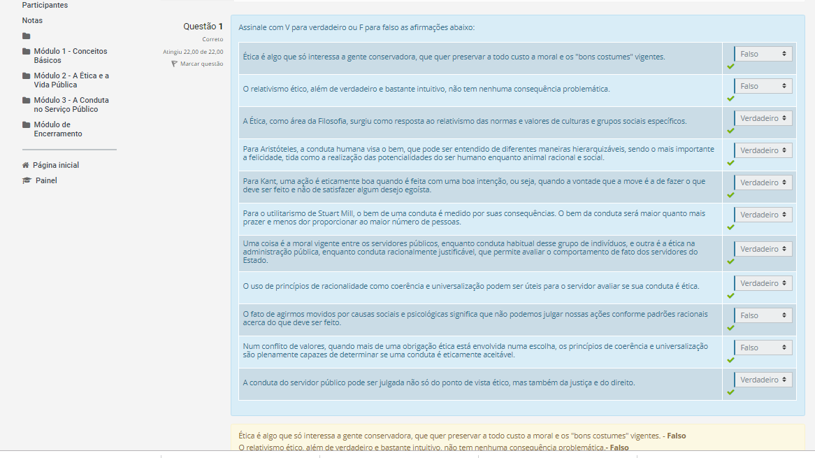 Assinale com V para verdadeiro para falso as afirmacoes abaixo: A ética é algo que só interessa a gente conservadora que quer preservar a todo custo a moral e 'bons costumes' vigentes. O relativismo ético, além de verdadeiro e bastante intuitivo, não tem nenhuma consequência problemática. A ética, como área da Filosofia, surgiu como resposta ao relativismo das normas e valores de culturas e grupos sociais específicos. Para Aristóteles, a conduta humana visa bem que pode ser entendido de diferentes maneiras hierarquizáveis sendo mais importante a felicidade tida como a realização das potencialidades do ser humano enquanto animal racional e social. Para Kant, uma ação é eticamente boa quando é feita com uma boa intenção, ou seja, quando a vontade que a move é a de fazer o que deve ser feito e não de satisfazer algum desejo egoísta. Para o utilitarismo de Stuart Mill, o bem de uma conduta é medido por suas consequências. O bem da conduta será maior quanto mais prazer e menos dor proporcionar ao maior número de pessoas. Uma coisa é a moral vigente entre servidores públicos, enquanto conduta habitual desse grupo de indivíduos, e outra é a ética na administração pública, enquanto conduta racionalmente justificável, que permite avaliar comportamento de fato dos servidores do Estado. Princípios de racionalidade como coerência e universalização podem ser úteis para o servidor avaliar se sua conduta é ética. O fato de agirmos movidos por causas sociais e psicológicas significa que não podemos julgar nossas ações conforme padrões racionais acerca do que deve ser feito. Num conflito de valores, quando mais de uma obrigação ética está envolvida numa escolha, princípios de coerência e universalização são plenamente capazes de determinar se uma conduta é eticamente aceitável. A conduta do servidor público pode ser julgada não só do ponto de vista ético, mas também da justiça e do direito.