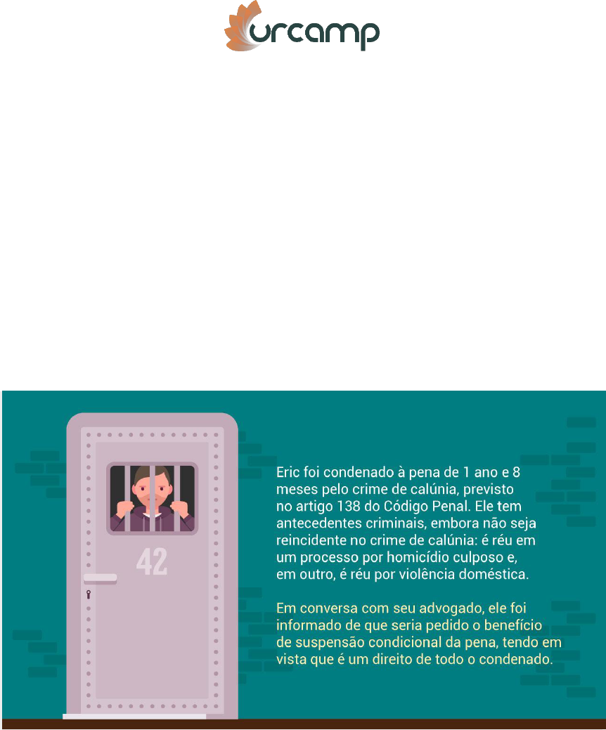 DIREITO PENAL – TEORIA DAS PENAS – PROFª MARIA LUIZA AVALIAÇÃO DE SALA DE AULA – 2º BIMESTRE – 3,0 pontos SUSPENSÃO CONDICIONAL DA PENA Faça a leitura do material disponibilizado no ambiente virtual (encontro 14), da legislação pertinente (código penal e lei de execução penal) e da doutrina referente ao tema e responda as seguintes questões: Data da entrega: 10/5/2019 DESAFIO: 1,0 Sabe-se que uma das formas de liberdade sob condições é a suspensão condicional da pena, ou sursis. Veja a seguinte situação: Você, como juiz desse processo e com base nos critérios legais, concederá o sursis a Eric? Se sim, de qual espécie? Lembre-se de justificar sua resposta. RESPONDA: 2.0 Um indivíduo condenado à pena de três anos e quatro meses poderá ser beneficiado com a suspensão condicional da pena? De acordo com o Código Penal, a quem é proibido conceder o sursis? A proibição de frequentar determinados lugares, a proibição de ausentar-se da comarca onde reside, sem autorização do juiz, e a necessidade de comparecer em juízo mensalmente são condições legais de qual espécie de sursis? Caso o réu, de maneira injustificada, não compareça à audiência admonitória, qual efeito incidirá no benefício da suspensão condicional da pena? De acordo com a lei 7.210/84, a condenação anterior à pena de multa não impede a concessão do sursis. Explique O sursis pode ser concedido ao réu reincidente. Comente a afirmativa. Em que situação pode-se falar em prorrogação do período de prova do sursis? Considerando o art. 81, I do C.P., quando deve ser praticado o crime doloso que dá origem a condenação definitiva que gera a revogação obrigatória do benefício?
