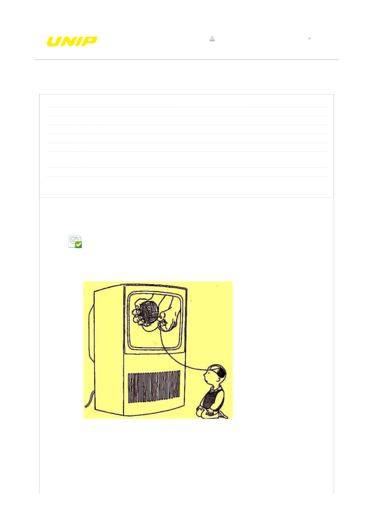 Revisar envio do teste: QUESTIONÁRIO UNIDADE I Estudos Disciplinares I 6664-10_SEI_AD_0118_R_20181 CONTEÚDO Usuário luana.jarra @unipinterativa.edu.br Curso Estudos Disciplinares I Teste QUESTIONÁRIO UNIDADE I Iniciado 17/04/18 15:41 Enviado 17/04/18 15:42 Status Completada Resultado da tentativa 5 em 5 pontos Tempo decorrido 1 minuto Resultados exibidos Todas as respostas, Respostas enviadas, Respostas corretas, Comentários, Perguntas respondidas incorretamente Pergunta 1 Leia a charge a seguir: I- O objetivo da ilustração é mostrar que os meios de comunicação tecem o conhecimento das crianças, contribuindo para um mundo mais bem informado. II- A ilustração é uma crítica aos meios de comunicação ultrapassados, que não promoviam o acesso à informação como a internet faz atualmente. III- A ilustração sugere que os meios de comunicação de massa provocam perda de autonomia do raciocínio. CONTEÚDOS ACADÊMICOS BIBLIOTECAS MURAL DO ALUNO TUTORIAISUNIP EAD 0,5 em 0,5 pontos luana.jarra @unipinterativa.edu.br 1 Resposta Selecionada: c. Respostas: a. b. c. d. e. Feedback da resposta: Está correto o que se afirma em: III. I. II. III. I e III. II e III. Resposta: C Comentário: I – Afirmativa incorreta: A ilustração é uma crítica ao modo como os meios de comunicação desfazem os pensamentos próprios dos indivíduos. II – Afirmativa incorreta: A crítica refere-se à falta de pensamento crítico que os meios de comunicação causam; não se trata de uma questão de desenvolvimento tecnológico. III – Afirmativa correta: A figura mostra a criança perdendo seu raciocínio próprio ao ficar exposta à televisão. Pergunta 2 Resposta Selecionada: a. Respostas: a. Leia a charge a seguir: Assinale a alternativa que indica um ditado popular que tenha relação com a charge. O maior cego é aquele que se recusa a ver. O maior cego é aquele que se recusa a ver. 0,5 em 0,5 pontos b. c. d. e. Feedback da resposta: Mais vale um pássaro na mão do que dois voando. Tão grande é o erro como o que erra. A grama do vizinho é sempre mais verde. As melhores essências estão nos menores frascos. Resposta: A Comentário: Na charge, o pássaro maior não percebe que, consideradas as proporções, ele está oprimido em um espaço menor do que o outro. Assim, a crítica da charge é em relação às pessoas que não enxergam a própria realidade. Pergunta 3 Leia a charge a seguir: I- O objetivo dos quadrinhos é mostrar que os preconceitos estão enraizados no nosso cotidiano e não incomodam ninguém. II- Os quadrinhos denunciam estereótipos sociais que se baseiam em uma visão racista. III- Os quadrinhos mostram que há pessoas que, no cotidiano, não percebem o teor racista de seus discursos. Está correto o que se afirma em: 0,5 em 0,5 pontos Resposta Selecionada: b. Respostas: a. b. c. d. e. Feedback da resposta: II e III. I, II e III. II e III. I e II. I e III. III, apenas. Resposta: B Comentário: I – Afirmativa incorreta. JUSTIFICATIVA. As personagens do desenho mostram-se incomodadas com o discurso racista. II – Afirmativa correta. JUSTIFICATIVA. Os quadrinhos mostram visões pré-concebidas de pessoas, com base na cor da pele. III – Afirmativa correta. JUSTIFICATIVA. Os quadrinhos denunciam o discurso racista, que, muitas vezes, é proferido sem que o enunciador admita ser preconceituoso. Pergunta 4 Leia a charge e as afirmativas a seguir: Disponível em: <goo.gl/RpC5cr>. Acesso em 08 fev. 2015. I. A charge enaltece a evolução humana, ilustrando a saída de um passado primitivo e a chegada ao desenvolvimento tecnológico, que melhora as condições de vida da população. II. O código de barras, na figura, representa a “coisificação” do homem no atual sistema socioeconômico. III. A crítica da charge refere-se ao uso de novas tecnologias na atualidade, uma vez que elas não são acessíveis a todos. IV. A charge mostra que o ser humano ainda é primitivo, apesar das novas tecnologias. Está correto o que se afirma em: 0,5 em 0,5 pontos Resposta Selecionada: b. Respostas: a. b. c. d. e. Feedback da resposta: II. II e IV. II. I e III. I e IV. II e III. Resposta: B Comentário: I – incorreta: A charge mostra a transformação do ser humano em código de barras, parodiando a tradicional ilustração da evolução do homem. Não há qualquer menção à melhoria das condições de vida; trata- se de uma crítica à sociedade de consumo. II – correta: O código de barras representa o consumo na nossa sociedade. Assim, vê-se que o homem transformou-se em mercadoria, perdendo sua identidade. III – incorreta: A charge não se refere ao acesso das pessoas às novas tecnologias. IV – incorreta: A charge mostra o homem “coisificado”, integrado ao mercado de consumo. Pergunta 5 Leia a charge e o texto a seguir: Marcondes Filho (1986) descreve a prática sensacionalista como nutriente psíquico, desviante ideológico e descarga de pulsões instintivas. Caracteriza sensacionalismo como “o grau mais radical da mercantilização da informação: tudo o que se vende é aparência e, na verdade, vende-se aquilo que a informação interna não irá desenvolver melhor do que a manchete. Esta está carregada de apelos às carências psíquicas das pessoas e explora-as de forma sádica, caluniadora e ridicularizadora. [...] No jornalismo sensacionalista, as notícias funcionam como pseudoalimentos às carências do espírito. [...] O jornalismo sensacionalista extrai do fato, da notícia, a sua carga emotiva e apelativa e a enaltece. Fabrica uma nova notícia que a partir daí passa a se vender por si mesma”. Disponível em <https://goo.gl/jhpMDN>. Acesso em 8 nov. 2014. 0,5 em 0,5 pontos Resposta Selecionada: e. Respostas: a. b. c. d. e. Feedback da resposta: Com base na leitura e nos seus conhecimentos, analise as asserções e assinale a alternativa correta. I. A reação do personagem diante da televisão revela uma visão antagônica àquela apresent