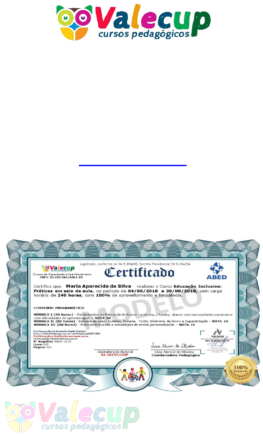 1 EDUCAÇÃO INCLUSIVA: Práticas de Sala de Aula ATENÇÃO: Se ainda não adquiriu seu Certificado de 240 horas de carga horária pelo valor promocional de R$ 67,00, adquira clicando no link abaixo, antes que a promoção acabe: https://bit.ly/2UQiEPo (Se o link não funcionar ao clicar, copie o link, cole-o no seu navegador e dê enter) IMPORTANTE: Certificado válido em todo o território nacional, com todos os requisitos para ser validado nas faculdades e outras instituições. Veja um Modelo do Certificado: OBS: 2019 Todos os direitos deste E-Book estão reservados à VALECUP CURSOS DE CAPACITAÇÃO LTDA, inscrita no CNPJ n° 20.282.662/0001-09 Os materiais abaixo estão disponíveis livremente na Internet e foram selecionados por nossos especialistas para compor o material do Curso gratuito. 2 BEM-VINDO AO CURSO! Curso de Capacitação e Aperfeiçoamento em Educação Inclusiva: Práticas em Sala de Aula DICAS IMPORTANTES PARA O BOM APROVEITAMENTO • O objetivo principal é aprender o conteúdo, e não apenas terminar o curso. • Leia todo o conteúdo com atenção redobrada, não tenha pressa. • Explore as ilustrações explicativas, pois elas são fundamentais para exemplificar e melhorar o entendimento sobre o conteúdo. • Quanto mais aprofundar seus conhecimentos mais se diferenciará dos demais alunos dos cursos. • O aproveitamento que cada aluno tem é o que faz a diferença entre os “alunos certificados” e os “alunos capacitados”. • A aprendizagem não se faz apenas no momento em que está realizando o curso, mas também durante o dia-a-dia. Ficar atento às coisas que estão à sua volta permite encontrar elementos para reforçar aquilo que foi aprendido. • Aplique o que está aprendendo. O aprendizado só tem sentido quando é efetivamente colocado em prática. 3 Sumário Curso de Capacitação e Aperfeiçoamento em Educação Inclusiva: Práticas em Sala de Aula ....................................................................................................... 2 DICAS IMPORTANTES PARA O BOM APROVEITAMENTO .................. 2 MÓDULO I – FUNDAMENTOS TEÓRICOS ........................................... 4 MÓDULO II - EDUCAÇÃO INCLUSIVA PARA QUE TE QUERO? POR UMA ESCOLA QUE INCLUI E NÃO APENAS INSERE ...................... 20 MÓDULO III - NÓS, PROFESSORES E A INCLUSÃO: PROBLEMA OU SOLUÇÃO? ............................................................................................ 34 MÓDULO IV - A INCLUSÃO ESCOLAR DE UM ALUNO COM AUTISMO: DIFERENTES TEMPOS DE ESCUTA, INTERVENÇÃO E APRENDIZAGENS ...................................................................................... 79 MÓDULO V - OS DESAFIOS DA EDUCAÇÃO INCLUSIVA ............ 104 MÓDULO VI - CONCEITO DE EDUCAÇÃO ESPECIAL E DE EDUCAÇÃO INCLUSIVA ........................................................................ 113 REFERÊNCIAS .......................................................................................... 117 4 MÓDULO I – FUNDAMENTOS TEÓRICOS1 Autor: Leandro Rodrigues O que é Educação Inclusiva? Educação Inclusiva pode ser compreendida como uma reviravolta institucional que consiste no fim dos iguais x diferentes, normais x deficientes. Espere. Vamos definir com outras palavras. Educação Inclusiva é uma educação voltada para a cidadania global, plena, livre de preconceitos e que reconhece e valoriza as diferenças. Sim. Valorizar as diferenças é a chave. As diferenças sempre existiram. Na educação inclusiva elas precisam ser reconhecidas e valorizadas, sem preconceito. 1Módulo I – reprodução total - O que é Educação Inclusiva? Um Passo a Passo para a Inclusão Escolar - Autor: Leandro Rodrigues – Disponível em: http://institutoitard.com.br/o-que-e-educacao- inclusiva/ 5 A inclusão prevê a inserção escolar de forma radical, completa e sistemática. Todos os alunos, sem exceção, devem frequentar as salas de aula do ensino regular. Isso mesmo, na educação inclusiva todos os alunos devem fazer parte da escola comum. Radical? Sem dúvida. O radicalismo da inclusão vem do fato de exigir uma mudança de paradigma educacional. É o fim da subdivisão Ensino Especial x Ensino Regular. As escolas inclusivas atendem às diferenças sem discriminar, sem trabalhar à parte com alguns alunos, sem estabelecer regras específicas para se planejar, para aprender, para avaliar. Para uma melhor definição de escola inclusiva precisamos deixar bem claro a diferença entre educação especial e educação inclusiva, que é o assunto do próximo tópico. Qual é a diferença entre Educação Especial e Educação Inclusiva? A diferença está no termo INCLUSIVA. Segundo a psicóloga Marina Almeida, no “Manual Informativo sobre inclusão: informativo para educadores”, podemos definir educação especial e educação inclusiva da seguinte forma: Conceito de Educação Especial: Educação especial é uma modalidade de ensino que visa promover o desenvolvimento das potencialidades de pessoas portadoras de necessidades 6 especiais, condutas típicas ou altas habilidades, e que abrange os diferentes níveis e graus do sistema de ensino. Ou seja, uma modalidade de ensino para pessoas com deficiência ou altas habilidades. Conceito de Educação Inclusiva: Na escola inclusiva o processo educativo deve ser entendido como um processo social, onde todas as crianças portadoras de necessidades especiais e de distúrbios de aprendizagem têm o direito à escolarização o mais próximo possível do normal. Ou seja, uma modalidade de ensino para todos. Percebeu a diferença? Educação Especial e Inclusiva Não existem alunos sem deficiência na educação especial. Já na educação inclusiva todos os alunos com e sem deficiência tem a oportunidade de conviverem e aprenderem juntos. É o que Mantoan chamou de cidadania global, plena, livre de preconceitos e que reconhece e valoriza as diferenças. A inclusão promove a diversidade. 7 A 
