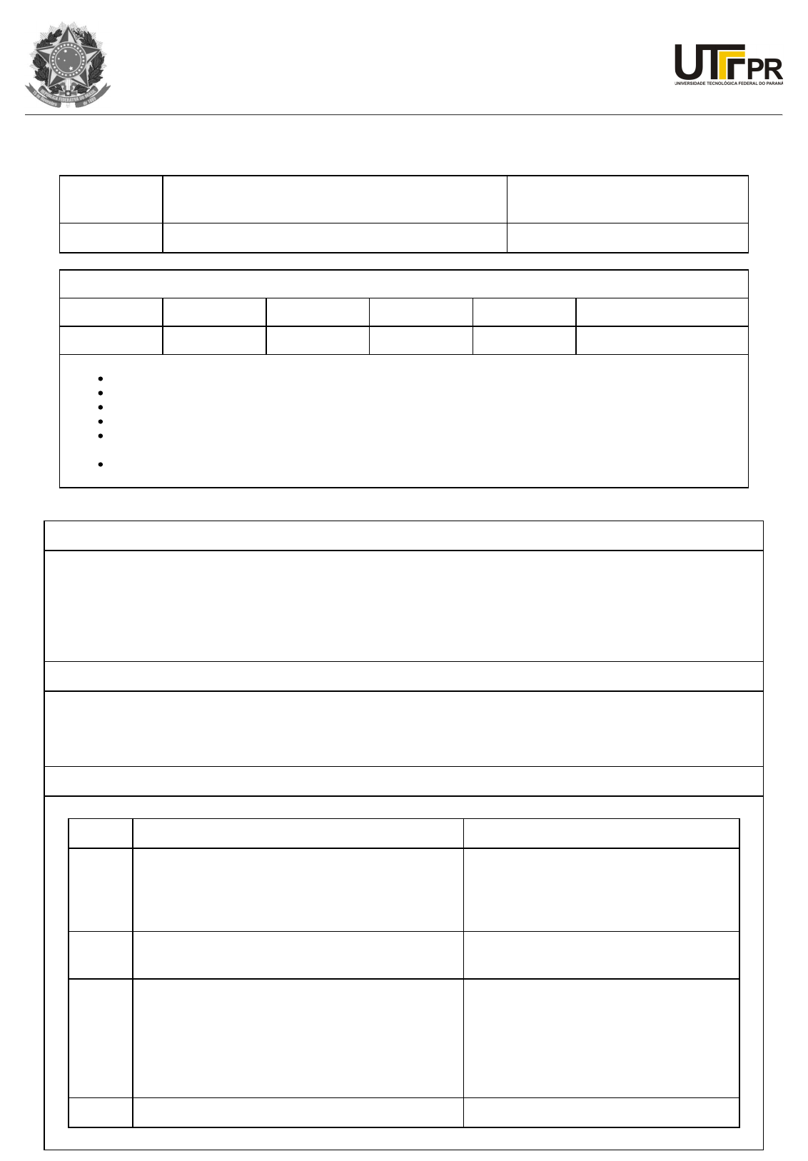 Ministério da Educação Universidade Tecnológica Federal do Paraná Câmpus Curitiba Informações da disciplina Código Ofertado Disciplina/Unidade Curricular Modo de Avaliação QB75H Fundamentos De Biologia Celular Nota/Conceito E Frequência Carga Horária AT AP APS AD APCC Total 2 0 2 0 0 30 AT: Atividades Teóricas (aulas semanais). AP: Atividades Práticas (aulas semanais). APS: Atividades Práticas Supervisionadas (aulas no período). AD: Atividades a Distância (aulas no período). APCC: Atividades Práticas como Componente Curricular (aulas no período, esta carga horária está incluída em AP e AT). Total: carga horária total da disciplina em horas. Objetivo Compreender a estrutura geral das células pro e eucariontes. Reconhecer as funções e mecanismos das organelas celulares, assim como o funcionamento da célula como um todo. Compreender os processos envolvendo a divisão celular em organismos eucariontes. Compreender o funcionamento do microscópio óptico. Ementa Estrutura e ultra-estrutura dos componentes celulares. Métodos de estudo da célula. Anatomia funcional de células procarióticas e eucarióticas. Ciclo celular. Conteúdo Programático Ordem Ementa Conteúdo 1 Estrutura e ultra-estrutura dos componentes celulares. Características gerais e diferenciais de células procarióticas e eucarióticas. Composição química das células. 2 Métodos de estudo da célula. Métodos e técnicas de visualização e estudo das células. 3 Anatomia funcional de células procarióticas e eucarióticas. Membrana plasmática. Mecanismos de transporte de substâncias. Citoesqueleto. Organelas celulares: visão geral; organelas envolvidas com processamento de proteínas. Mitocôndrias. 4 Ciclo celular. Núcleo. Ciclo celular. 1 de 2 22/06/2017 10:48 Bibliografia Básica JUNQUEIRA, Luiz Carlos Uchôa; CARNEIRO, José. Biologia celular e molecular. 8. ed. Rio de Janeiro, RJ: Guanabara Koogan, c2005. 332 p. ISBN 8522710455. ALBERTS, Bruce et al. Biologia molecular da célula. 5. ed. Porto Alegre, RS: Artmed, 2010. xxxvi, 1268 [90] p. + 1 CD-ROM (4 ¾ pol.) ISBN 9788536320663. ALBERTS, Bruce. Biologia molecular da célula. 4. ed. Porto Alegre: Artmed, 2004. xxxiv, 1463 p. + 1 CD-ROM ISBN 8536302720. Bibliografia Complementar MADIGAN, Michael T. Microbiologia de Brock. 12. ed. Porto Alegre: Artmed, 2010. xxxii, 1128 p. ISBN 9788536320939. KÜHNEL, Wolfgang. Citologia, histologia e anatomia microscópica: texto e atlas. 11. ed., atual. e ampl. Porto Alegre, RS: Artmed, 2005. 535 p. ISBN 853630362X JUNQUEIRA, Luiz Carlos Uchôa; CARNEIRO, José. Biologia celular e molecular. 7. ed. Rio de Janeiro: Guanabara Koogan, c2000. 339 p. ISBN 8522705885 GUYTON, Arthur C.; HALL, John E. Tratado de fisiologia médica. Rio de Janeiro, RJ: Elsevier, c2006. xxxvi, 1115 p. ISBN 9788535216417. DE ROBERTIS, E. M. F.; HIB, José. Bases da biologia celular e molecular. 4. ed. rev. e atual. Rio de Janeiro, RJ: Guanabara Koogan, 2006. 389 p. ISBN 8527712032. # Resumo da Alteração Edição Data Aprovação Data 1 Nenhuma alteração. Danielle Caroline Schnitzler 18/05/2016 Danielle Caroline Schnitzler 30/05/2016 22/06/2017 10:46 2 de 2 22/06/2017 10:48
