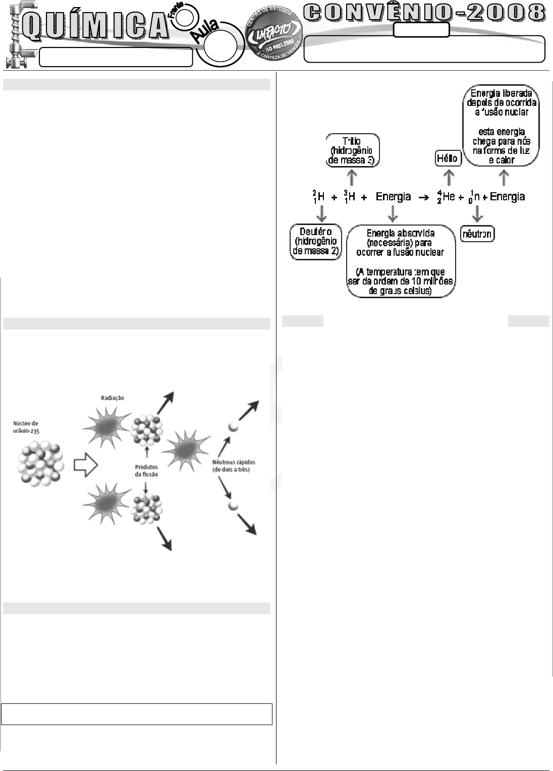 KL010208 LEIS DA RADIOATIVIDADE FAÇO IMPACTO - A CERTEZA DE VENCER!!! PROFº: THOMAS JEFFERSON Fa le c on os co w w w .p or ta lim pa ct o. co m .b r VE ST IB UL AR – 2 00 9 CONTEÚDO A Certeza de Vencer 02 2 RADIOATIVIDADE ARTIFICIAL Produz-se a radioatividade induzida quando se bombardeiam certos núcleos com partículas apropriadas. Se a energia destas partículas tem um valor adequado, elas penetram no núcleo bombardeado formando um novo núcleo que, no caso de ser instável, se desintegra posteriormente. Foi descoberta pelo casal “Joliot-Curie” (Frédéric Joliot e Irène Joliot-Curie), bombardeando núcleos de boro e alumínio com partículas alfa. Observaram que as substâncias bombardeadas emitiam radiações após retirar o corpo radioativo emissor das partículas alfa. O estudo da radioatividade permitiu um maior conhecimento da estrutura dos núcleos atômicos e das partículas subatômicas. Abriu-se a possibilidade da transmutação dos elementos, ou seja, a transformação de elementos em elementos diferentes. Inclusive o sonho dos alquimistas de transformar outros elementos em ouro se tornou realidade, mesmo que o processo economicamente não seja rentável. FISSÃO NUCLEAR A fissão nuclear é o processo que ocorre com a quebra de núcleos maiores em núcleos menores. Essas reações liberam grande quantidade de energia. A quebra é feita através do bombardeamento do núcleo com nêutron. Ao atingir o primeiro núcleo há a liberação de nêutrons que vão acertar outros núcleos que liberam mais nêutrons e assim por diante. FUSÃO NUCLEAR A fusão nuclear é a união de núcleos menores formando núcleos maiores. A reação de fusão nuclear requer uma quantidade muito grande de energia para ocorrer. E quando ocorre há liberação de uma quantidade enorme de energia. Para termos uma idéia é a mesma reação que ocorre nas estrelas, logo no sol que é mais importante delas. Toda energia produzida no sol é formada da fusão nuclear Uma das reações de fusão nuclear que ocorre no sol é representada pela equação: EXERCÍCIOS PARA OS VENCEDORES QUESTÃO 01. Um radioisótopo emite uma partícula α e posteriormente uma partícula β, obtendo-se ao final o elemento 91Pa234. O número de massa e o número atômico do radioisótopo original são, respectivamente: a) 238 e 92 b)90 e 234 c) 237 e 92 d)92 e 237 QUESTÃO 02. Em 09/02/96 foi detectado um átomo do elemento químico 112, num laboratório da Alemanha. Provisoriamente denominado de unúmbio, 112Uub, e muito instável, teve tempo de duração medido em microssegundos. Numa cadeia de decaimento, por sucessivas emissões de partículas alfa, transformou-se num átomo de férmio, elemento químico de número atômico 100. Quantas partículas alfa foram emitidas na transformação 112Uub → 100Fm? a) 6 b) 7 c) 8 d) 10 QUESTÃO 03. O polônio radioativo Po215 se desintegra em chumbo Pb207 pela emissão global de iguais quantidades de partículas alfa e beta. Com relação ao Po215 podemos concluir que seu núcleo possui: a) 82 prótons e 133 nêutrons b) 84 prótons e 131 nêutrons c) 86 prótons e 129 nêutrons d) 88 prótons e 127 nêutrons e) 90 prótons e 125 nêutrons FAÇO IMPACTO – A CERTEZA DE VENCER!!! Fa le c on os co w w w .p or ta lim pa ct o. co m .b r VE ST IB UL AR – 20 09 QUESTÃO 04. A partir da década de 40, quando McMillan e Seaborg obtiveram em laboratório os primeiros elementos transurânicos (NA > 92), o urânio natural foi usado algumas vezes para obter tais elementos. Para tanto, ele era bombardeado com núcleos de elementos leves. Na obtenção do Plutônio, do Califórnio e do Férmio as transmutações ocorreram da forma a seguir: ( ) ( ) ( ) 238 4 239 1 92 2 94 0 238 12 245 1 92 6 98 0 238 16 250 1 92 8 100 0 U He Pu A n U C Cf B n U O Fm C n + → + + → + + → + Sendo assim, os valores de A, B e O que indicam as quantidades de nêutrons obtidas são respectivamente: a) 1, 4 e 5 b) 1, 5 e 4 c) 2, 4 e 5 d) 3, 4 e 5 e) 3, 5 e 4 QUESTÃO 05. No dia 6 de agosto próximo passado, o mundo relembrou o cinqüentenário do trágico dia em que Hiroshima foi bombardeada, reverenciando seus mortos. Uma das possíveis reações em cadeia, de fissão nuclear do urânio 235 usado na bomba, é: 235 1 139 94 92 0 56 36U n Ba Kr X energia+ → + + + Onde X corresponde a: a) 1H3 b) 3 0n1 c) 2 0n1 d) 2α4 e) 1D2 QUESTÃO 06. O reator atômico instalado no município de Angra dos Reis é do tipo PWR - Reator de Água Pressurizada. O seu princípio básico consiste em obter energia através do fenômeno “fissão nuclear”, em que ocorre a ruptura de núcleos pesados em outros mais leves, liberando grande quantidade de energia. Esse fenômeno pode ser representado pela seguinte equação nuclear: 1 235 144 1 0 92 55 0n U Cs T 2 n energia+ → + + + Os números atômicos e de massa do elemento T estão respectivamente indicados na seguinte alternativa: a) 27 e 91 b) 37 e 90 c) 39 e 92 d) 43 e 93 QUESTÃO 07. Parte da energia elétrica distribuída no Brasil provém da usina nuclear instalada em Angra dos Reis, no Estado do Rio de Janeiro. Nessa usina, a energia térmica liberada do processo de fissão nuclear é aproveitada para aquecer certa quantidade de água até a ebulição, resultando numa corrente de vapor d’água que impulsiona a turbina de um equipamento gerador de corrente elétrica. Um exemplo típico de reação de fissão nuclear é representado pela equação abaixo: 235 1 89 x 1 92 0 36 y 0U n Kr Ba 3 n+ → + + Os números atômicos (Y) e de massa (X) do isótopo de Bário, formado nessa reação, são, respectivamente, iguais a: a) 56 e 144 b) 56 e 143 c) 53 e 143 d) 53 e 144 QUESTÃO 08. Em recente experimento com um acelerador de partículas, cientistas norte-americanos conseguiram sintetizar um novo elemento químico. Ele foi produzido a partir de átomos de cálcio (Ca), de número de massa 48, e de átomos de plutônio (Pu), de número de massa 244. Com um choque efe