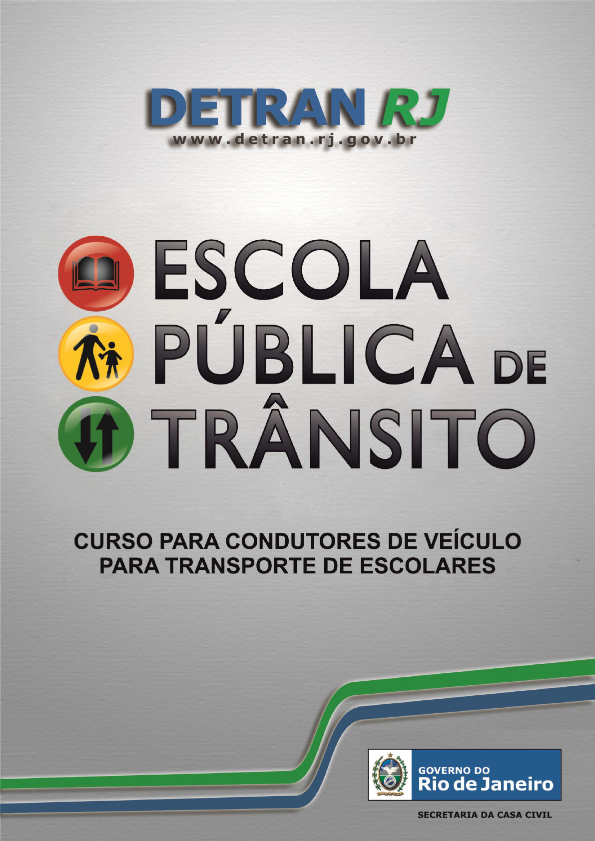 1 APRESENTAÇÃO A Escola Pública de Trânsito do DETRAN-RJ está voltada ao exercício da cidadania no trânsito, priorizando as ações de responsabilidade social que permitam a inclusão social e a redução da desigualdade mediante a capacitação da população com mais necessidades de cursos e projetos educativos. Visando à formação e qualificação de condutores habilitados, a Escola Pública de Trânsito habilita e capacita os condutores, de modo a desenvolver neles valores essenciais para auxiliar na transformação e na preservação de um trânsito mais seguro e com menos riscos de acidentes. Na busca por formar condutores conscientes e responsáveis, os condutores habilitados ou em processo de habilitação recebem, da Escola Pública de Trânsito, conhecimentos indispensáveis ao dia a dia no trânsito. São ofertados nos cursos: aprendizado da legislação de trânsito vigente, direção defensiva, primeiros socorros, cidadania (deveres e direitos), preservação do meio ambiente, dentre outros. Uma vez que exista um projeto como este, que através da educação visa a uma melhora no trânsito por meio de uma mudança positiva nas atitudes dos condutores, podemos esperar um trânsito mais seguro, com condutores mais educados e pacientes. É certo de que a educação no trânsito pode salvar muitas vidas. Educar-se faz toda a diferença, para você e para o próximo. 2 ÍNDICE Legislação de Trânsito 3 Legislação Específica para Transporte Escolar 18 Exercícios Legislação de Trânsito para transporte de escolares 26 Direção Defensiva 27 Exercícios de Direção Defensiva 38 Relacionamento Interpessoal 39 Exercícios de Relacionamento Interpessoal 52 Noções de Primeiros Socorros 53 Exercícios (parte 1) Noções de Primeiros Socorros 54 Exercícios (parte 2) Noções de Primeiros Socorros 65 Exercícios (parte 3) Noções de Primeiros Socorros 71 Fatores de Risco para acidentes de trânsito 72 Exercício de Fatores de Risco para acidentes de trânsito 75 Respeito ao Meio Ambiente 76 Exercício de Respeito ao Meio Ambiente 80 Convívio Social 81 Exercícios de Convívio Social 89 Gabarito dos exercícios e bibliografia 90 3 LEGISLAÇÃO DE TRÂNSITO 1 – REGULAMENTAÇÃO DO TRÂNSITO BRASILEIRO O trânsito brasileiro é regulamentado pela Lei 9.503/97 – Código de Trânsito Brasileiro – CTB, e pelas Resoluções complementares. Além do CTB e das Resoluções, os Estados complementam a legislação por meio de Portarias e Decretos. Os órgãos de trânsito municipais também têm autonomia para normatizar detalhes do trânsito, que não são os mesmos em todas as cidades, exigindo atenção por parte dos condutores. 2 – CÓDIGO DE TRÂNSITO BRASILEIRO (CTB) O Código define atribuições das diversas autoridades e órgãos ligados ao trânsito, fornece diretrizes para a Engenharia de Tráfego e estabelece normas de conduta, infrações e penalidades para diversos usuários deste complexo sistema. CTB – Art. 1º: “O trânsito de qualquer natureza nas vias terrestres do território nacional, abertas a circulação, rege-se por este Código”. § 2º- “O trânsito, em condições seguras, é um direito de todos e dever dos órgãos e entidades competentes do Sistema Nacional de Trânsito, a estes cabendo, no âmbito das respectivas competências, adotar as medidas destinadas a assegurar esse direito”. Art. 5° “Sistema Nacional de Trânsito (SNT) é um conjunto de órgãos e entidades que tem por finalidade o exercício das atividades de planejamento, administração, normatização, pesquisa, registro e licenciamento de veículos, formação, habilitação e reciclagem de condutores, educação, engenharia, operação do sistema viário, policiamento, fiscalização, julgamento de infrações e de recursos e aplicação das penalidades”. 3 – SENTIDO AMPLO DA PALAVRA LEI No seu sentido mais amplo, o termo “lei” significa sempre ordenação através de regularidades. Todo condutor tem a obrigação de conhecer as leis de trânsito, o dever social de cumpri-las, e estará sujeito a multas e penalidades toda vez que transgredi-las. De acordo com o Art. 1º, os órgãos e entidades componentes do SNT respondem, no âmbito das respectivas competências, objetivamente, por danos causados aos cidadãos em virtude de ação, omissão ou erro na execução e manutenção de programas, projetos e serviços que garantam o exercício do direito do trânsito seguro. 4 4 – CATEGORIA DE HABILITAÇÃO E RELAÇÃO COM VEÍCULOS CONDUZIDOS Todo condutor deve possuir um documento de habilitação, denominado Carteira Nacional de Habilitação (CNH). O art. 143 estabelece que os candidatos à CNH podem habilitar -se nas categorias de A a E: 5 – DOCUMENTAÇÃO EXIGIDA PARA O CONDUTOR E O VEÍCULO Os condutores de veículos de transporte coletivo de passageiros devem obrigatoriamente portar o original: Da CNH (devendo estar habilitados nas Categorias D ou E). Do Certificado de Registro e Licenciamento de Veículo – CRLV. A Resolução do Contran nº 205, de 10 de novembro de 2006, estabelece os documentos de porte obrigatório e também determina que esses documentos devem ser originais. De acordo com o artigo 133 do CTB, o porte do CRLV será dispensado quando, no momento da fiscalização, for possível ter acesso ao devido sistema informatizado para verificar se o veículo está licenciado. Os condutores de veículos de transporte de escolares também devem portar o comprovante de realização do Curso Especializado para Condutores de Veículos de Transporte de Escolar, dando a ele a condição. O porte desse documento é obrigatório até que essa informação seja incluída no Registro Nacional de Carteira de Habilitação (RENACH). O RENACH é um banco de dados nacional que registra toda a vida do condutor de veículo. O condutor deve portar o certificado apenas até emitir uma nova CNH, onde conste que ele está habilitado para esse transporte. 5 
