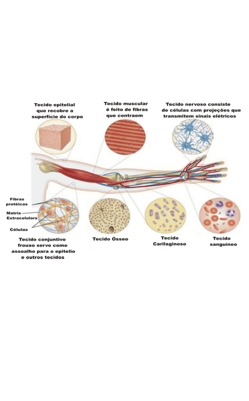 Tipos de Tecidos Nos animais vertebrados há quatro grandes grupos de tecidos: o muscular, o nervoso, o conjuntivo(abrangendo também os tecidos ósseo, cartilaginoso e sanguíneo) e o epitelial, constituindo subtipos específicos que irão formar os órgãos e sistemas corporais. Por exemplo: O sangue é considerado um tecido conjuntivo, com diversificadas células (as hemácias, os leucócitos e as plaquetas) e o plasma (água, sais minerais e diversas proteínas). Nos invertebrados estes tipos de tecido são basicamente os mesmos, porém com organizações mais simples. A maioria dos tecidos além de serem compostos de células, apresentam entre elas substâncias intracelulares (intersticiais). Especificação dos tecidos básicos Epitélio → revestimento da superfície externa do corpo (pele), os órgãos (fígado, pulmão e rins) e as cavidades corporais internas; Conjuntivo → constituído por células e abundante matriz extracelulas, com função de preenchimento, sustentação e transporte de substâncias; Muscular → constituído por células com propriedades contráteis; Nervoso → formado por células que constituem o sistema nervoso central e periférico (o cérebro, a medula espinhal e os nervos). Tecido epitelial A superfície externa do corpo e as cavidades corporais internas dos animais são revestidas por este tecido. O tecido epitelial desempenha várias funções no organismo, como proteção do corpo (pele), absorção de substâncias úteis (epitélio do intestino) e percepção de sensações (pele),dependendo do órgão aonde se localizam. Os tecidos epiteliais ou epitélios têm células perfeitamente justapostas, unidas por pequena quantidade de material cimentante, com pouquíssimo espaço intercelular. Os epitélios não são vascularizados e não sangram quando feridos. A nutrição das células se faz por difusão a partir dos capilares existentes em outro tecido, o conjuntivo, adjacente ao epitélio a ele ligado. O arranjo das células epiteliais pode ser comparado ao de ladrilhos ou tijolos bem encaixados. Os epitélios podem ser classificados quanto ao número de células: Quando os epitélios são formados por uma só camada de células, são chamados de epitélios simples ou uniestratificados (do latim uni, um, e stratum, camada). Já os epitélios formados por mais de uma camada de células são chamados estratificados. Existem ainda epitélios que, apesar de formados por uma única camada celular, têm células de diferentes alturas, o que dá a impressão de serem estratificados. Por isso, eles costumam ser denominados pseudo-estratificados. Quanto à forma das células, os epitélios podem ser classificados em: Pavimentosos, quando as células são achatadas como ladrilhos; Cúbicos, quando as células tem forma de cubo, ou Prismáticos, quando as células são alongadas , em forma de coluna. No epitélio que reveste a bexiga, a forma das células é originalmente cúbica, mas elas se tornam achatadas quando submetidas ao estiramento causado pela dilatação do órgão. Por isso, esse tipo de epitélio é de denominado, por alguns autores, epitélio de transição. Os tecidos epiteliais, também chamados epitélios, são classificados em dois tipos principais: epitélios de revestimento e epitélios glandulares. Epitélios de revestimento Funciona como uma membrana que isola o organismo, ou parte dele, do meio externo. Está relacionado ao revestimento e proteção de superfícies externas (por exemplo, na pele) e internas (por exemplo, no estômago). Atua, também, na absorção de substâncias, na secreção de diversos produtos, na remoção de impurezas e pode conter vários tipos de receptores sensoriais (notadamente na pele). Pele: Órgão de contato Nos vertebrados, a pele é importante órgão de contato com o meio. A conquista do ambiente terrestre pelos vertebrados tornou-se possível, entre outras coisas, a partir do isolamento e proteção do corpo e de mecanismos de relação do ser vivo com o meio. O tato, a visão, a olfação, a gustação e a audição são úteis no relacionamento do animal com o ambiente. A pele, órgão responsável pelas sensações táteis, apresenta diferentes tipos de “sensores”, que registram e informam ao ser vivo variações de temperatura (calor ou frio) e pressão (toques, choques, pancadas). A pele é, ainda, importante órgão de defesa contra diversos tipos de agentes infecciosos. Tecido Epitelial de Revestimento Pluriestratificado Pavimentoso Queratinizado. Microscopia óptica. (E) Epiderme, (D) Derme, (SC) Células queratinizadas e cera. Considerando o corpo inteiro, a pele de uma pessoa chega a pesar 5 Kg e tem uma área total de 18 m2. É, portanto o maior órgão do nosso corpo. A histologia da pele Nos mamíferos, a pele é órgão composto por duas camadas: epiderme e derme. A epiderme é um tecido epitelial pluriestratificado. É formada por estratos (ou camadas), dos quais destacam-se o estrato basal (também chamado de estrato germinativo), que fica apoiado na derme e é formado por células de aspecto cúbico. Nessa camada é intensa a atividade de divisão celular mitótica, que repõe constantemente as células perdidas no desgaste diário a que a superfície desse tecido está sujeito. À medida que novas células são formadas, elas vão sendo “empurradas” para formar as demais células, até ficarem expostas na superfície da pele. A derme é uma camada formada por tecido conjuntivo do tipo denso, cujas fibras ficam orientadas em diversas direções. Vários tipos de células são encontrados, destacando-se os fibroblastos e os macrófagos. Nervos, terminações nervosas, diferentes tipos de corpúsculos sensoriais e uma ampla rede de capilares sangüíneos cruzam a derme em várias direções. Ela é um importante tecido de manutenção e de apoio. Os nutrientes existentes no sangue difundem-se para as células epidérmicas. Nos mamíferos, a derme é atravessada por finas