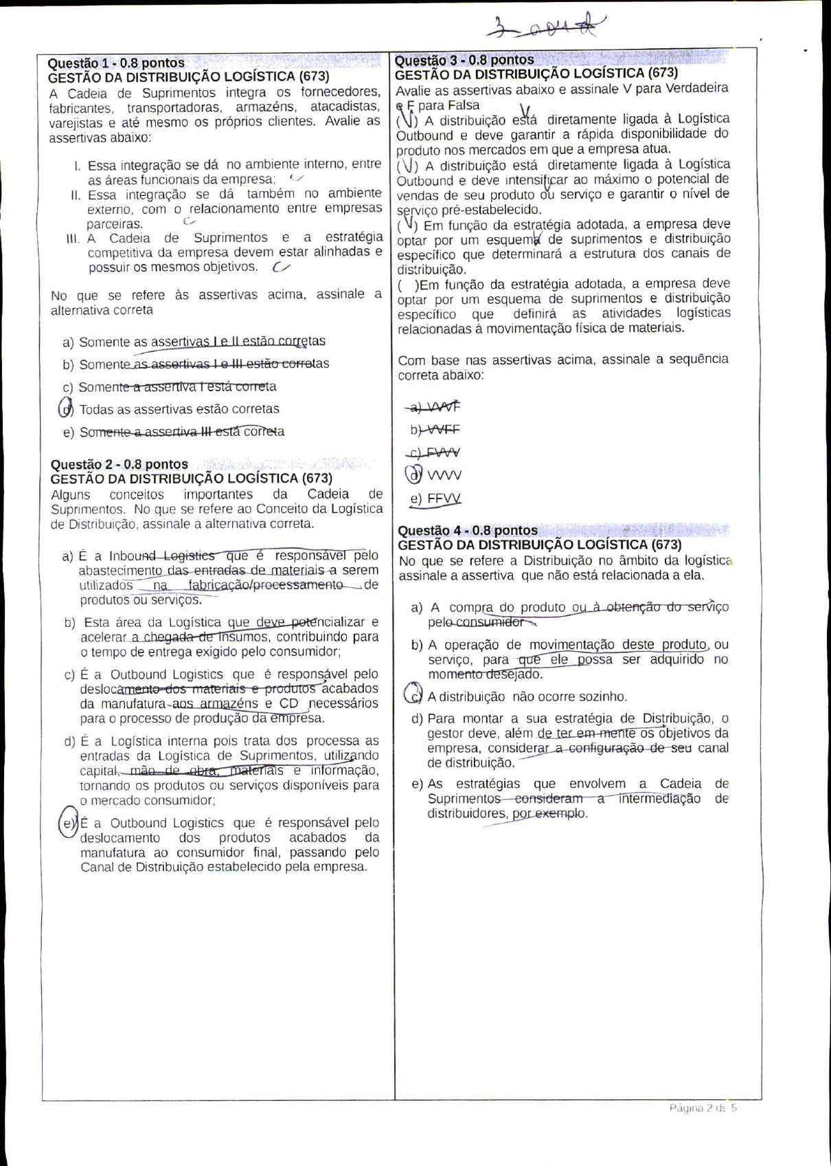 Questão 1 - 0.8 pontos GESTÃO DA DISTRIBUJÇÃO LOGÍSTICA (673) A Cadeia de Suprimentos integra os fornecedores, fabricantes, transportadoras, armazéns, atacadistas, varejistas e até mesmo os próprios clientes. Avalie as assertivas abaixo: I. Essa integração se dá no ambiente interno, entre as áreas funcionais da empresa; ' II. Essa integração se dá também no ambiente externo, com o relacionamento entre empresas parceiras. \\\. A Cadeia de Suprimentos e a estratégia competitiva da empresa devem estar alinfiadas e possuir os mesmos objetivos. No que se refere às assertivas acima, assinale a alternativa correta a) Somente l p II P<;tãn norj-pta-; b) Somenie-as-assertivas I o III ootao corrotas c) Somente a assélllva I está uuiieia Todas as assertivas estão corretas e) Samentn n nnnnrtiva lll-est^corTeta Questão 2 - 0.8 pontos GESTÃO DA DISTRIBUIÇÃO LOGÍSTICA (673) Alguns conceitos importantes da Cadeia de Suprimentos. No que se refere ao Conceito da Logística de Distribuição, assinale a alternativa correta. a) E a lnboufid-L©§«ttes:^que é responsável pelo ahaQrprimpnrn das.-rntrnring_f1p iTiater'aig--a Serem Utilizados , de produtos óíTserviçõs. b) Esta área da Logísiicaque^dsiffi-peí^ncializar e arelerrir n rhpgartB-rf^^siimns ^^ntrihi iind^ para o tempo de entrega exigido pelo consumidor; c) É a Outbound Logistics que é responsável pelo deslocamento^us iiiateiiais e piuUulUS"acabados da maniifaTiira.-ans; armq7éns e CD neceSSárioS para o processo de produto da empresa. d) É a Logística interna pois trata dos processa as entradas da Logística de Suprimentos, utili^ndo rnritnl mnn rir nfíjTr^ntrrlmn n int^rnín-^^^n. tornando os produtos ou serviços disponíveis para o mercado consumidor; íewÉ a Outbound Logistics que é responsável pelo ^deslocamento dos produtos acabados da manufatura ao consumidor final, passando pelo Canal de Distribuição estabelecido pela empresa. Questão 3 - 0.8 pontos GESTÃO DA DISTRIBUIÇÃO LOGÍSTICA (673) Avalie as assertivas abaixo e assinale V para Verdadeira 8 F para Falsa w (\[) A distribuição está diretamente ligada à Logística Outbound e deve garantir a rápida disponibilidade do produto nos mercados em que a empresa atua. (\J} A distribuição está diretamente ligada à Logística Outbound e deve intensificar ao máximo o potencial de vendas de seu produto ou serviço e garantir o nível de serviço pré-estabelecido. (V) Em função da estratégia adotada, a empresa deve optar por um esquem^í^ de suprimentos e distribuição específico que determinará a estrutura dos canais de distribuição. ( )Em função da estratégia adotada, a empresa deve optar por um esquema de suprimentos e distribuição específico que definirá as atividades logísticas relacionadas à movimentação física de materiais. Com base nas assertivas acima, assinale a seqüência correta abaixo: @ WW e) F^ Questão 4 - 0.8 pontos GESTÃO DA DISTRIBUIÇÃO LOGÍSTICA (673) No que se refere a Distribuição no âmbito da logística assinale a assertiva que não está relacionada a ela. a) A compra do produto^ peÍG-oiDsumfeer^ b) A operação de rnovimentação deste produto^ ou sen/iço. para -gog^le possa ser adquirido no momeiitu desejado. O A distribuição não ocorre sozinho. d) Para montar a sua estratégia de Distribuição, o gestor deve. além deJÊLfiffFfneme os objetivos da empresa, consideigL-a configuração de-seo canal de distribuição. e) As estratégias que envolvem a Cadeia de distribuidores^^QT-exempk). ? il-: 5 Questão 5 - 0.8 pontos GESTÃO DA DISTRIBUiÇÃO LOGÍSTICA (673) Os principais integrantes de um Canal de Distribuição são; I - Fabricantes: detentores dos produtos e da sua fabricação, ou seja, são as empresas que dão origem aos produtos ou serviços que estão sendo vendidos; II - Intermediários: todos os imigrantes da Cadeia de Suprimentos que estiverem posicionados entre a empresa fabricante e seu consumidor final. III - Distribuidores, atacadistas, varejistas, serviços de assistência técnica, montagens etc. • IV - Usuários finais: o elo finai de um Canal de Distribuição, aqueles que irão efetivamente utilizar o produto ou consumir o serviço, podendo ser empresas ou pessoas físicas. No que se refere aos integrantes indicados acima, assinale a alternativa correta a) Somente as assertiva^ I r 11 rmãn rnrrrtnn b) SomuiiLu us üLSüitiiMS I o III üütão corretas c) Somente aass&rtiva IV cstáXDrfêta Todas as assertivas estão corretas e) Snmente a assertiva III está correta Questão 6 - 0.8 pontos GESTÃO DA DISTRIBUIÇÃO LOGÍSTICA (673) No que se refere à Distribuição Logística, podemos dizer, que todas as assertivas abaixo estão corretas, exceto:^ -tegfsttea-e-daXlaxleiaa) Um rir SiiphmrnTn^r— b) É '^Inj^ijpm Tem ^ ^irtptn mm n C) O seu flpgpmpanhn Hpwp <;pr minjg hem alinhado às estratégias aa bmpresa e seus'õbjetivos. d) É a Dimfihuicàa-qiie eiitieaa o produto no temoo certo, qoantiaade correta, qualidade desejada e no momento necessário. (e)fe a Distribuição que trata dos materiais V/necessários à linha de produção e seu controle em todas as cadeias produtivas, Questão 7 - 0.8 pontos GESTÃO DE MARKETING (688) Nos exemplos a seguir, qual é orientação para a produção? o mais evidente a a) a empresaA.C..4'Jiulaoii fc^ pesquisa [mato a mulheres-gfÜreas idades de p annc para f1pc;nnhrir-^iiac: nprpciqirladpg; Pnn tpcmog- de cosméticos; Instituto de Tecnologia Aplicada determinou que ua fábrica produzisse uma grande quantidade de um produto novo porque percebeu que os clientes estarão buscando o produto mesmo sem nenhuma promoção especial; c) a Natura instituiu uma política r>_jiimn na sede "'da—-^pitíi>ct, aiéhdendo pedidos dos funcionários; d) a Avon instruiu seu pe^-'=;nal c\p. vpnrias a sunerir com-cêfta ênfase seu novo produto a^^cTtentes, pois parece que estejroduto não-esté-Vendendo bem; —- e) com respettu~á'de