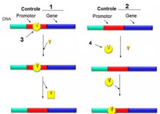 O operon lac pode ser considerado um modelo didático para entendermos melhor os controles negativo e positivo da regulação gênica em procariotos. Baseado em sua regulação, analise as seguintes afirmações: I O operon lac foi proposto por François Jacob e Jacques Monod em experimento relacionado ao metabolismo de lactose em bactéria E. coli. II A metabolização da lactose depende da ação de três enzimas provenientes da expressão de três genes distintos do operon lac: a ß-galactosidase, a lactose-permease e a transacetilase. III Por codificar três diferentes proteínas, o operon lac pode ser considerado um operon poligênico. IV A principal função da enzima lactose-permease é clivar a lactose em glicose e galactose. É VERDADEIRO o que se afirma em Resposta Selecionada: b. I, II e III, apenas. Pergunta 2 0,15 em 0,15 pontos Como sabemos, vários tipos de sinais podem interferir na transcrição gênica em eucariotos. Assim, a sinalização hormonal é realizada através da ação de hormônios esteroides ou poliptídeos. Considerando a sinalização hormonal, assinale a alternativa INCORRETA: Resposta Selecionada: e. O processo de entrada de hormônios de cadeia longa – polipeptídios – na célula de eucariotos apenas é possível devido às suas características lipossolúveis. Pergunta 3 0,15 em 0,15 pontos De acordo com o seu conhecimento sobre o controle da transcrição em procariotos, assinale a alternativa contendo os nomes das estruturas equivalentes aos números representados na seguinte Figura: Resposta Selecionada: d. (1) negativo, (2) positivo, (3) proteína repressora, (4) proteína ativadora. Pergunta 4 0,15 em 0,15 pontos Em situação de ausência de _______________ no meio, o _______________ é inibido através da ligação do repressor lac ao operador primário (O1) e a um dos dois operadores secundários (O2 ou O3). Essas ligações alteram a conformação estrutural do DNA, originando uma estrutura em forma de alça que omite a região _______________, impedindo a ação da _______________ e, consequentemente, bloqueando o início da transcrição. Assinale a alternativa que preenche CORRETA e RESPECTIVAMENTE as lacunas da afirmação acima. Resposta Selecionada: b. lactose; operon lac; promotora; RNAP.