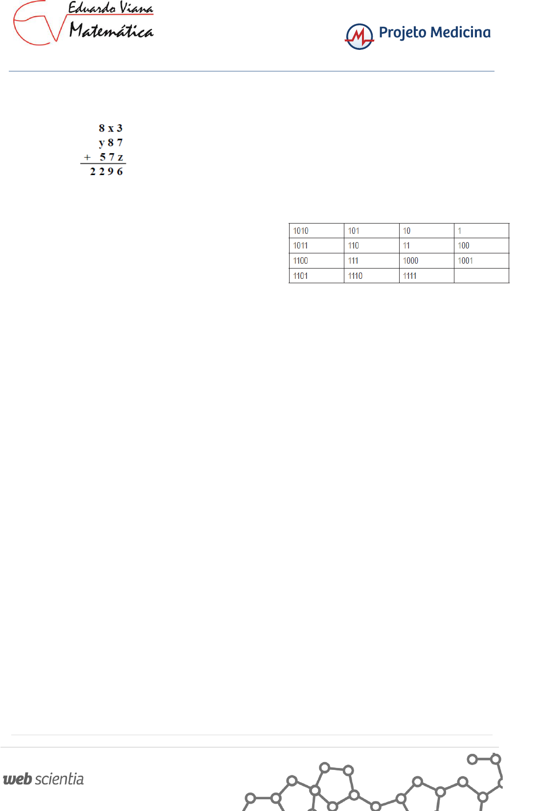 www.facebook.com/matematicacomeduardoviana 1 01.(UFPE) A tabela ao lado ilustra uma operação correta de adição, onde as parcelas e a soma estão expressas no sistema de numeração decimal e x, y e z são dígitos entre 0 e 9. Quanto vale x + y + z? A) 17 B) 18 C) 19 D) 20 E) 2 02. (UFPE) Considere um número com três dígitos, abc, representado no sistema de numeração decimal e com a > c e c ≠ 0. Faça a diferença entre abc e o número obtido de abc permutando os dígitos a e c. Em seguida, permute o dígito das unidades com o das centenas da diferença e adicione o valor encontrado à diferença. Qual o valor da soma? a) 1089 b) 1098 c) 1890 d) 1809 e) 1980 03. (EEAR) Determinar o número de algarismos necessários para escrever os números ímpares de 5 a 175 inclusivos. a) 114 b) 124 c) 125 d) 207 04. (FUVEST) Um estudante terminou um trabalho que tinha n páginas. Para numerar todas essas páginas, iniciando com a página 1, ele escreveu 270 algarismos. Então o valor de n é: a) 99 b) 112 c) 126 d) 148 e) 270 05. (PUC) Um número primo e positivo é formado por 2 algarismos não nulos. Se, entre esses algarismos, colocarmos um zero, o número ficará aumentado em 360 unidades. Dessa forma, a soma desses dois algarismos pode ser: a) 8 b) 7 c) 6 d) 9 e) 10 06.(UFPE) Sobre o natural 230 -1 é incorreto afirmar que ele é: A) divisível por 2 15 - 1 B) divisível por 2 20 + 2 10 + 1 C) divisível por 2 15 + 1 D) divisível por 2 10 - 1 E) um número primo 07.(CEFET-RJ) A tabela a seguir está escrita no sistema binário. Determine o único elemento que satisfaça a sequência. a) 10000 b) 10001 c) 10010 d) 10011 e) 10100 08.(UFPE) Qualquer número de 4 dígitos, em que os dígitos das unidades é igual ao das centenas, e o dígito das dezenas é igual ao dos milhares, é divisível por: a) 83 b) 87 c) 89 d) 97 e) 101 09.(FUVEST) Um número natural N tem três algarismos. Quando dele subtrairmos 396 resulta o número que é obtido invertendo-se a ordem dos algarismos de N. Se, além disso, a soma do algarismo das centenas e do algarismo das unidades de N é igual a 8, então o algarismo das centenas de N é? a) 4 b) 5 c) 6 d) 7 e) 8 10.(UFPE) No sistema binário, o numeral 1011 representa o número cuja expressão decimal é a) 12 b) 8 c) 10 d) 11 e) 9 www.facebook.com/matematicacomeduardoviana 2 GABARITOS 1-B 2-A 3-D 4-C 5-B 6-E 7-A 8-E 9-C 10-D